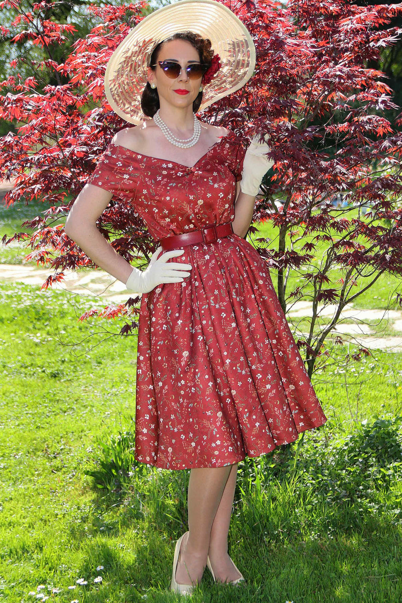 Complete your look with some playful vintage-inspired accessories. Pair this dress with a cute straw hat, retro cat-eye sunglasses, and a pair of red heels for a look that screams confidence and sass. Add a statement necklace and a bold red lip for extra glamour. You'll feel like the ultimate style icon in our Lily Red Off Shoulder Dainty Floral Print Dress.
