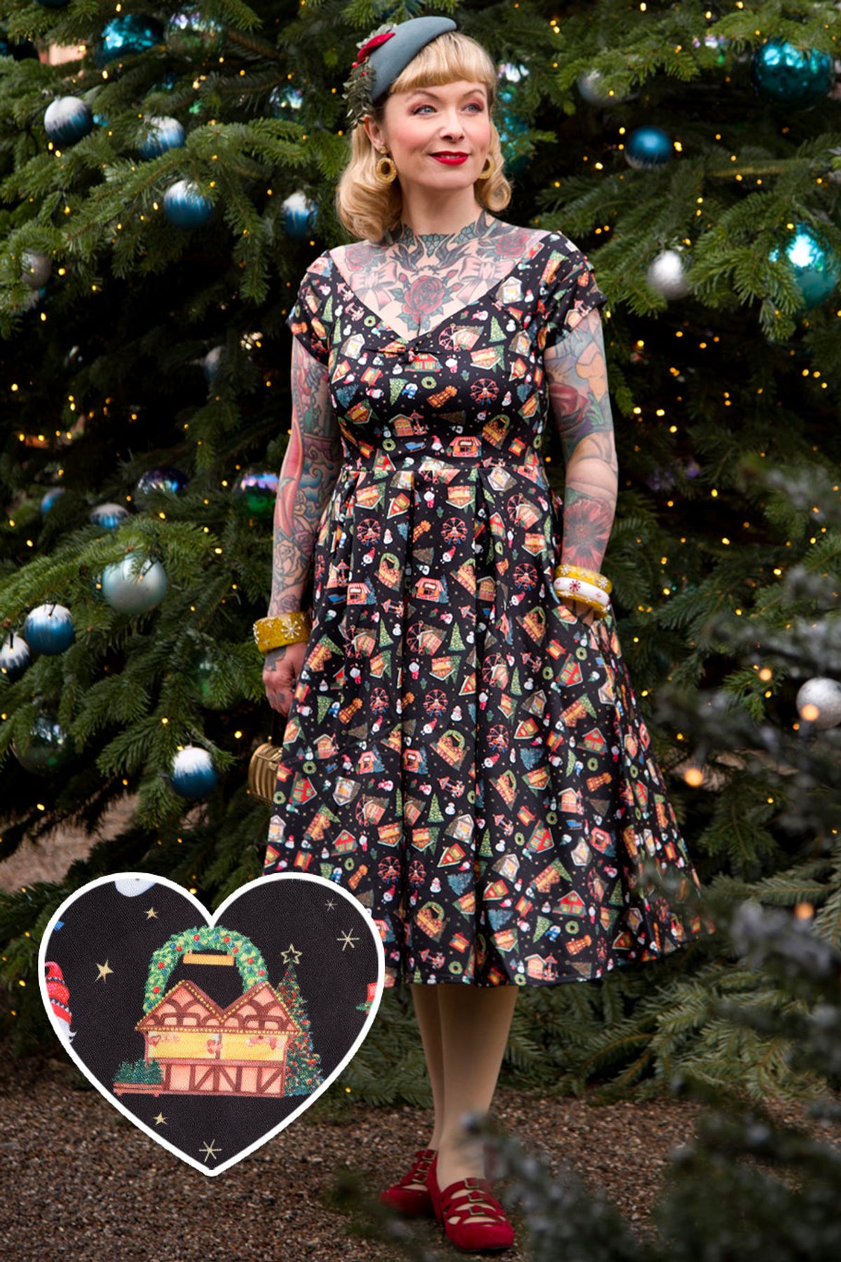 A festive print of colourful Christmas scenes adorns this classic black masterpiece, adding a dash of charm to your festive wardrobe. The fitted bodice and full circle skirt let you twirl in style, while the pleated short sleeves add a vintage flair. Oh, did we mention the pockets? Yes, darling, it has pockets! 👗👛