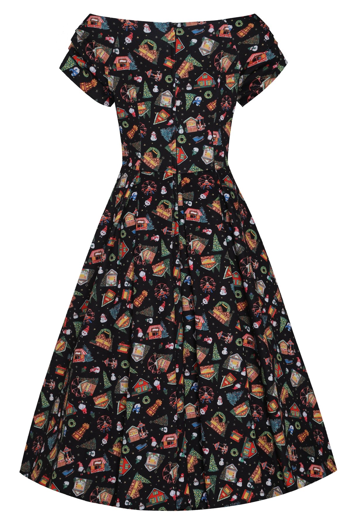 Lily Retro Off Shoulder in Black Christmas Fair Swing Dress