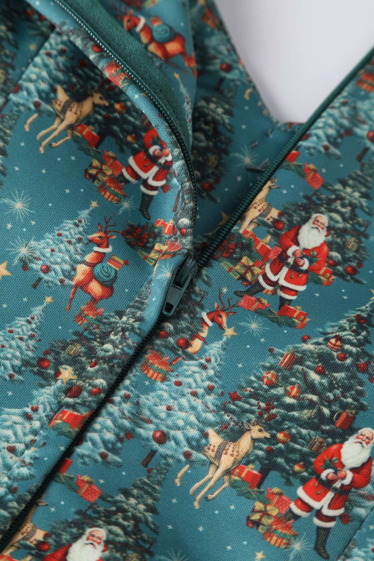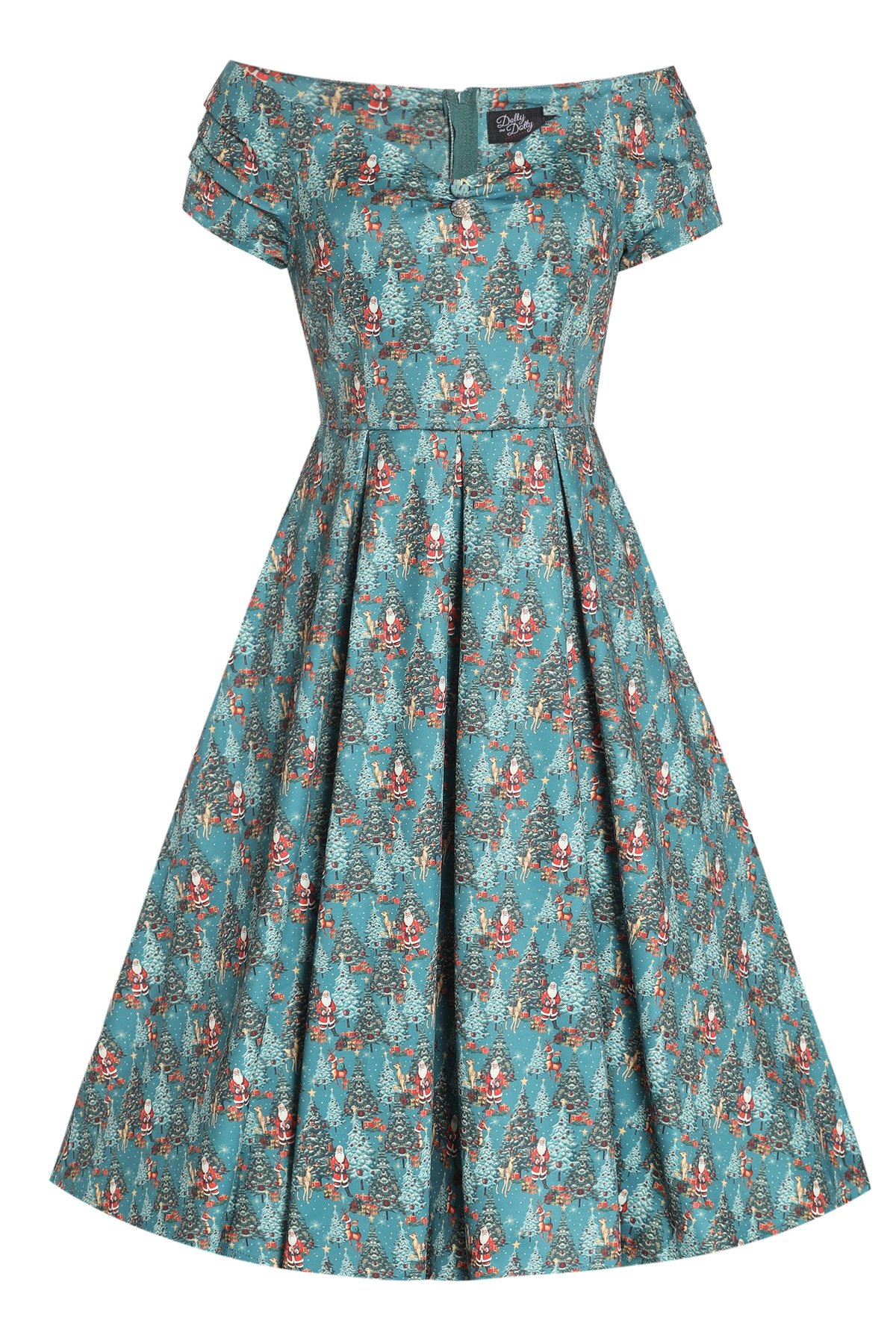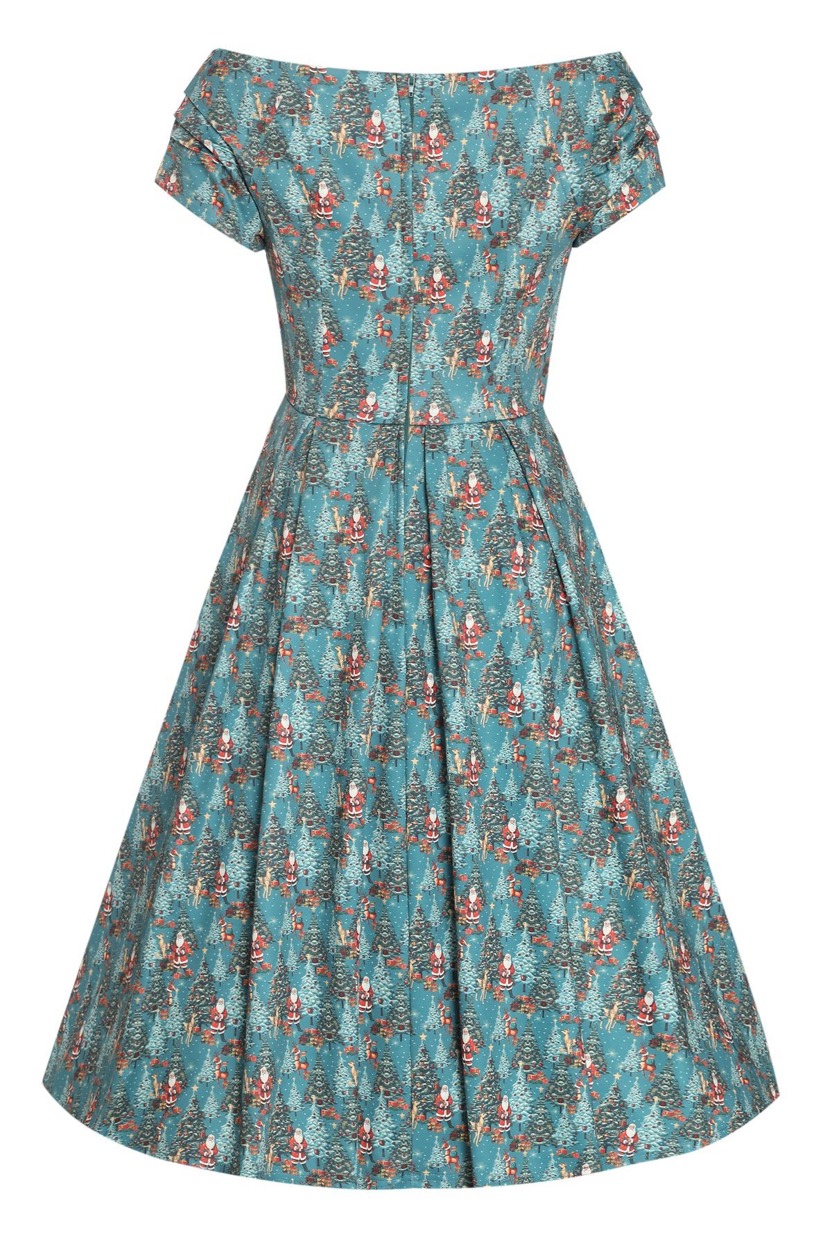 Introducing the Lily Teal Off Shoulder Santa Claus Print Christmas Dress—a holiday showstopper that’s as playful as it is chic. With its vibrant teal hue, cheeky Santa and Christmas tree prints, and a flirtatious off-shoulder silhouette, this dress effortlessly blends vintage charm with modern allure. The gathered bust with adorable button details harks back to a glamorous era, while the fitted waist and twirling pleated skirt promise a 'claws-down gorgeous' look for every festive occasion. Crafted from a soft, stretchy fabric, it’s designed to keep you comfy as you spread holiday cheer, whether you’re out shopping or celebrating with loved ones.