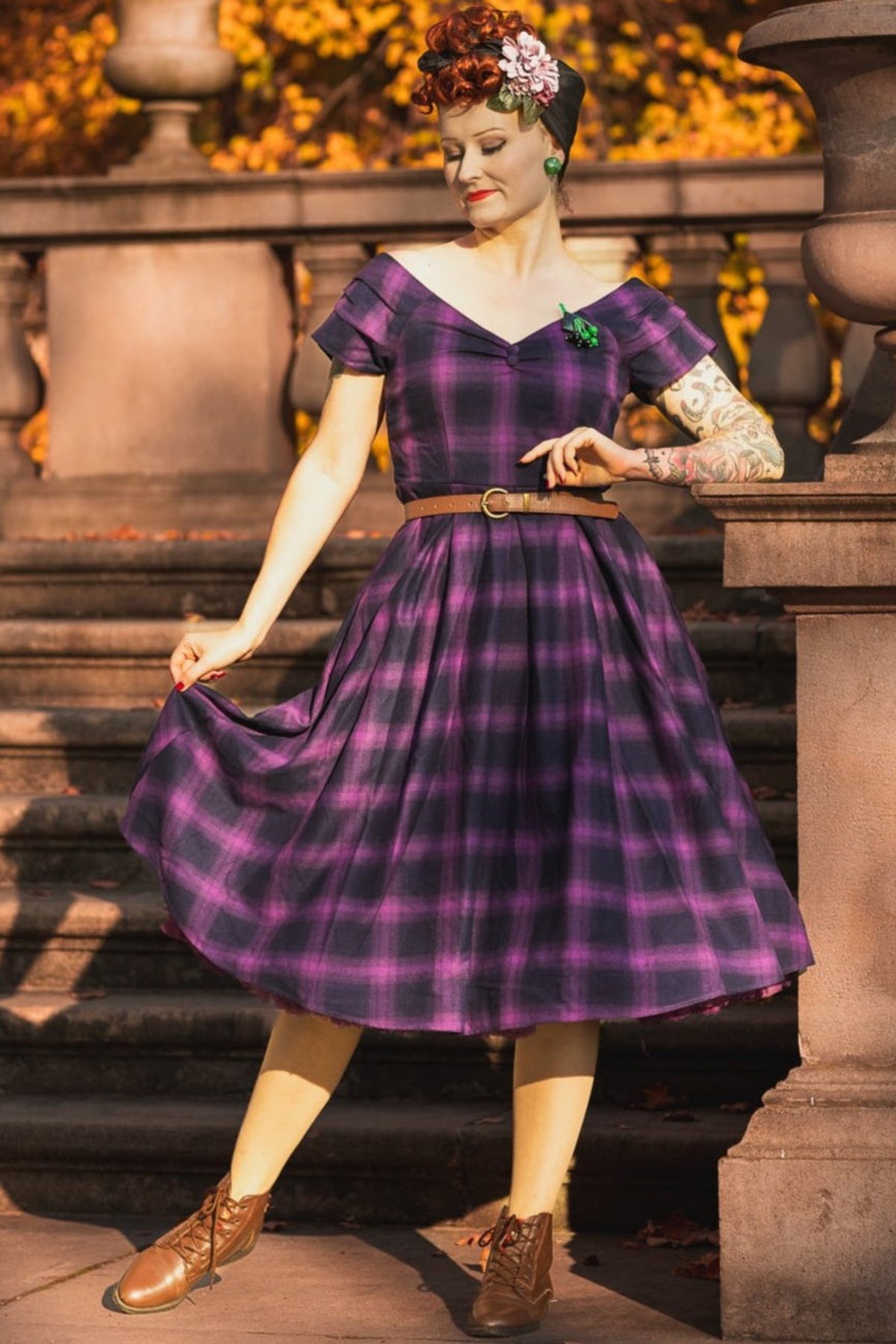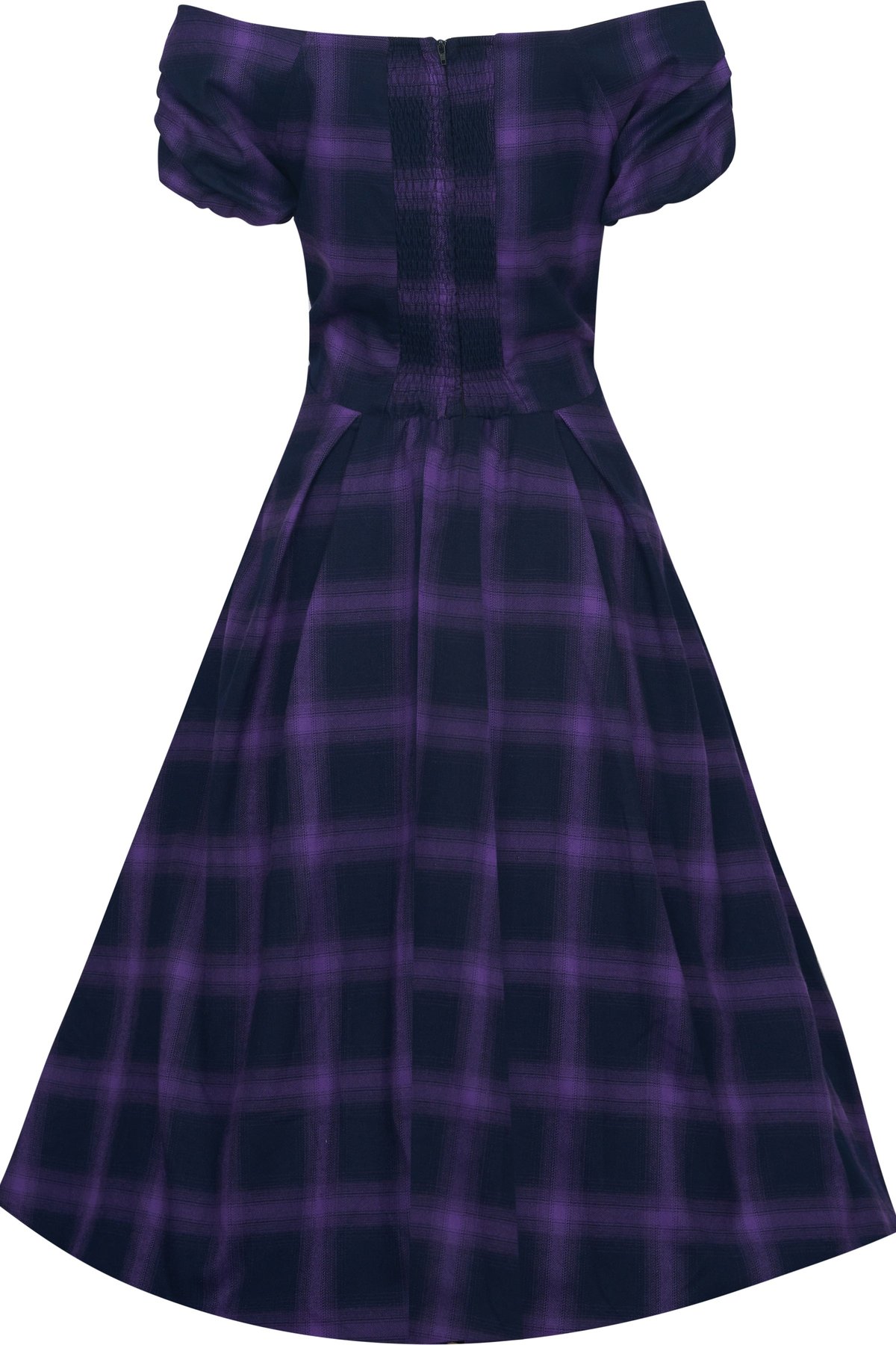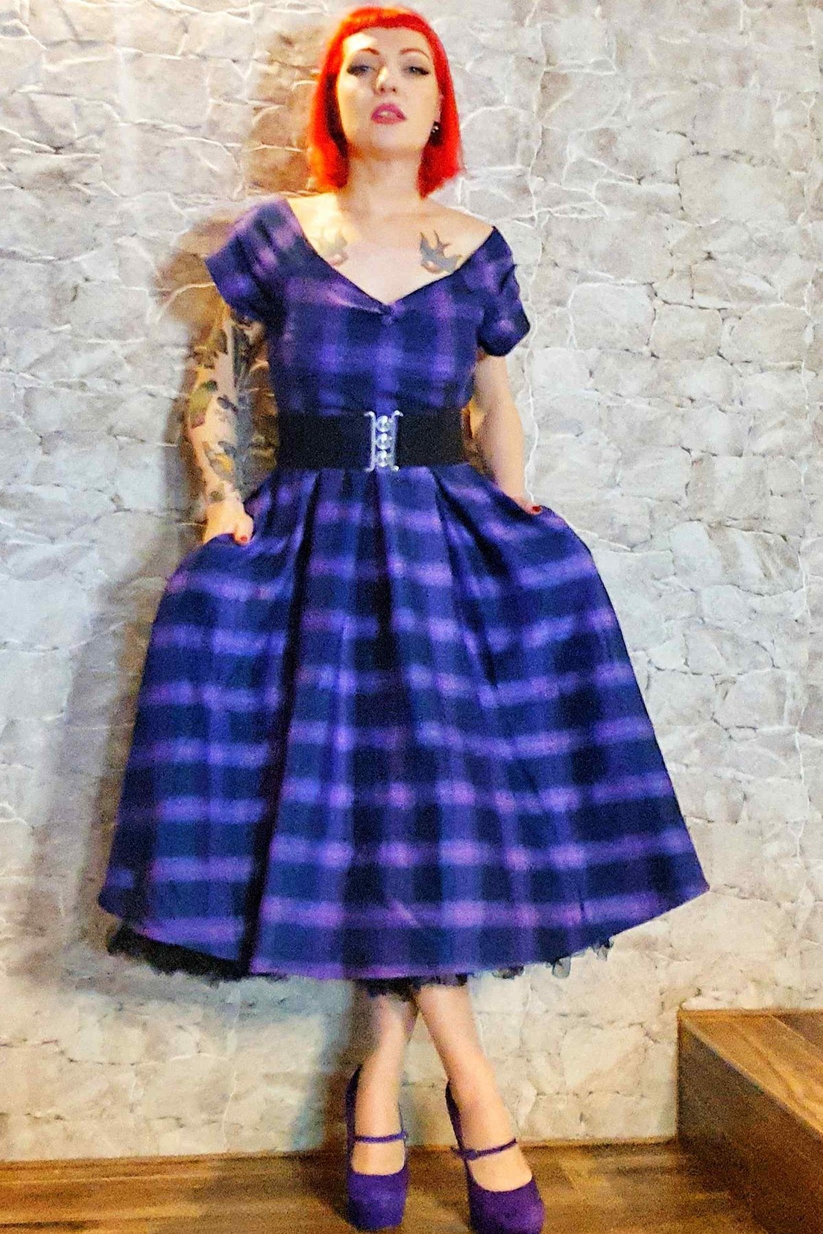 Unleash your inner vintage vixen with this tartan darling that’s as chic as it is playful. The rich purple hue and classic black accents make this off-shoulder dress a true purrfect choice for those who love a splash of retro glamour with a modern twist. The gathered bust and button detail add just the right touch of vintage glam, while the fitted waist flatters every curve. With hidden pockets to keep your essentials handy and a flared pleated skirt that begs to be swooshed, you'll be the star of every occasion—no claws needed to turn heads!