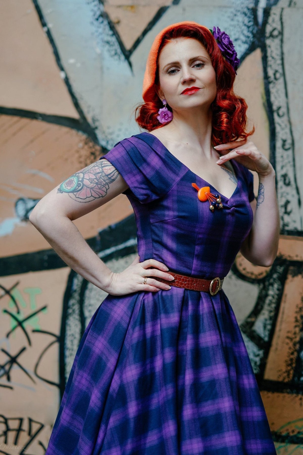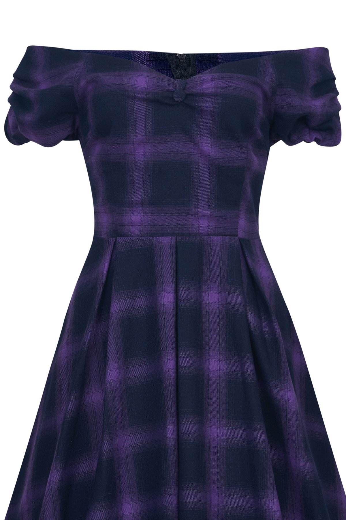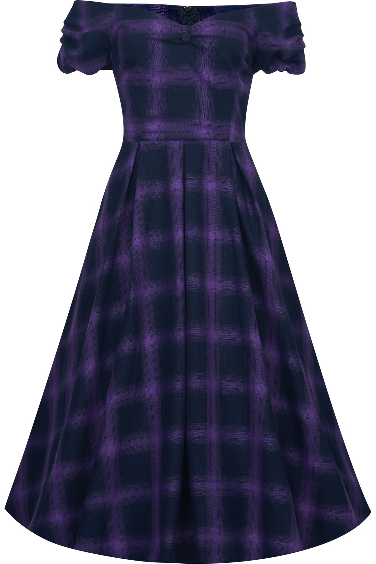 Unleash your inner vintage vixen with this tartan darling that’s as chic as it is playful. The rich purple hue and classic black accents make this off-shoulder dress a true purrfect choice for those who love a splash of retro glamour with a modern twist. The gathered bust and button detail add just the right touch of vintage glam, while the fitted waist flatters every curve. With hidden pockets to keep your essentials handy and a flared pleated skirt that begs to be swooshed, you'll be the star of every occasion—no claws needed to turn heads!