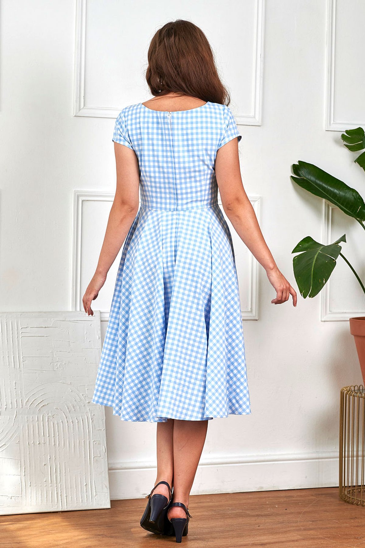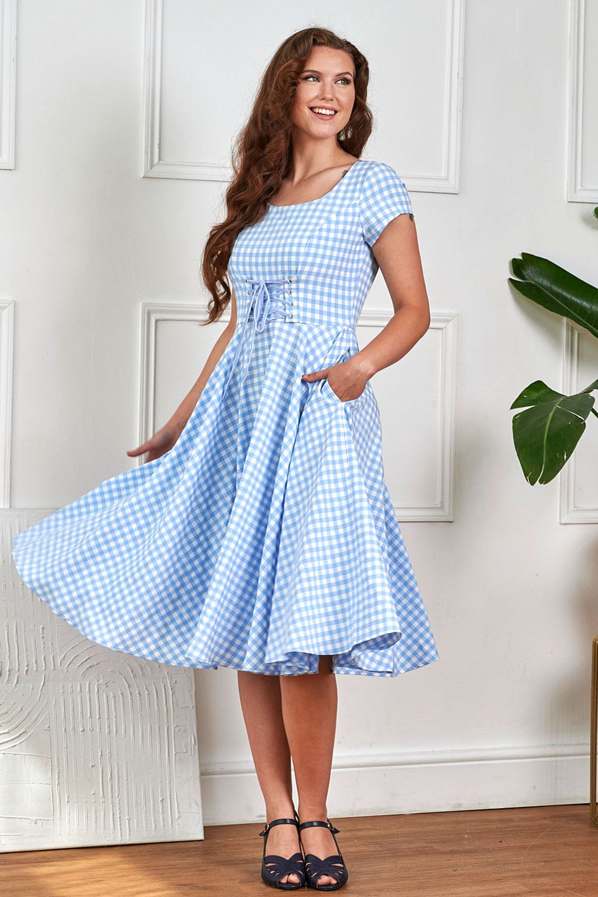 La dolce vita is back with this classic gingham swing dress perfect for the summer ahead! Lola dress features half sleeves, wide neckline and adjustable corset straps on front bodice. It has full circle swing skirt gathered at waist, falling under the knee offering beauty and comfort at the same time.It fastens at the back!