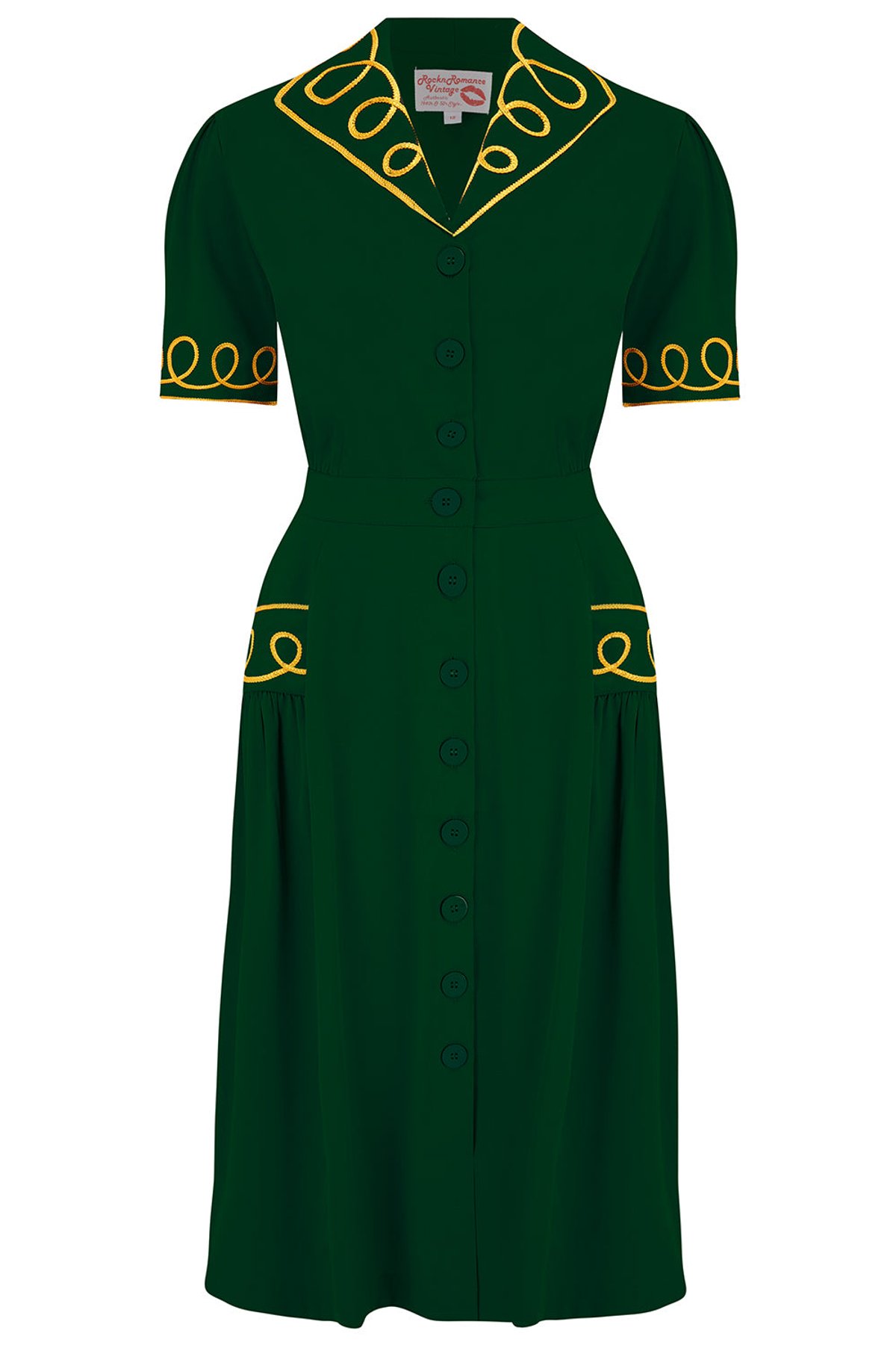 Unleash your inner vintage vixen with the Loopy-Lou Shirtwaister Dress — a purrfect blend of retro allure and modern ease. Its vibrant green hue and shimmering gold ricrac details make every step feel like a stroll down a glamorous past. The classic shirtwaist silhouette, accented by a flexible elasticated waist, ensures you’ll stay comfortable while turning heads. Crafted from luxurious poly crepe, it drapes beautifully, giving you that effortlessly chic vibe that’s simply irresistible. Whether you're feeling playful or poised, this dress lets you channel timeless elegance with a dash of mischief. A true showstopper, it’s designed to make you feel fabulous from the first twirl to the last glance in the mirror. Embrace the vintage spirit and let your style speak volumes — modern, yet unmistakably nostalgic, all wrapped up in one gorgeous package.