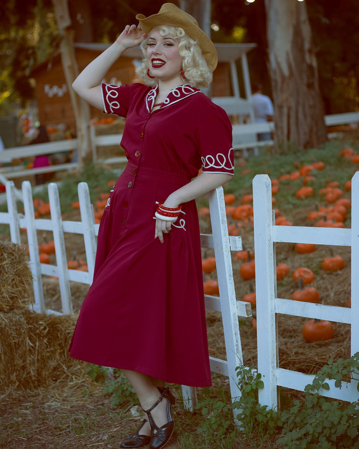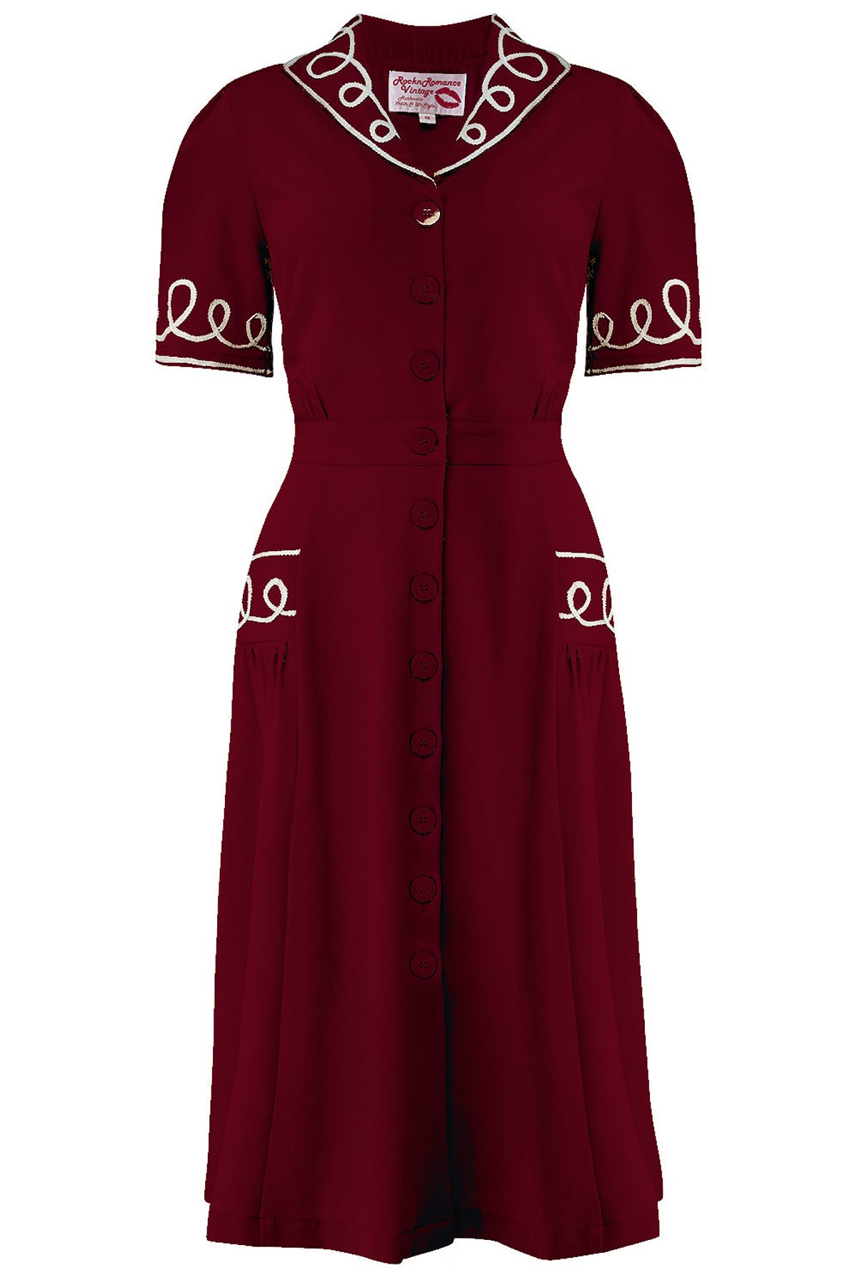 Step into timeless elegance with The Loopy-Lou Shirtwaister Dress, a true vintage jewel that radiates charm and sophistication. The deep wine hue is beautifully complemented by crisp white RicRac detailing, giving it that "purrfect" balance of retro flair and modern polish. With its graceful silhouette, elasticated waist, and flowing poly crepe fabric, this dress is designed to flatter your figure while making every move look effortlessly chic. Whether you're feeling playful or poised, it's the kind of piece that makes an instant statement without saying a word.