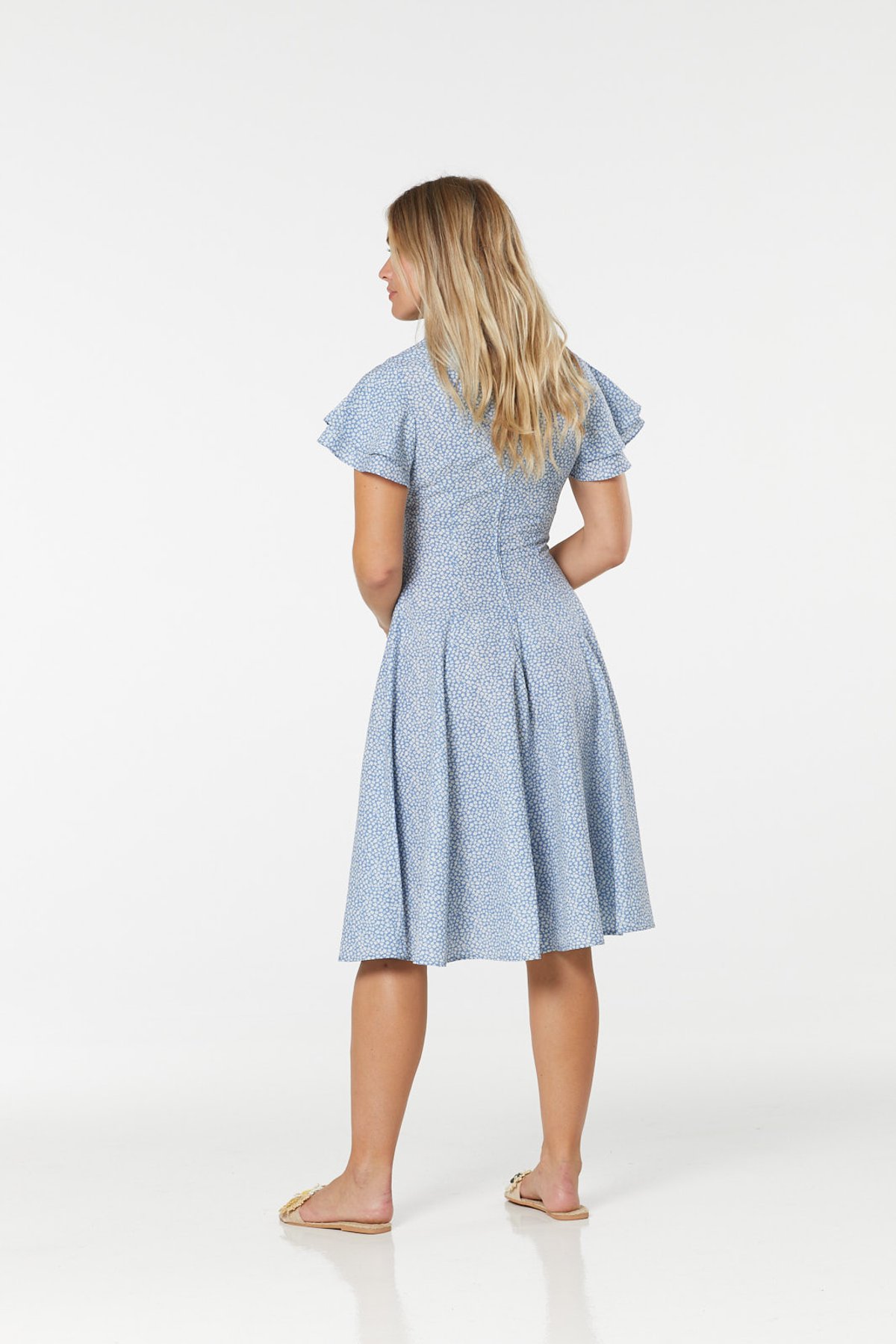 Unleash your inner vintage vixen with the Lydia Dress—where classic 50s charm gets a fresh, sustainable twist. Draped in a soft, sky-blue hue dotted with delicate white florals, this dress brings timeless elegance with a playful edge. The self-tie keyhole adds just a whisper of flirtation, while the tiered ruffle sleeves give a dash of divine detail. Perfectly tailored with a flattering waist and a swing skirt that swings with every step, it’s a purrfect blend of retro glamour and eco-conscious style. Whether you’re feeling daring or simply want to channel some timeless chic, this dress is your go-to for an effortlessly gorgeous look.