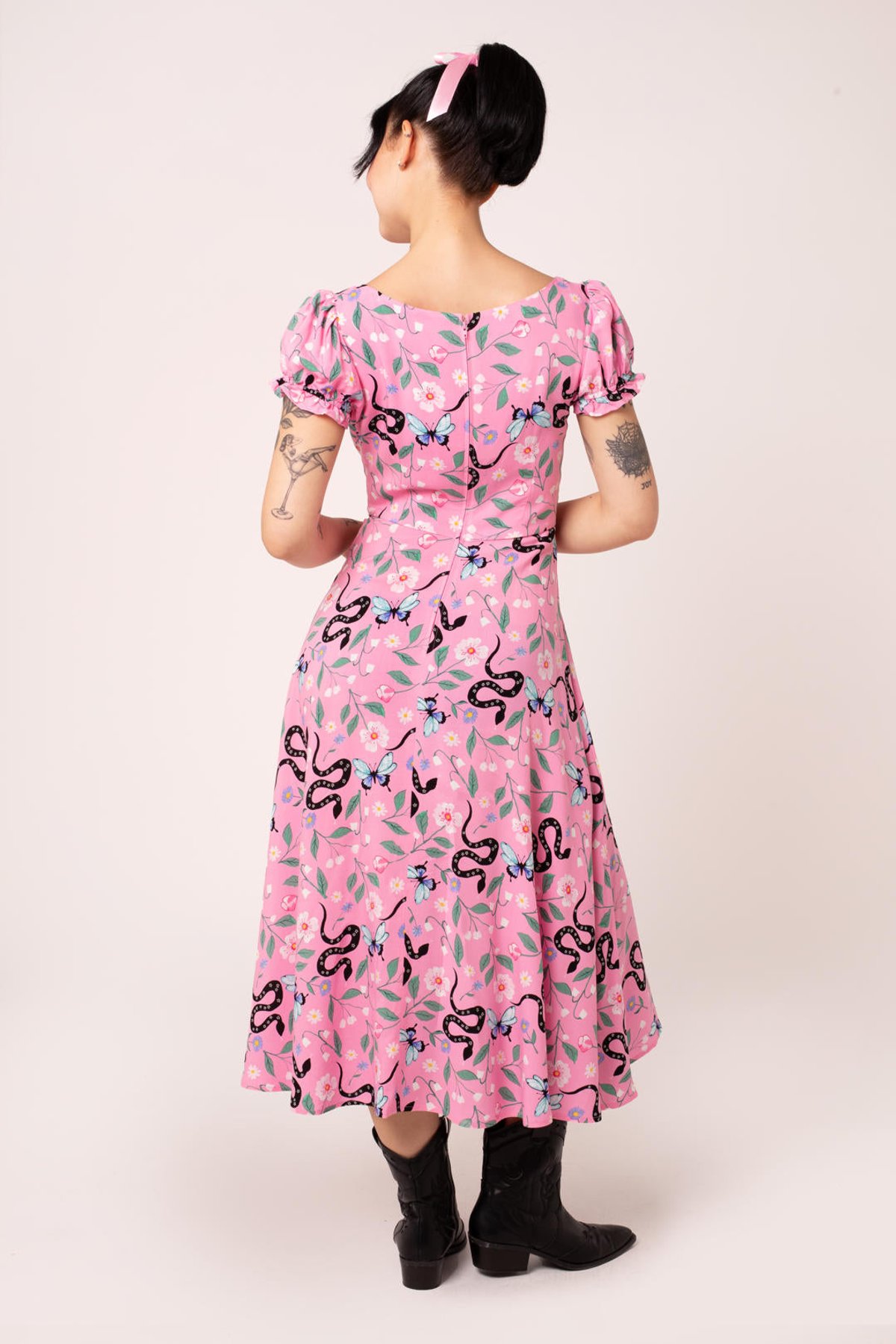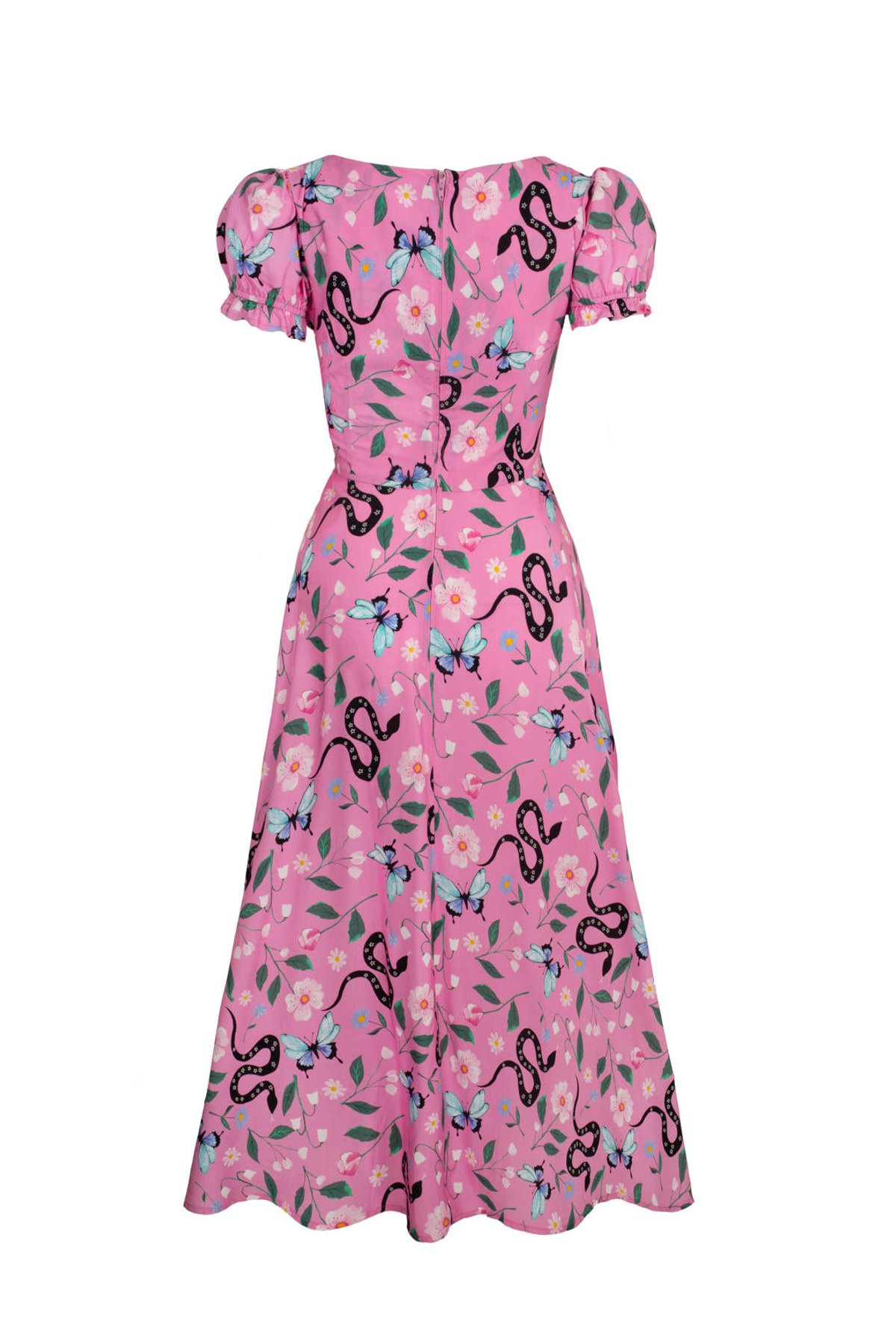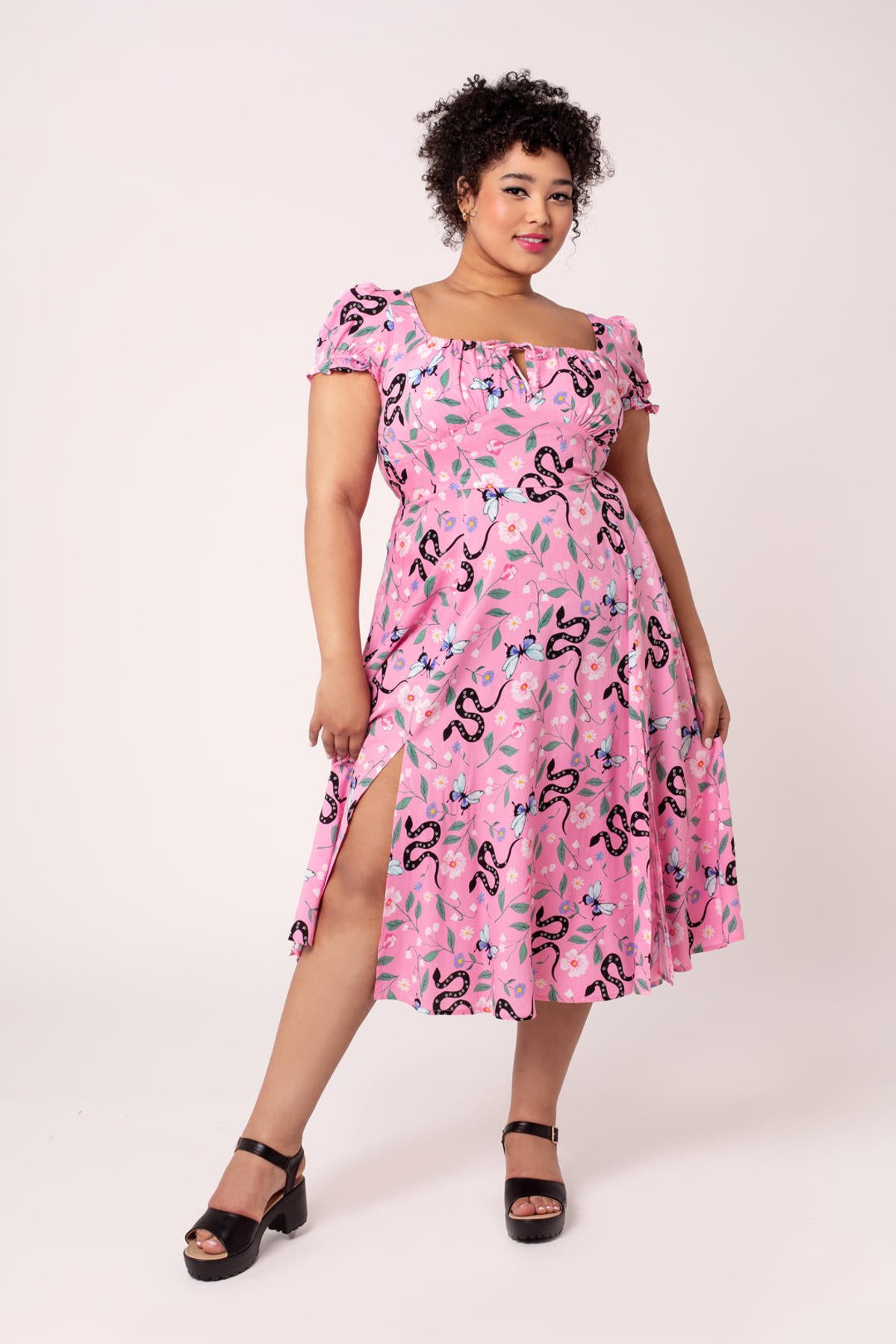 Unleash your free spirit with the Ma Boheme Midi Dress—a feline-inspired fusion of vintage charm and modern allure. This pink wonder features a flirty scoop neckline with a playful keyhole tie, complemented by delicate puff sleeves that whisper of nostalgia. The fitted silhouette flatteringly contours your curves, while the flowing skirt and sassy front slits invite you to twirl through life with irresistible grace. Crafted from soft, lightweight viscose, this dress is perfect for sunlit adventures or lazy weekend escapades. Whether you’re feeling wild with floral and snake motifs or simply craving a look that’s as playful as a kitten’s pounce, this dress has claws-down gorgeous appeal. Its versatile design makes it a true wardrobe staple for those who adore a touch of boho elegance sprinkled with a dash of mischief.