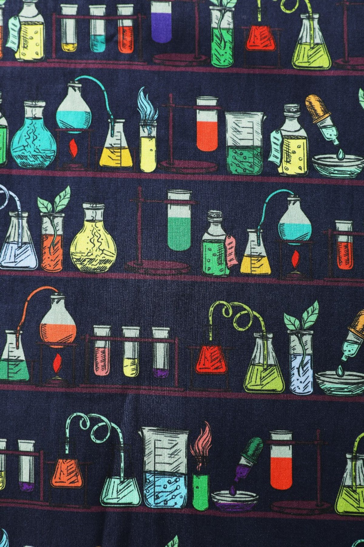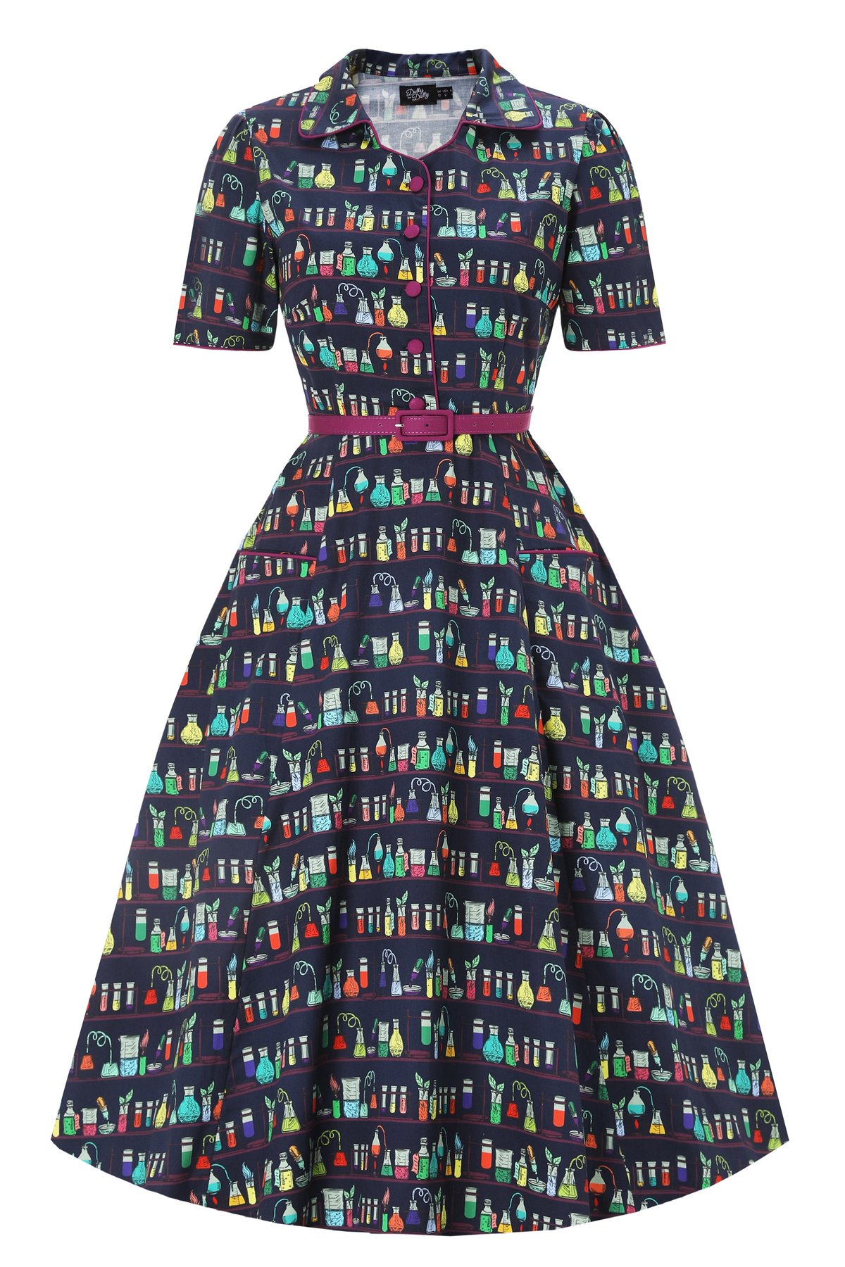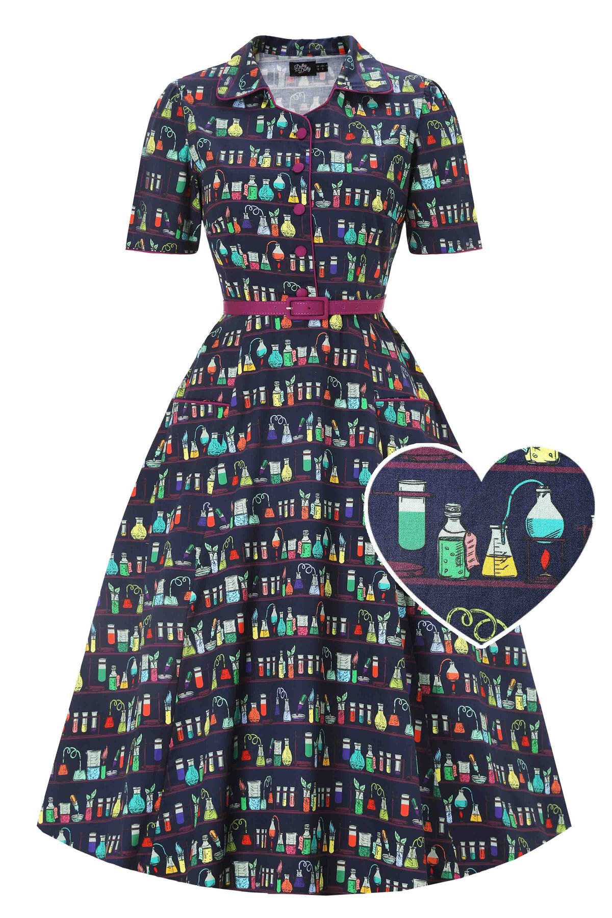 Unleash your inner retro genius with the Mabel Blue Science Midi Shirt Dress—where vintage charm meets a dash of playful science. The navy hue is punctuated by whimsical purple illustrations of beakers, test tubes, and all things lab-related, making this dress as clever as it looks. The classic collared neckline and button-down front lend a polished vibe, while the flared skirt invites you to twirl your way through any occasion. The matching belt cinches the waist for a silhouette that’s as smart as it is stylish, and those side pockets? Simply purrfect for stashing your secret treasures.