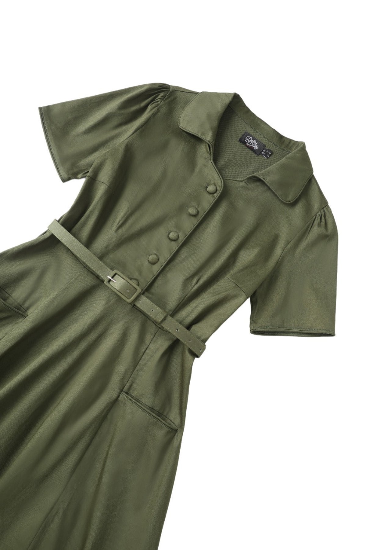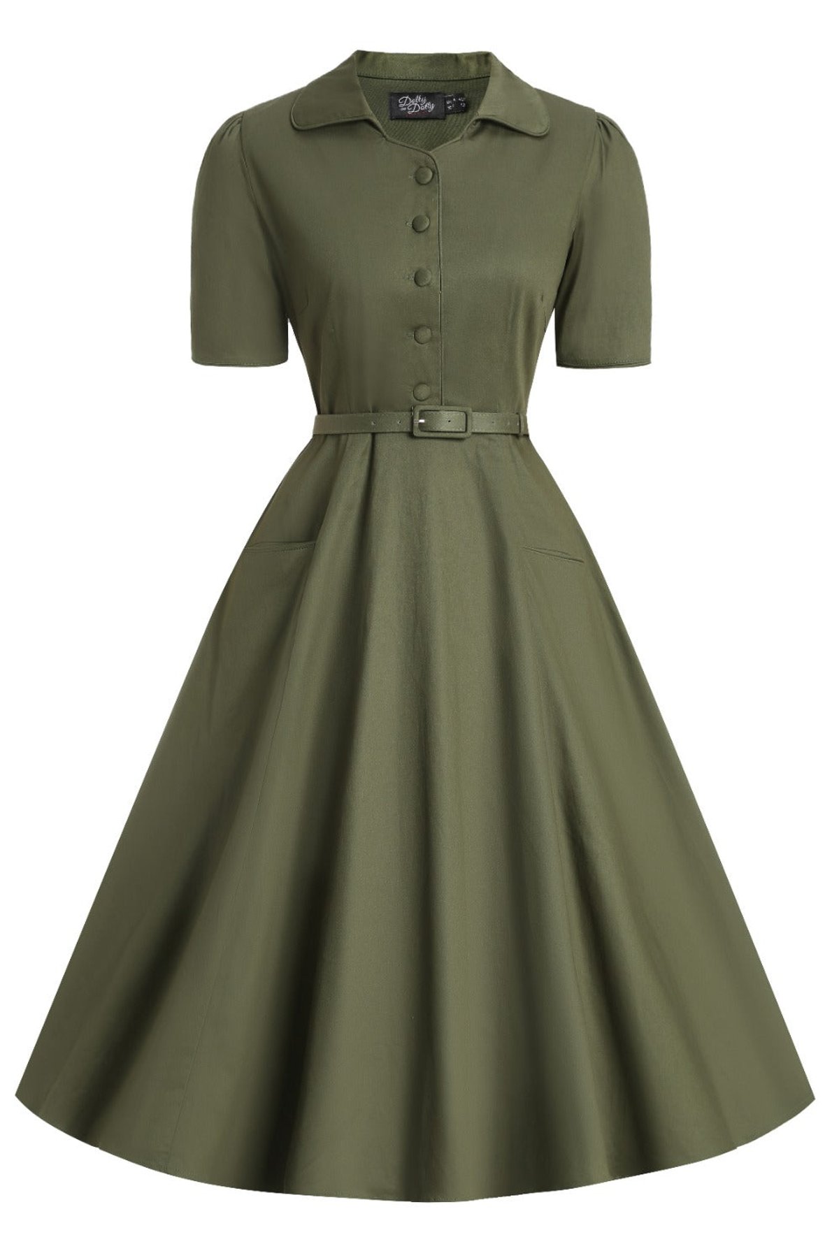 Unleash your inner vintage vixen with the Mabel Olive Green Shirt Dress—a purrfect blend of retro charm and modern sass. Its classic collared neckline and button-down bodice are timeless, while the matching belt and flared skirt add a playful, yet sophisticated touch. Crafted from a comfy cotton-elastane blend, this dress drapes effortlessly, hugging your curves in all the right places. Whether you’re feeling a bit rockabilly or just want to spice up your everyday wardrobe, this versatile piece is paws-down gorgeous and ready to turn heads. Think of it as your new go-to for a look that’s both polished and playful—like a feline with a flair for fashion.