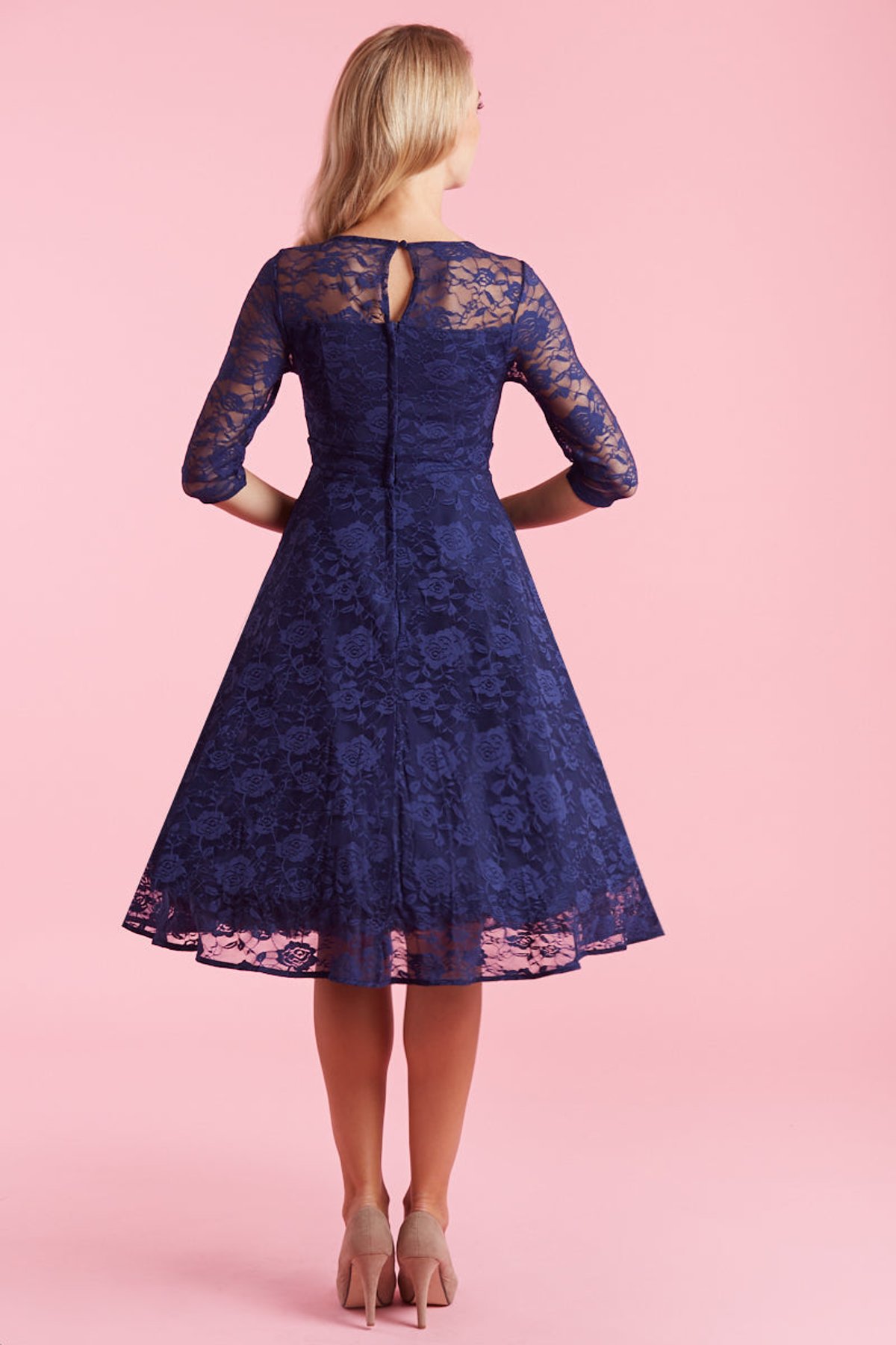 Be the belle of the ball with our Madeline Long Sleeved Navy Lace Dress 👗 A blend of sophistication and timeless charm, this navy floral lace dress radiates 1950s rockabilly elegance. The fitted bodice, round neckline, and graceful flared skirt create a silhouette that’s as classic as it is chic. 🌹
