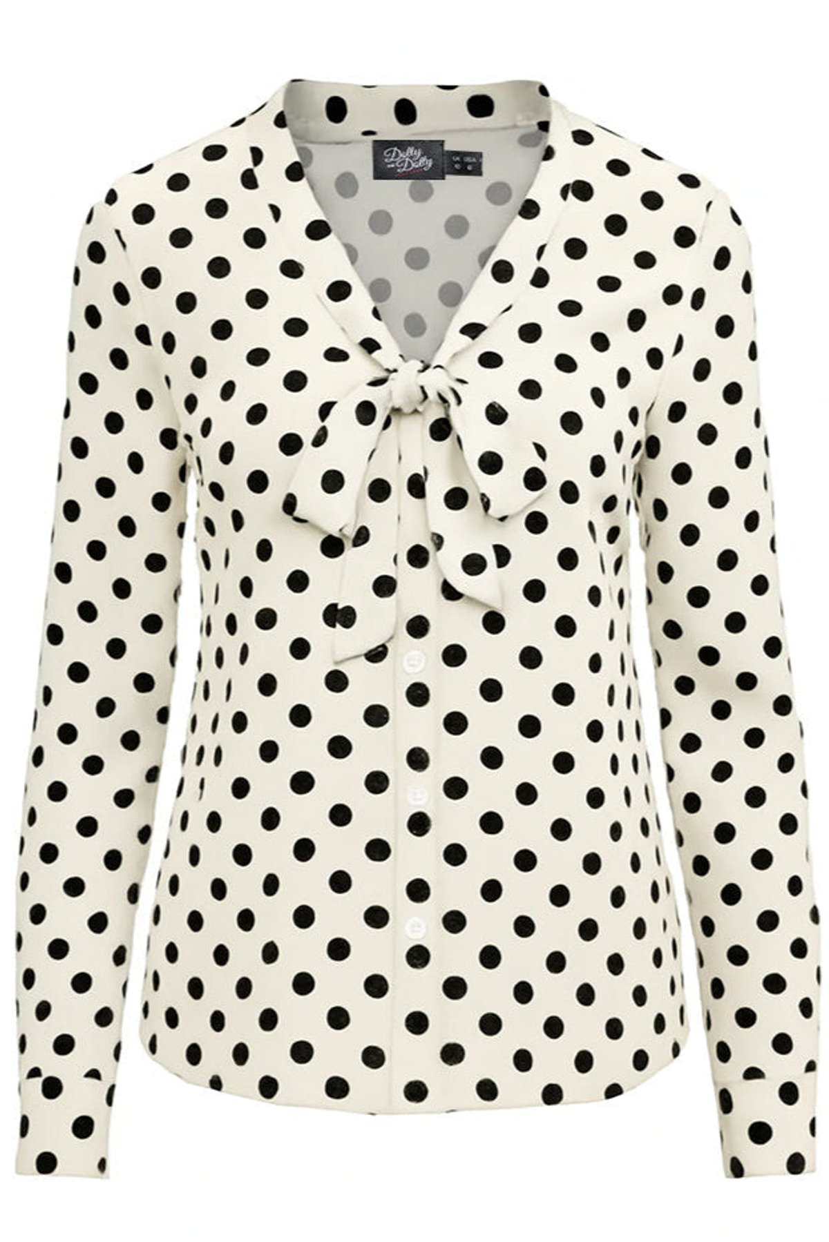 Introducing the Margaret Vintage White Polka Dot Long Sleeve Tie Blouse—a purrfect blend of retro charm and modern flair. Its crisp white canvas is playfully dotted with black spots, offering a timeless yet lively look. The charming bow-tie neckline adds a touch of femininity, while the tailored fit hugs in all the right places, making it a versatile staple for both daytime adventures and evening escapades. Crafted from soft, breathable viscose, this blouse feels as good as it looks, ensuring you stay chic and comfortable wherever your day takes you. Whether you’re channeling vintage glamour or mixing it up with contemporary pieces, this piece is a true wardrobe catnip.