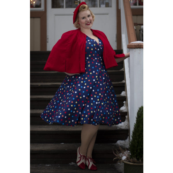 Crafted from a luxurious knit fabric, this dress promises both comfort and style, making it a must-have in any vintage lover’s wardrobe. The colourful polka dots pop against the classic navy backdrop, creating a look that’s both cheeky and charming. Whether you’re gliding down a city street or twirling on the dance floor, this dress moves with you, swaying to the rhythm of your day. It’s the perfect pick for any occasion that calls for a touch of vintage glamour.