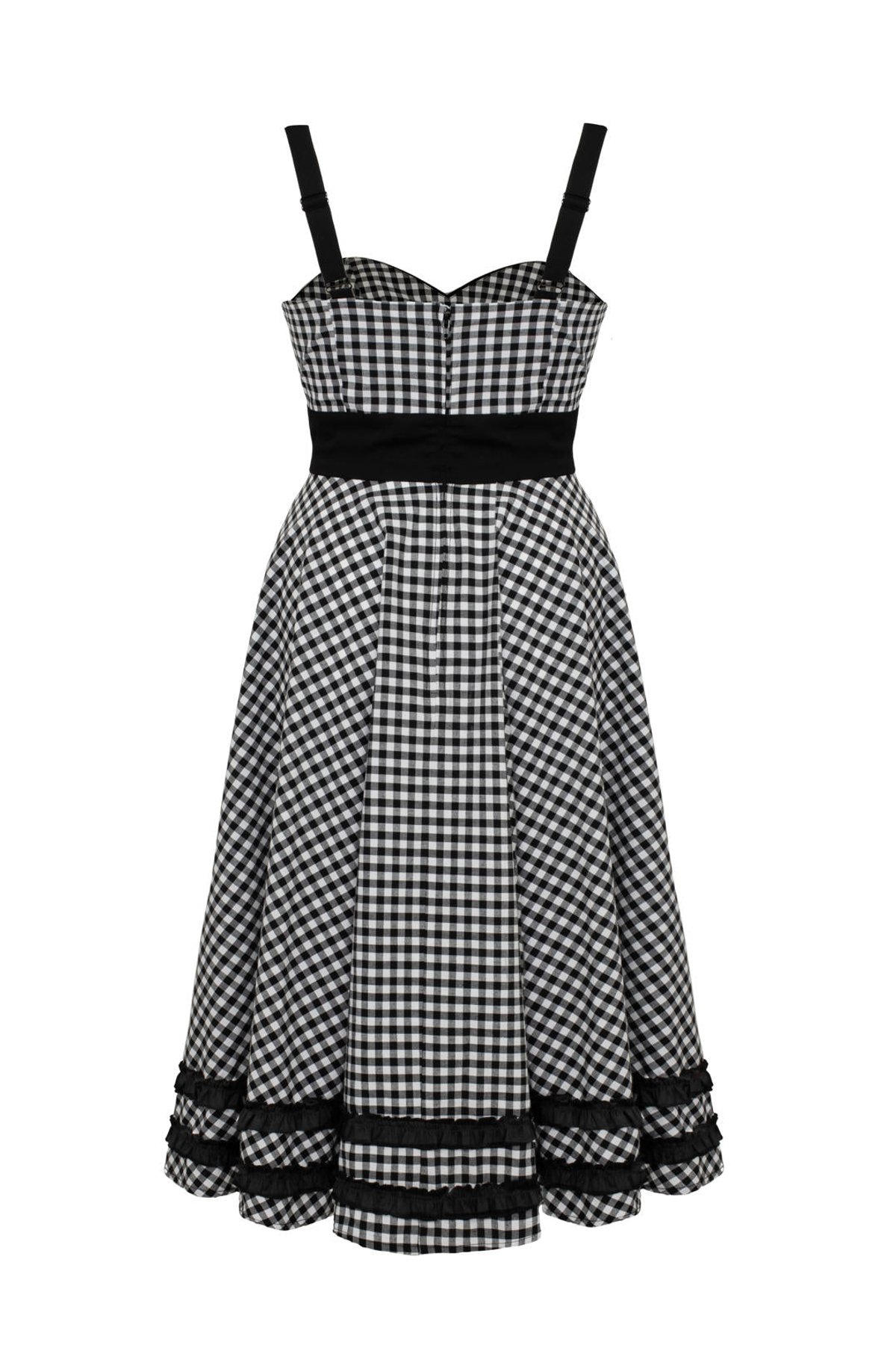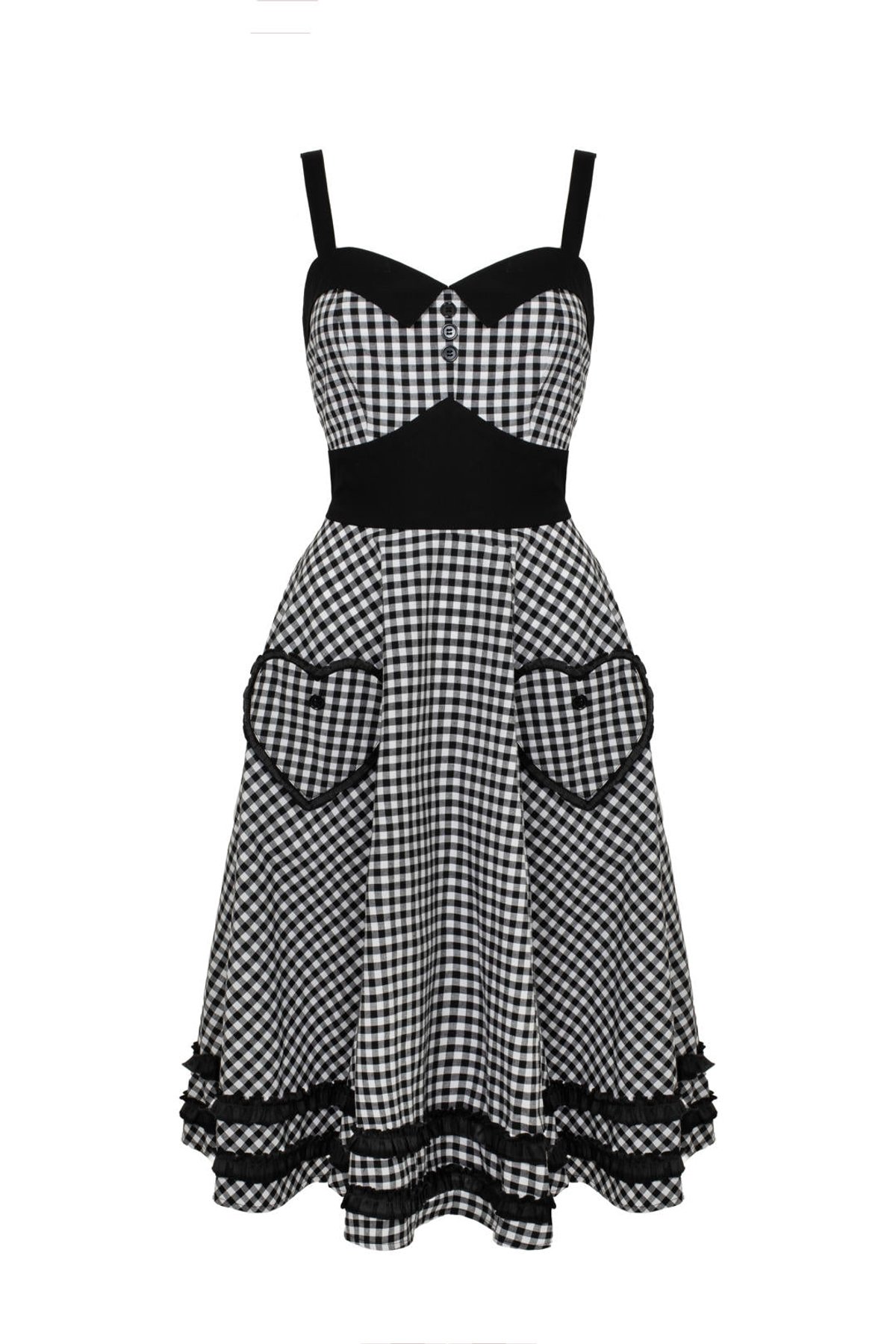 Unleash your inner vintage vixen with the Mel Dress—a true purrfect blend of playful charm and timeless style. The classic black and white gingham pattern is elevated by sweet details like a heart-pocket ruffle and a sleek black collar, making it a look that’s both adorable and undeniably chic. The fitted bodice and full circle skirt work their magic, giving you that retro, swing-ready silhouette that’s simply irresistible. Crafted from a comfy stretch cotton blend, this dress invites you to twirl, strut, or simply bask in the vintage glamour all day long.