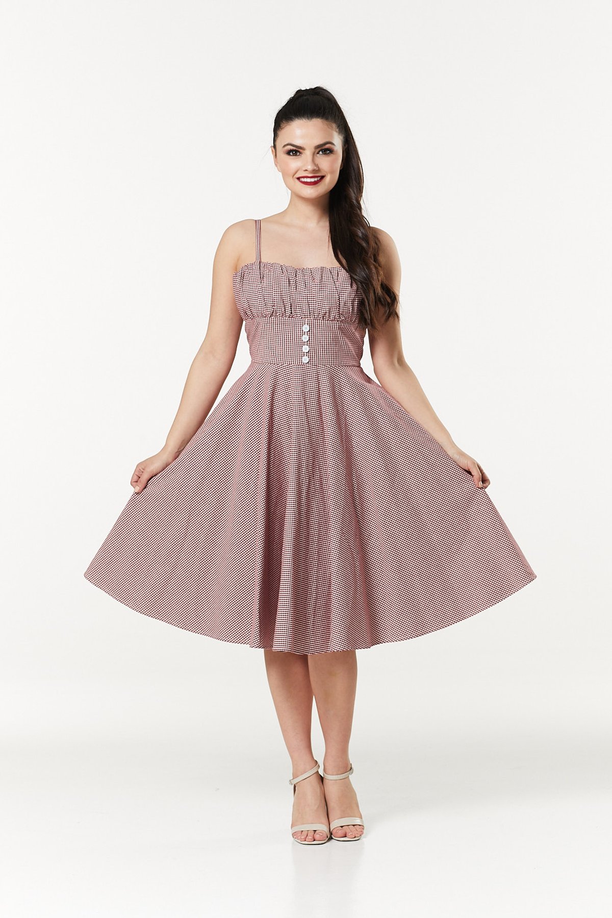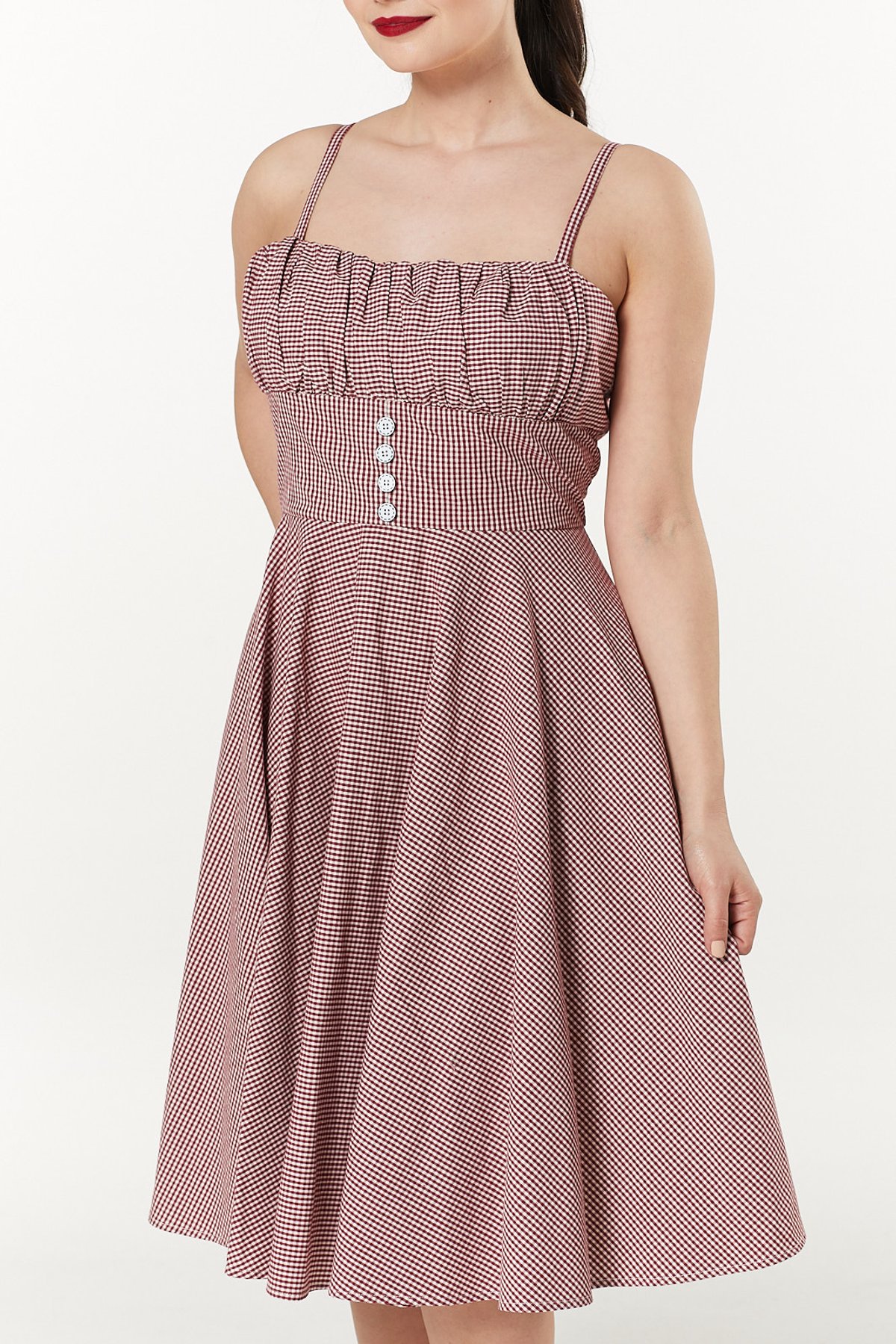 Unleash your inner vintage vixen with the Melissendre Red Dress—a purrfect blend of playful charm and timeless chic. Its charming 50s-inspired swing silhouette, adorned in a lively red and white gingham pattern, is designed to turn heads and paws-itively charm everyone you meet. The fitted bodice, with its gathered bust and sweet decorative buttons, offers a flattering fit that celebrates your curves, while the adjustable shoulder straps bring just the right touch of practicality. Made from a breezy cotton blend, this dress ensures you stay comfortable whether you're twirling on the dance floor or enjoying a sunny afternoon outdoors. Its full swing skirt invites you to add a petticoat for extra volume or keep it simple for a more laid-back, yet still fabulous, look. This vintage-inspired stunner is all about radiating confidence and playful sophistication—without ever taking itself too seriously.