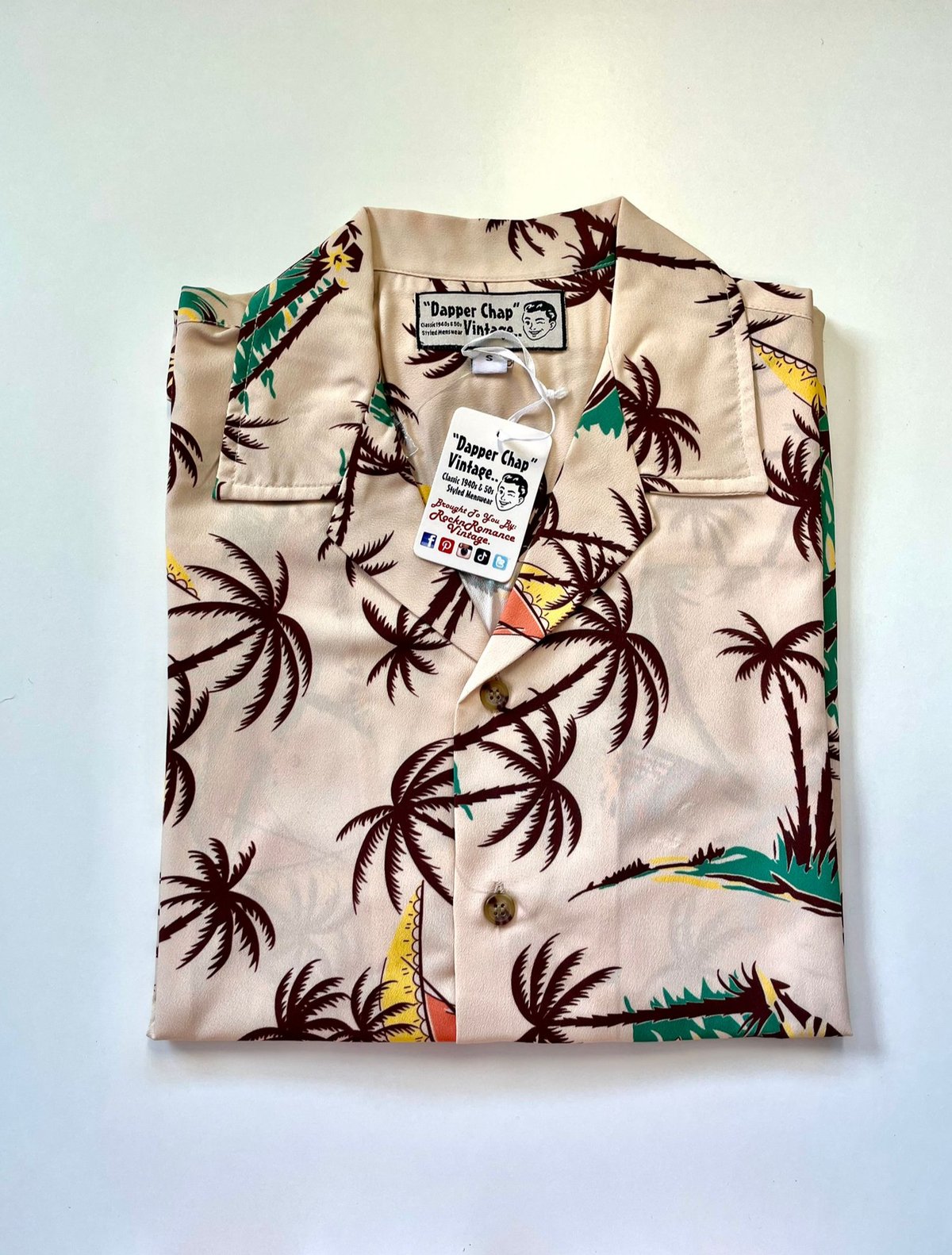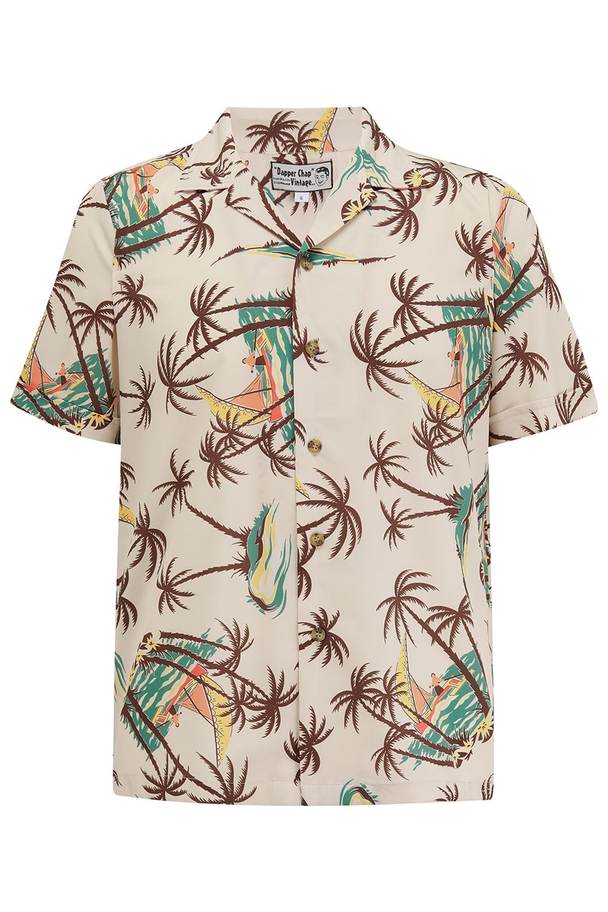🌴💼 Break out the retro vibes with our Men’s 1950s Hawaiian Shirt! This vintage-inspired piece is a ticket to a leisurely day, oozing charm straight from the golden era. With a revere collar and short sleeves, the shirt takes you sailing in a sea of beige and brown tropical palm trees and sailboats print 🌴🚢.