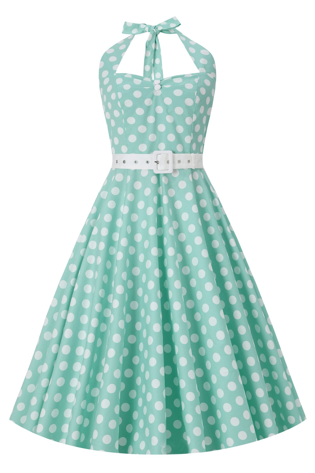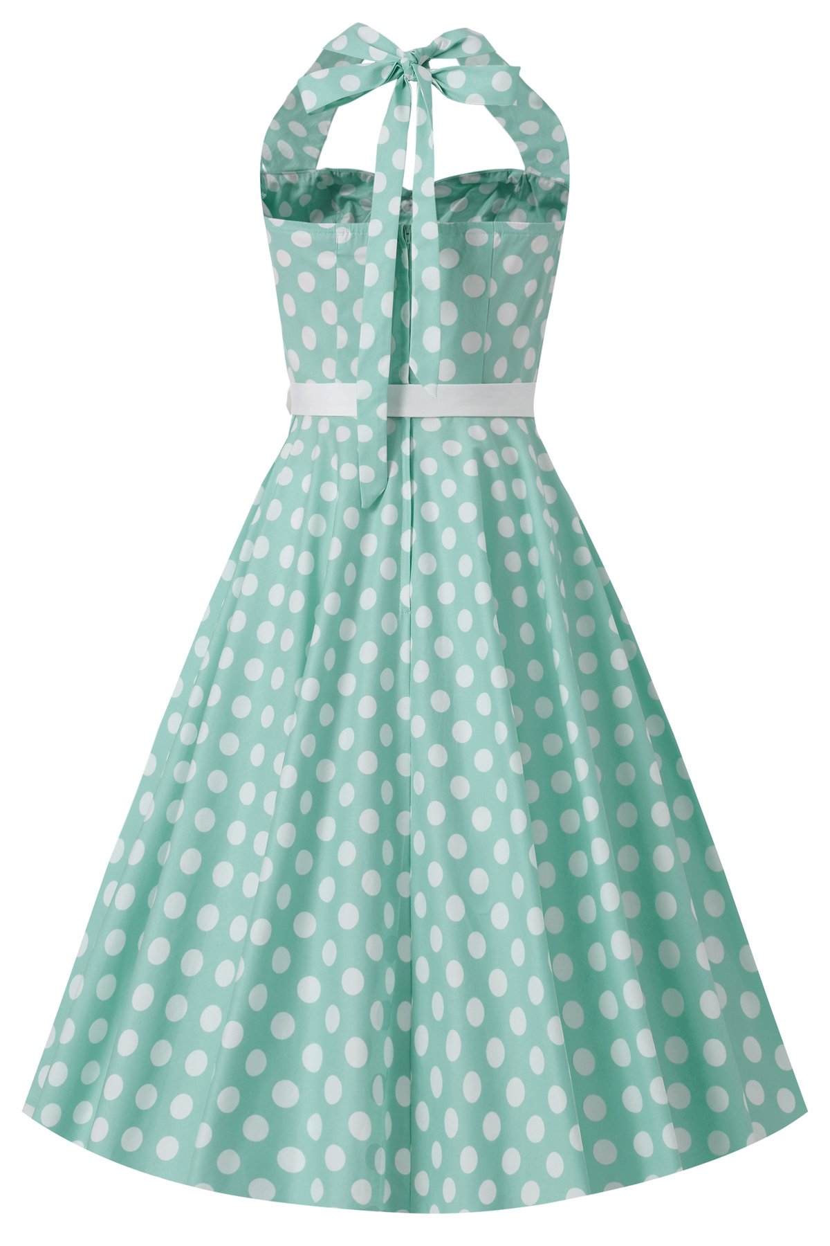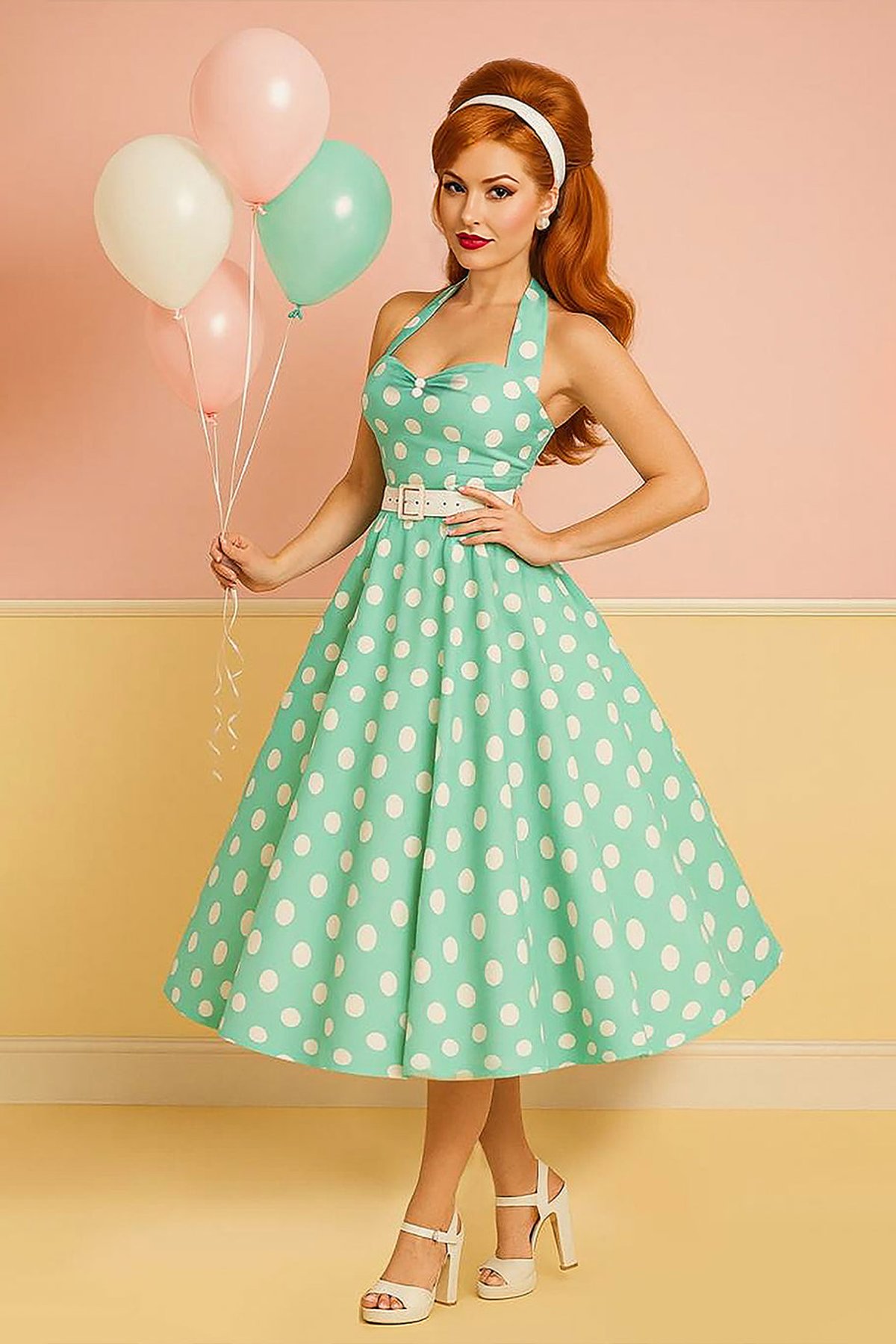 Unleash your inner vintage vixen with the Daisy Mint Green Polka Dot Halter Dress—a true purrfection in playful sophistication. With its charming sweetheart neckline and flirty necktie, this dress is a paws-itively delightful way to make a statement. The full circle skirt swishes with every step, turning heads and capturing hearts, while the mint green backdrop sprinkled with white polka dots adds just the right amount of retro charm. Crafted from a luxe cotton blend with a hint of stretch, it’s as comfortable as it is eye-catching—a wardrobe staple that’s both stylish and practical, thanks to those clever hidden side pockets.