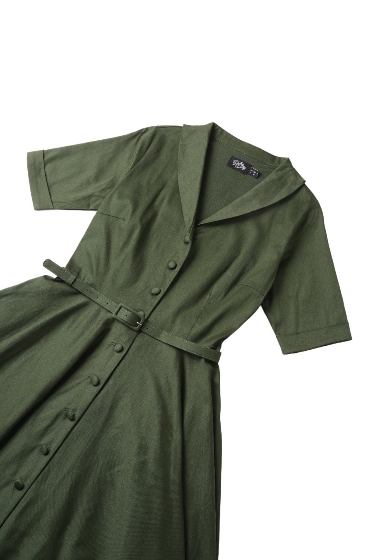 Unleash your inner vintage vixen with the Mollie Army Green Full Circle Shirt Dress—where timeless charm meets a sleek, modern silhouette. The flattering V-neckline and playful short sleeves give it a subtly flirtatious vibe, while the matching gingham belt tips the scales towards irresistibly chic. The soft pleated skirt sways with every step, making it a purrfect choice for those who love a dash of retro glamour with a contemporary twist. Crafted from a comfy cotton blend, this dress is as easy to wear as it is to love—ideal for effortless style that works from brunch to balcony soirées. Whether you're twirling through a vintage fair or simply craving a look that’s both elegant and mischievous, this full-circle delight is bound to turn heads.