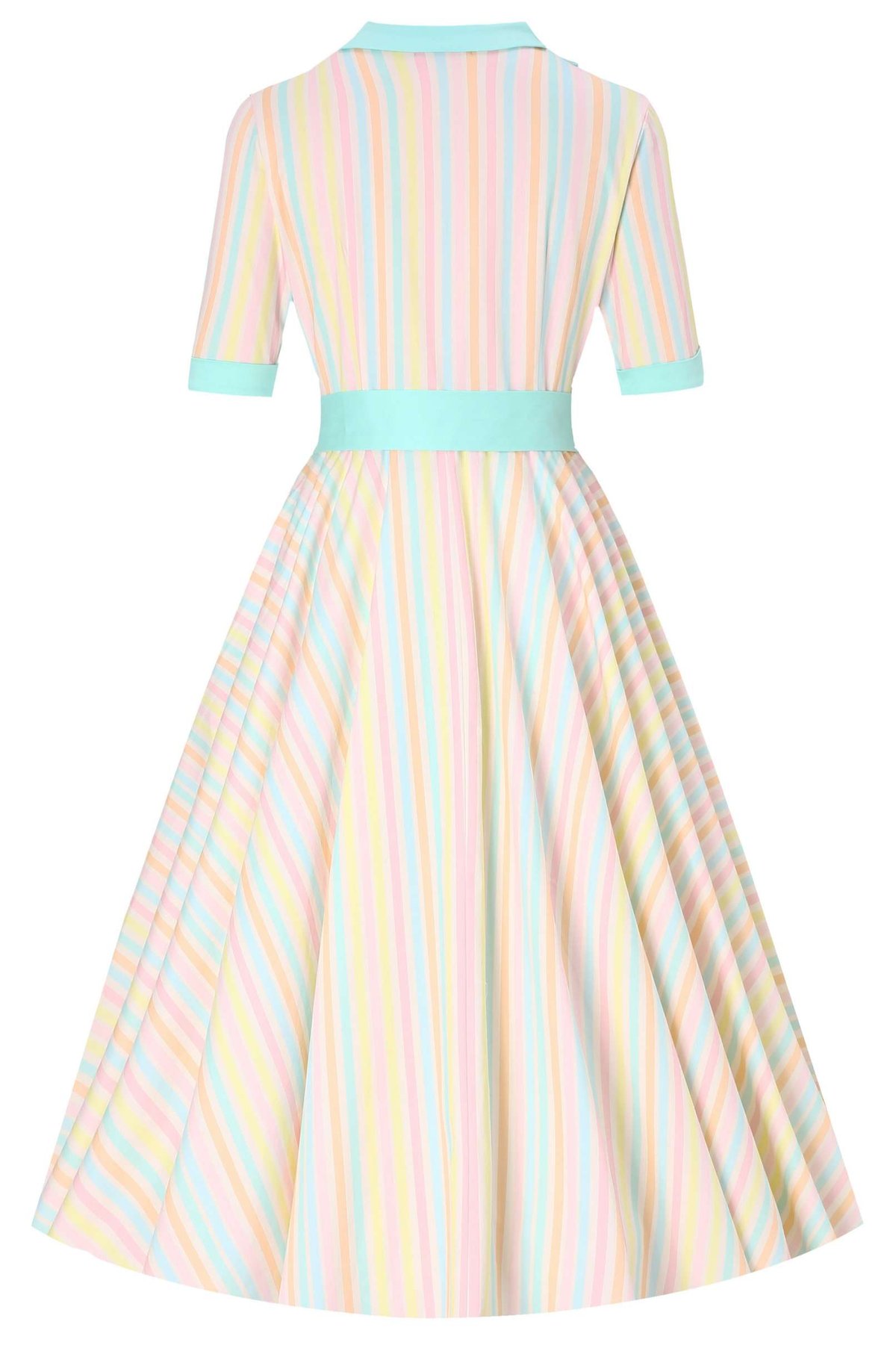 Unleash your inner vintage vixen with the Mollie Pastel Striped Full Circle Shirt Dress—where timeless charm meets playful sophistication. Its soft pastel aqua stripes are as refreshing as a spring breeze, while the full circle skirt promises a swish and sway that’ll turn heads with every step. The delicate shawl collar, with its retro allure, pairs perfectly with the above-elbow sleeves, creating a silhouette that’s both elegantly playful and irresistibly chic. Cinched at the waist with a sleek belt, Mollie’s figure-flattering design will have you feeling like you just stepped off a 1950s movie set—claws-down gorgeous, darling.
