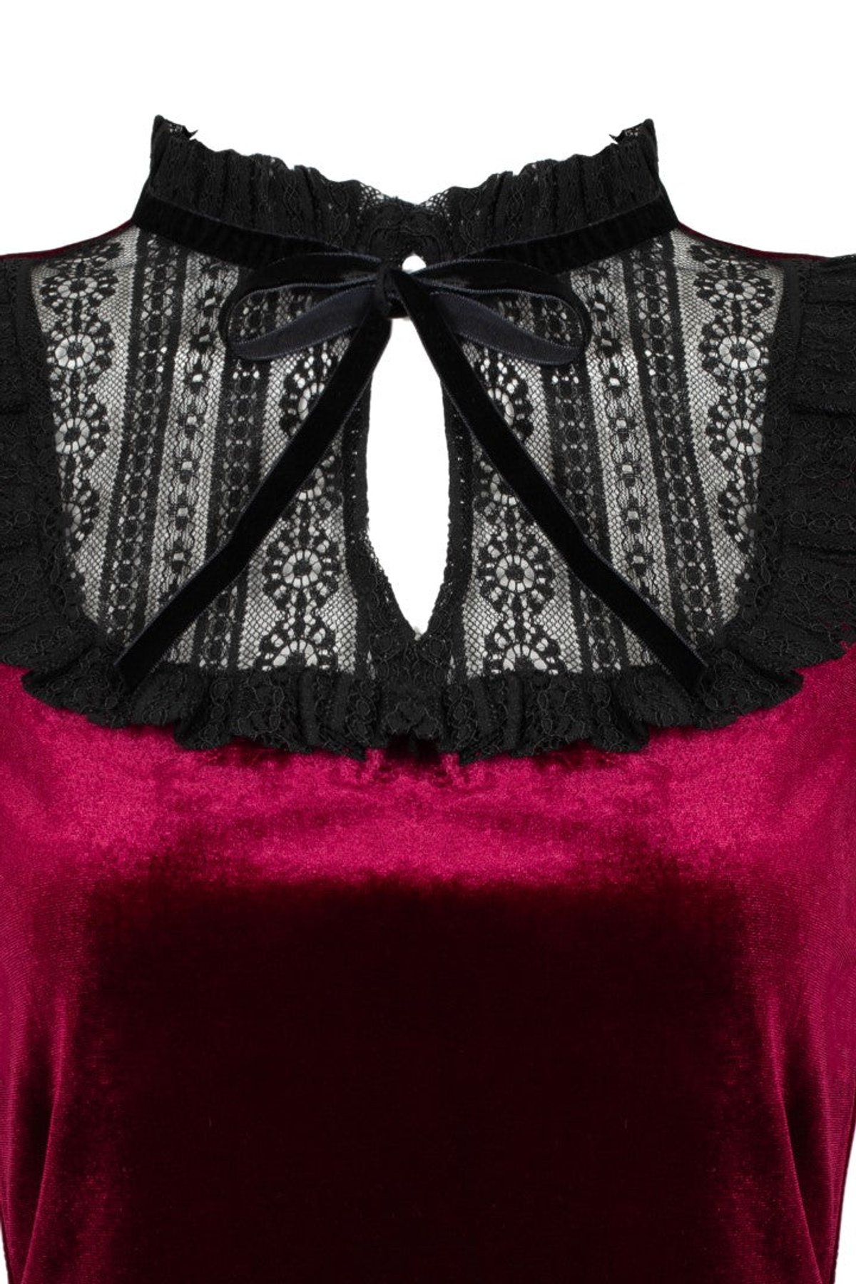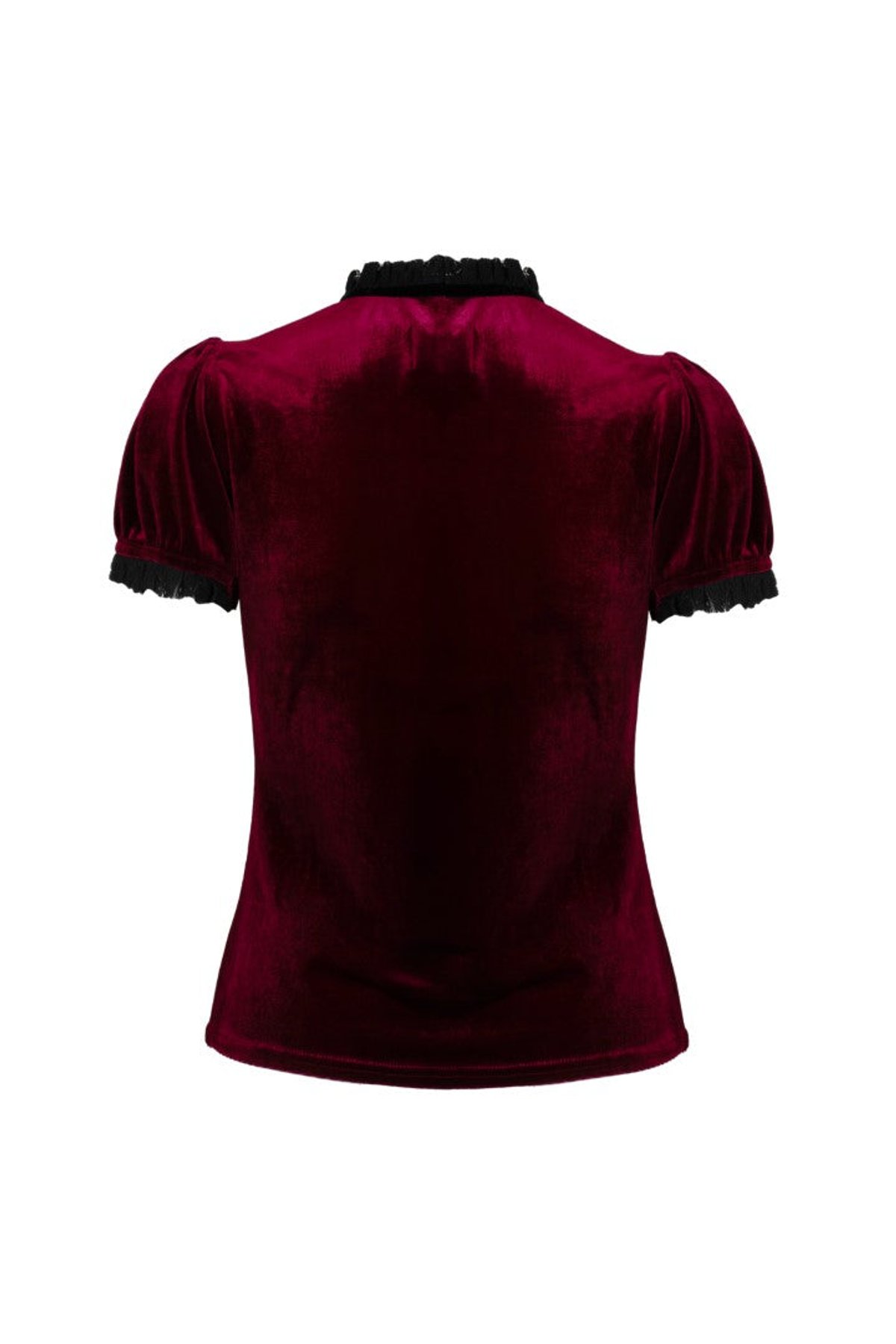 Unleash your dark romantic side with the Mourning Top—a stunning blend of rich dark red velvet and intricate black lace. The playful keyhole detail and petite bow at the frilled neckline add just the right touch of flirtatious intrigue, while the puffed sleeves and delicate frills bring a hint of theatrical glamour. Designed to flatter and inspire, this piece drapes effortlessly over your curves and finishes at the top of your hips, making it endlessly versatile for both daring nights out and chic daytime looks. Crafted with a touch of elastane, it moves with you—purrfect for those who want to feel confident and comfortable all day long.
