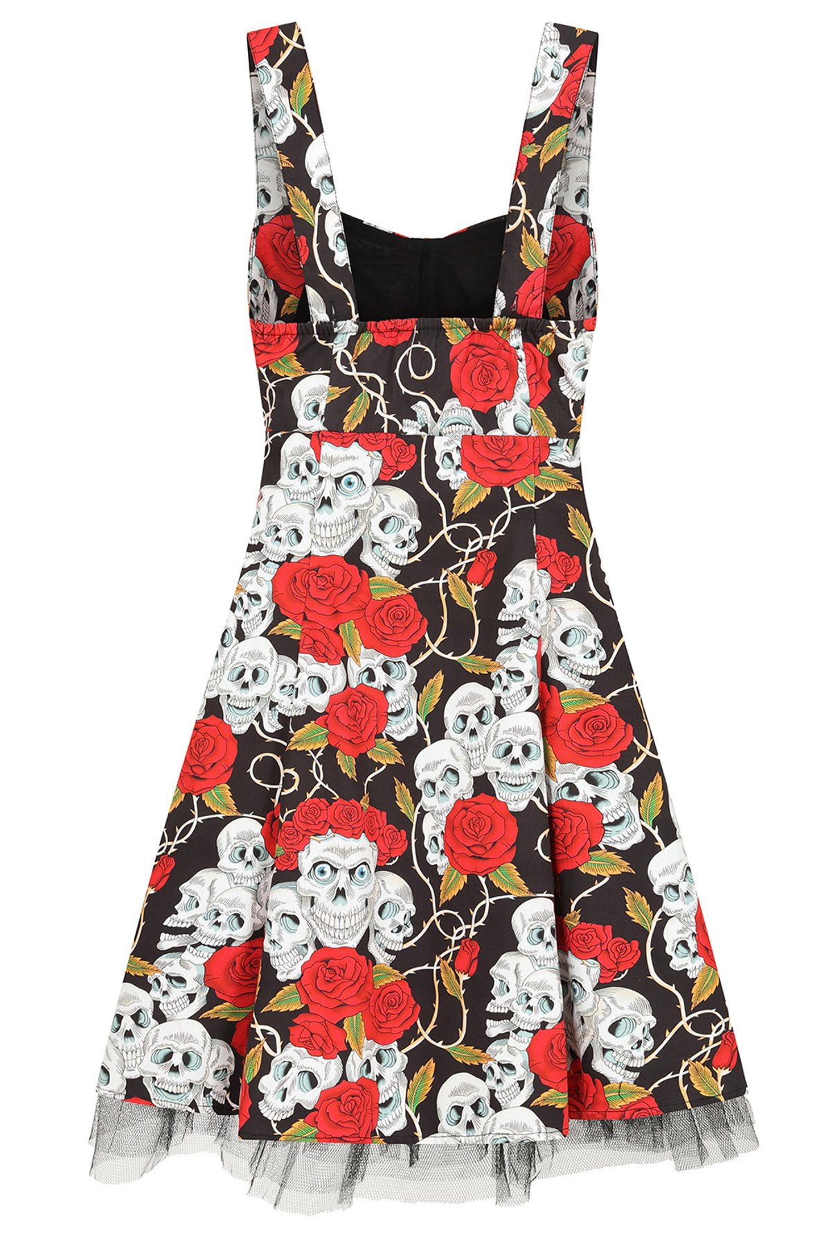 Unleash your inner rebel with our skull roses dress—the perfect blend of daring and dainty. With its striking black and red palette, this piece is a purrfect way to turn heads and set the scene on fire. The captivating skull and rose print adds a touch of fierce femininity, while the versatile halter neck or strap options make it easy to switch up your look. Crafted from a comfy cotton-elastane mix, it’s designed to keep you feeling fabulous, whether you’re dancing the night away or brunching with friends. The built-in tulle skirt adds a playful twirl factor, making every step a little more fun. This isn’t just a dress; it’s a statement that’s sure to make your wardrobe pop with personality. Ready to pounce on this punk-inspired beauty?