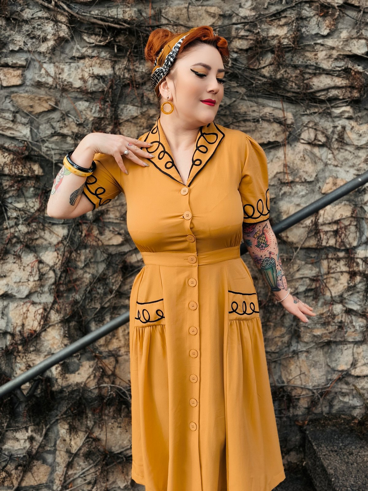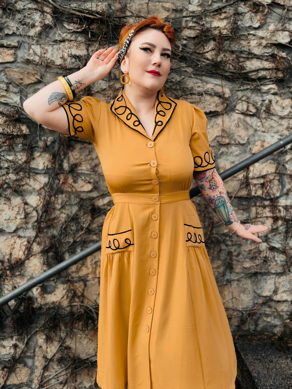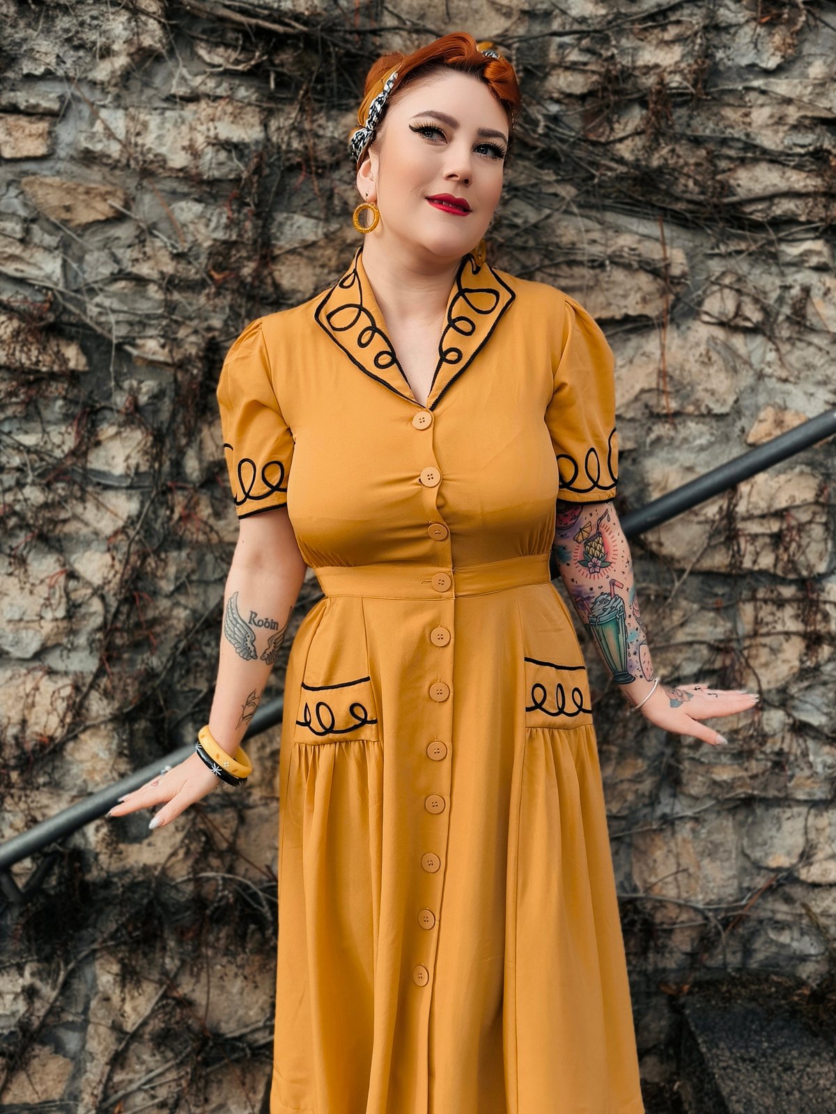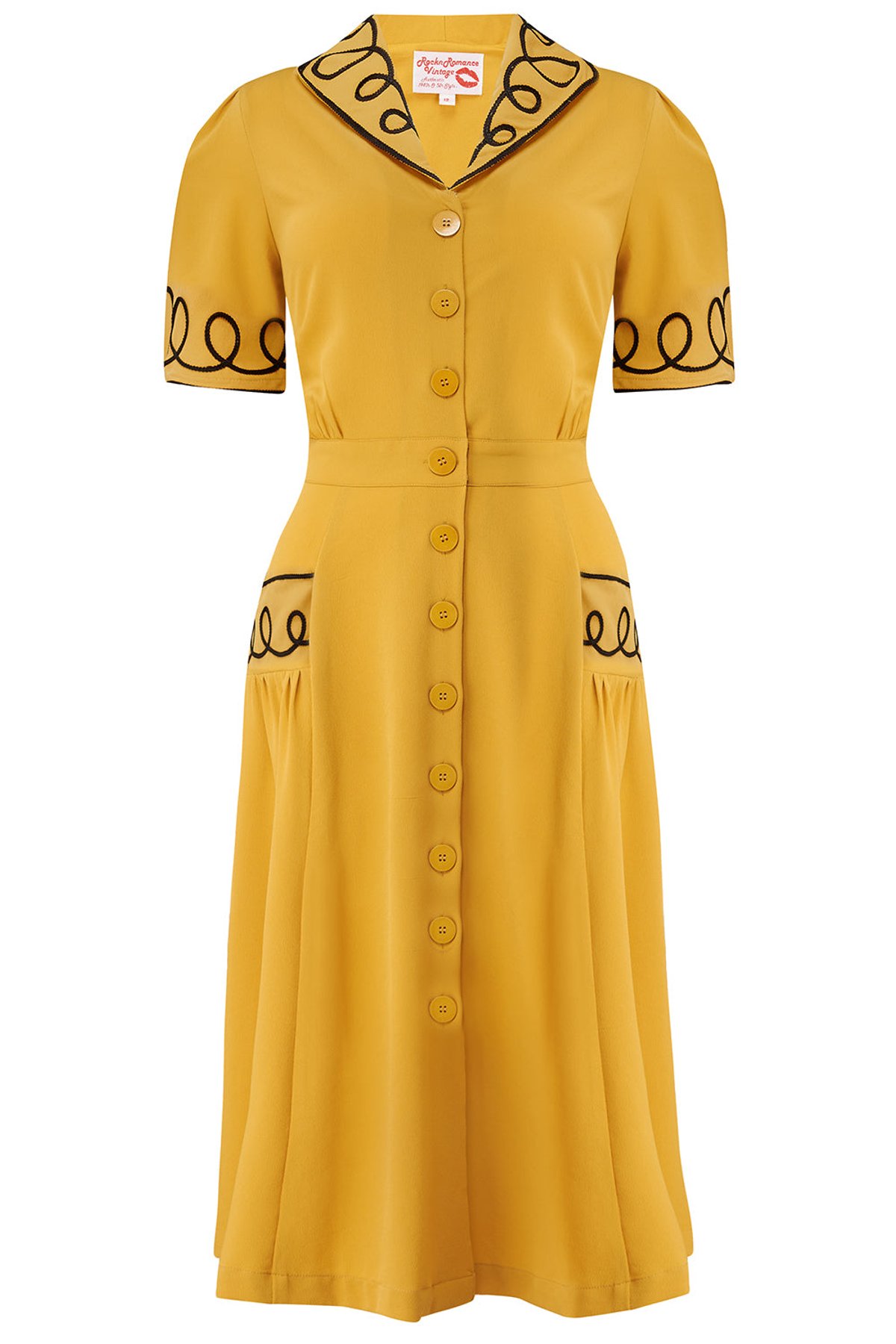 Unleash your inner vintage vixen with the Loopy-Lou Shirtwaister Dress—where bold mustard meets charming black ricrac for a look that’s both playful and polished. The elasticated waist cinches you in just right, celebrating every curve with a nod to timeless style. Made from soft, drapey Poly Crepe, it feels as fabulous as it looks, making every twirl and stride a purrfect moment of retro elegance. Whether you’re feeling flirty at brunch or striking a pose at a soirée, this dress is your new go-to for turning heads and clawing your way to the top of the style scene.
