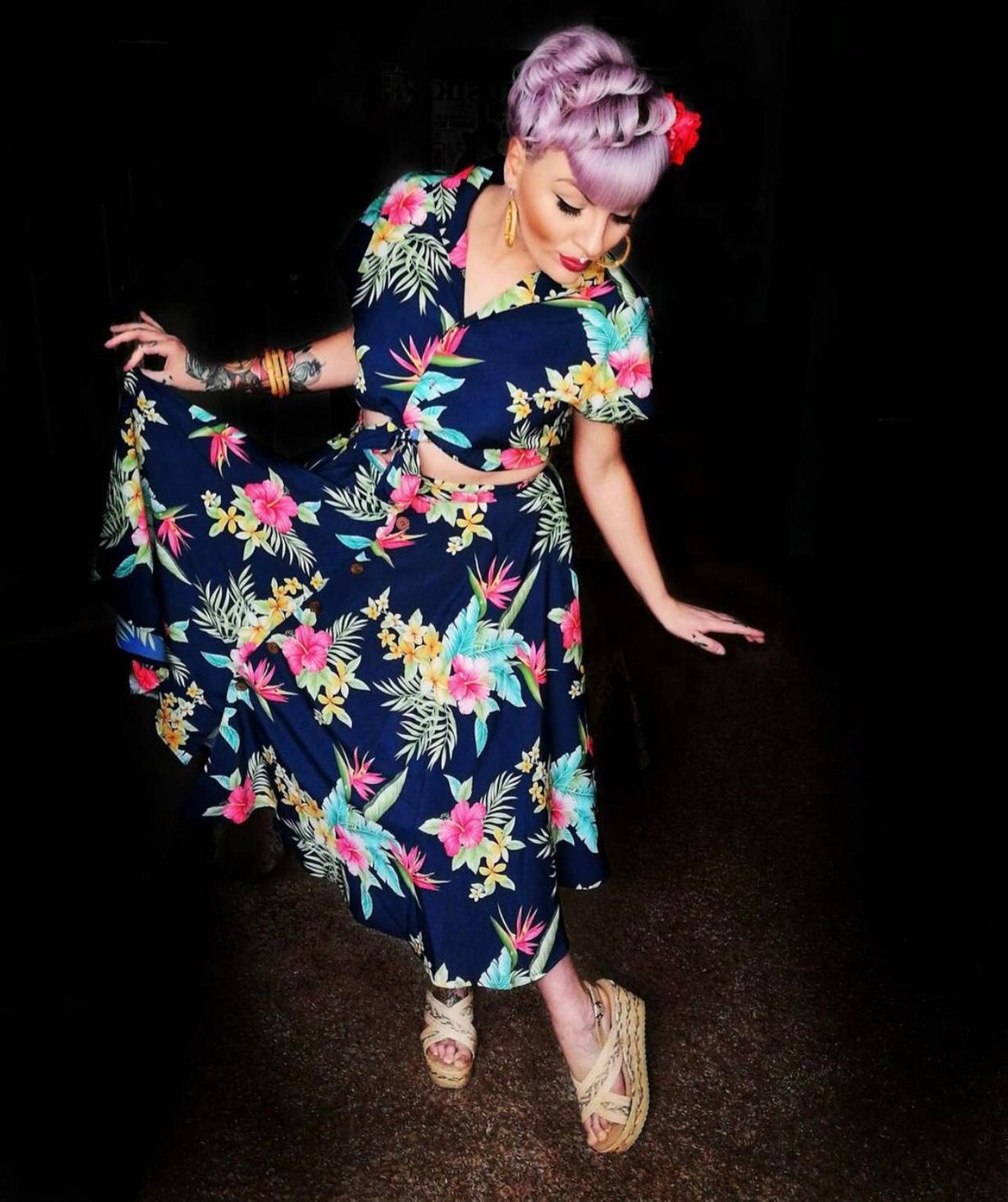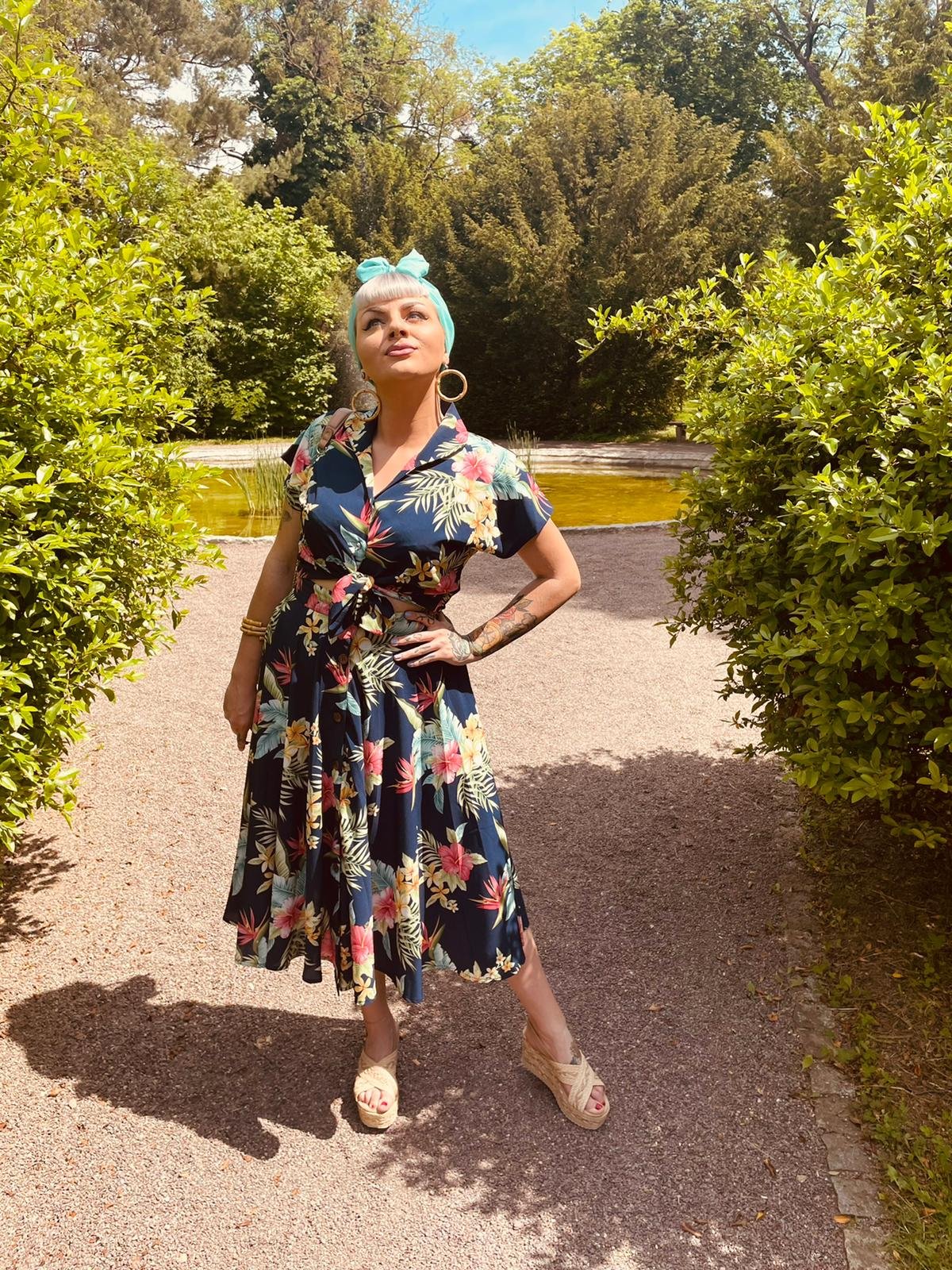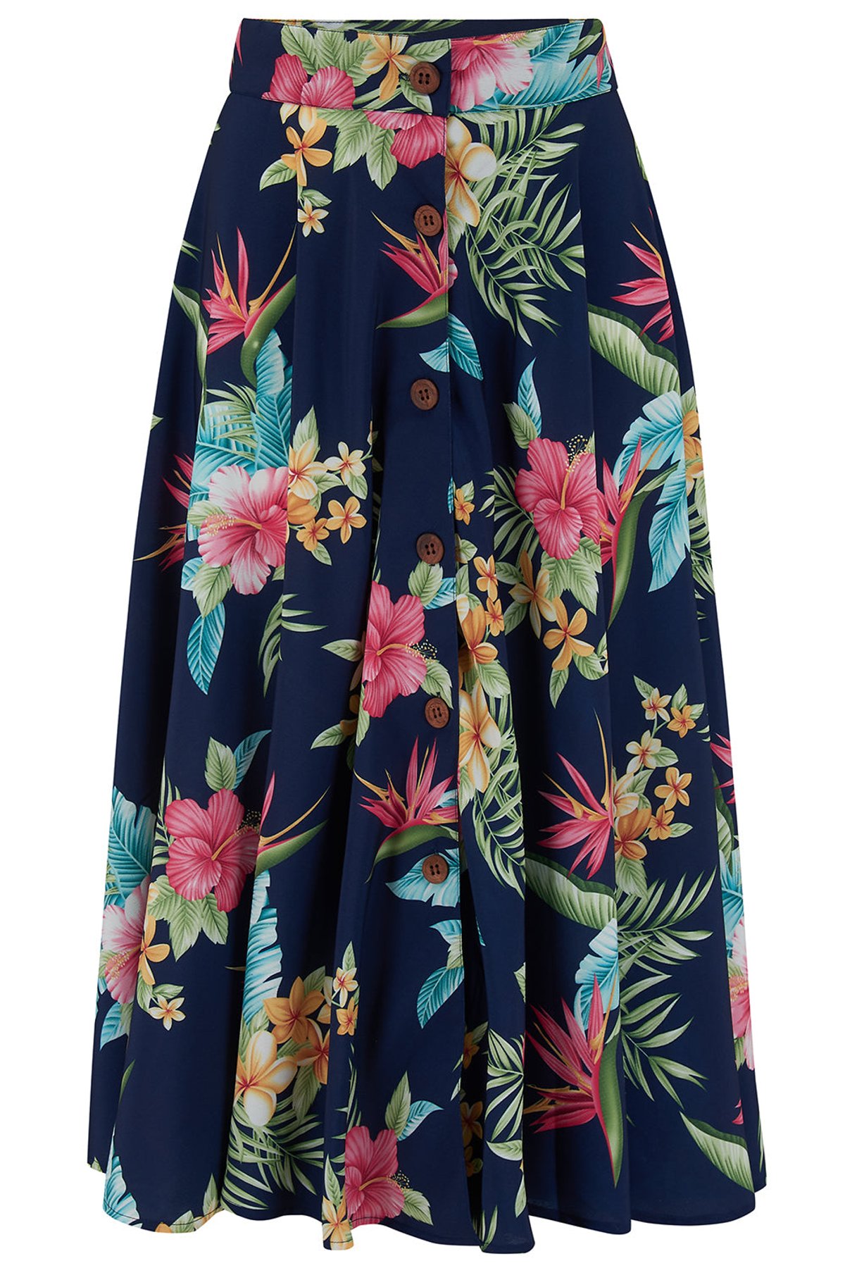 Unleash your inner vintage vixen with The Beverly Button Front Full Circle Skirt—a true showstopper in sophisticated navy Honolulu print. Its irresistible high-waisted cut and playful floral design will have you feeling claws-down gorgeous, whether you're commanding attention at a brunch or strutting your stuff on the dance floor. The full circle silhouette creates a beautiful drape that moves with you, making every step feel like a sashay down the street. Crafted from soft yet durable fabric, this skirt is as comfortable as it is chic, with handy in-seam pockets that let you keep your essentials close—because a stylish feline never leaves home without her secrets.