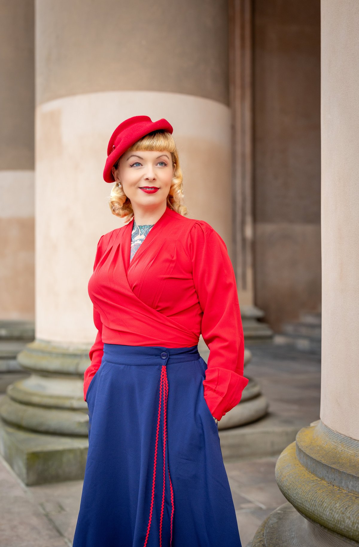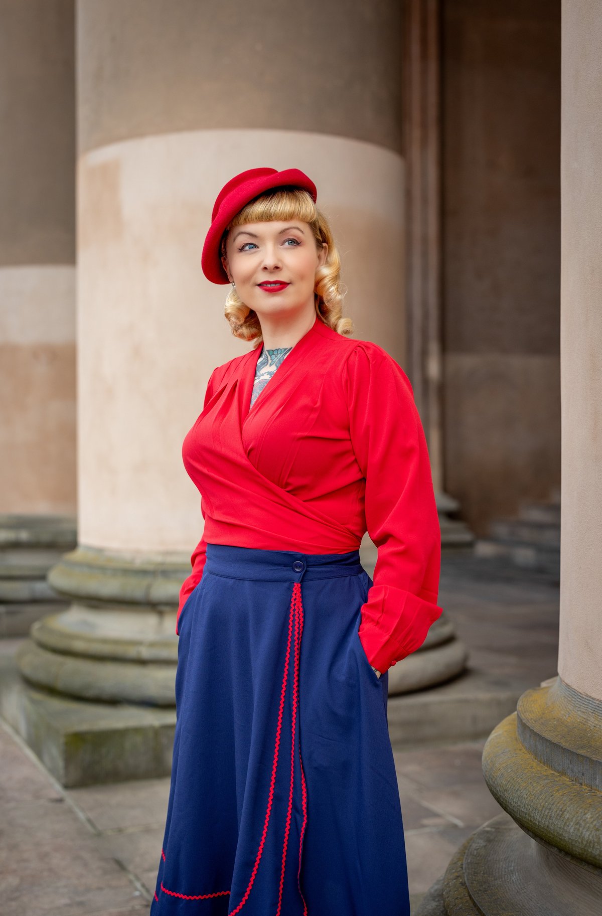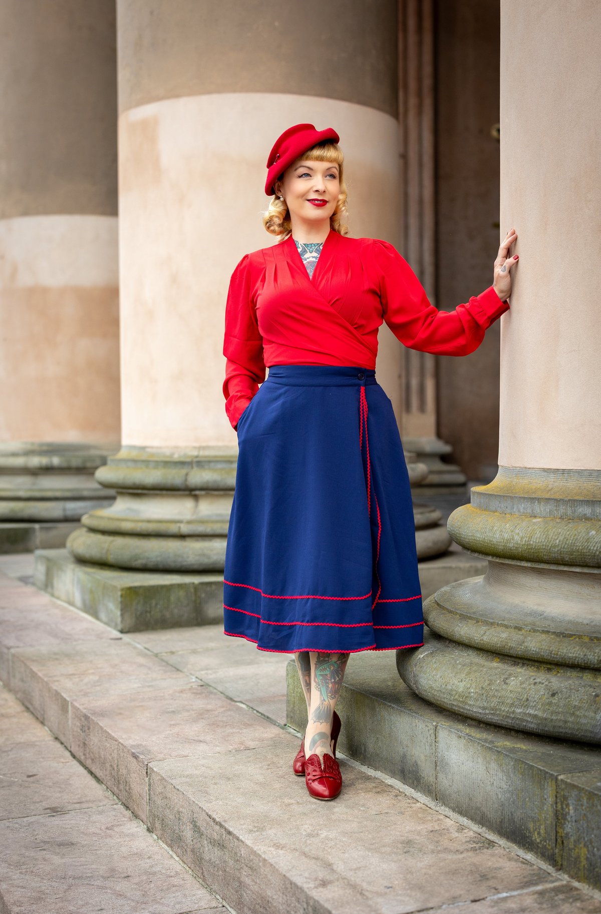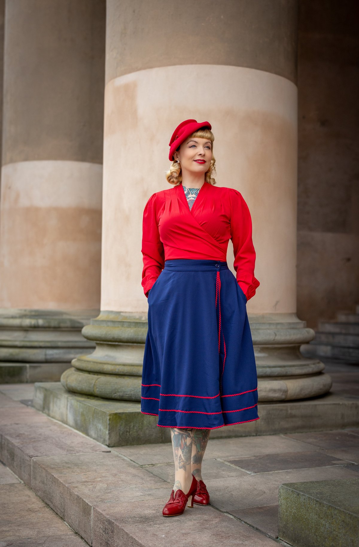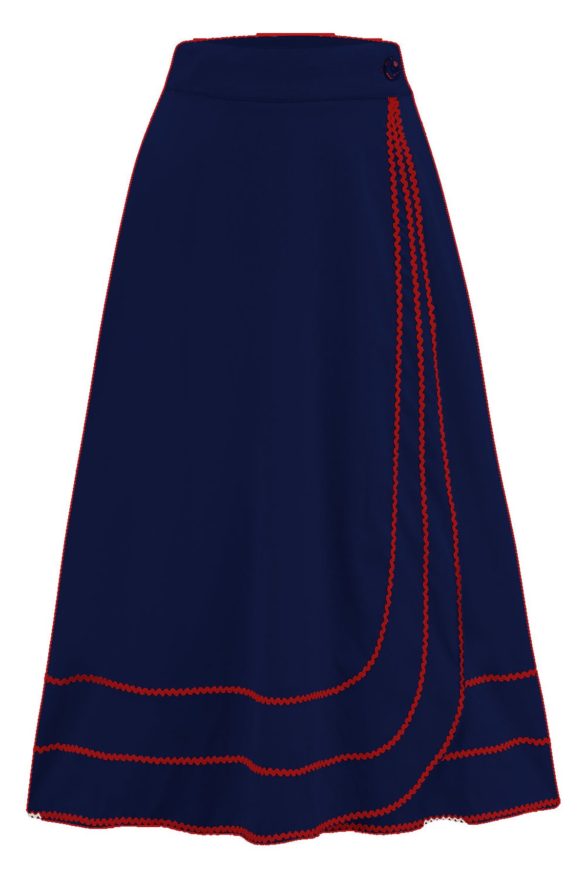 Unleash your inner vintage vixen with the Glynis Wrap Around Circle Skirt—where timeless charm meets modern flair. The deep navy hue is effortlessly sophisticated, while the playful splash of red ric rac adds just the right hint of mischievous fun. The full circle design ensures every twirl is pure poetry, and those nifty pockets are here to keep your essentials close without sacrificing style. Crafted from sumptuous poly crepe, this skirt drapes beautifully, offering a claws-down gorgeous silhouette that moves with you. Whether you're feeling flirty or refined, it's a purrfect piece to elevate your wardrobe.