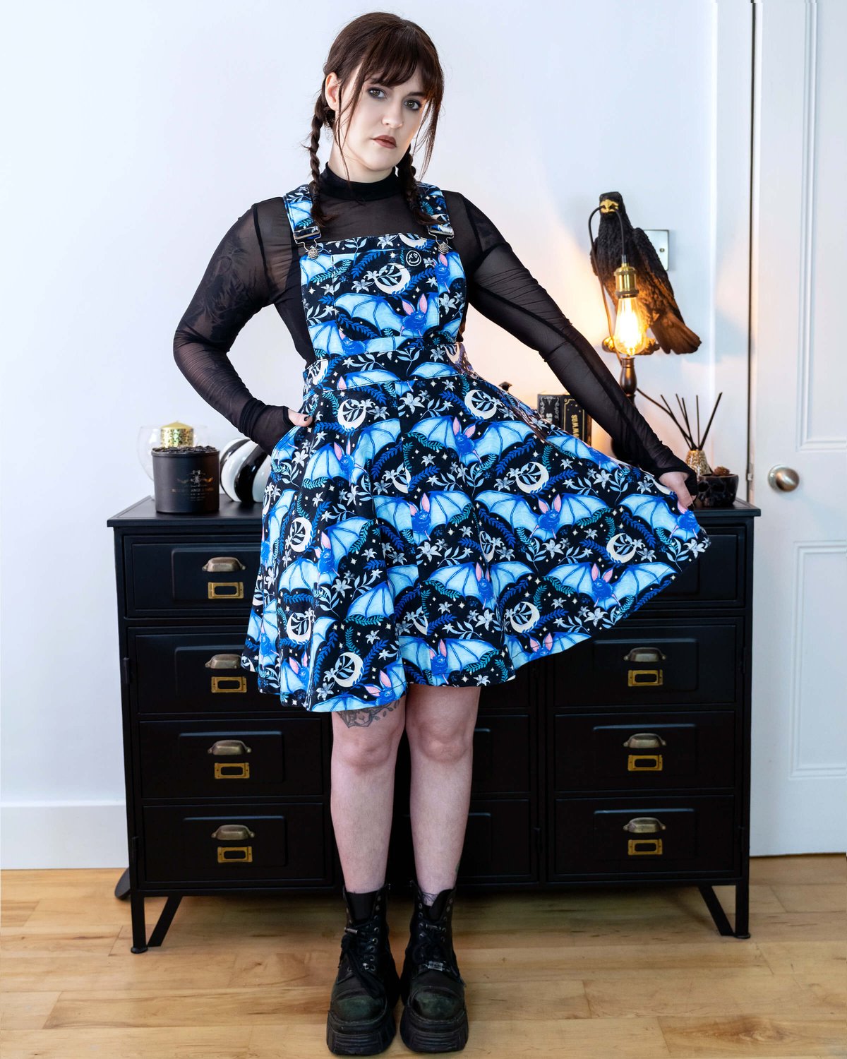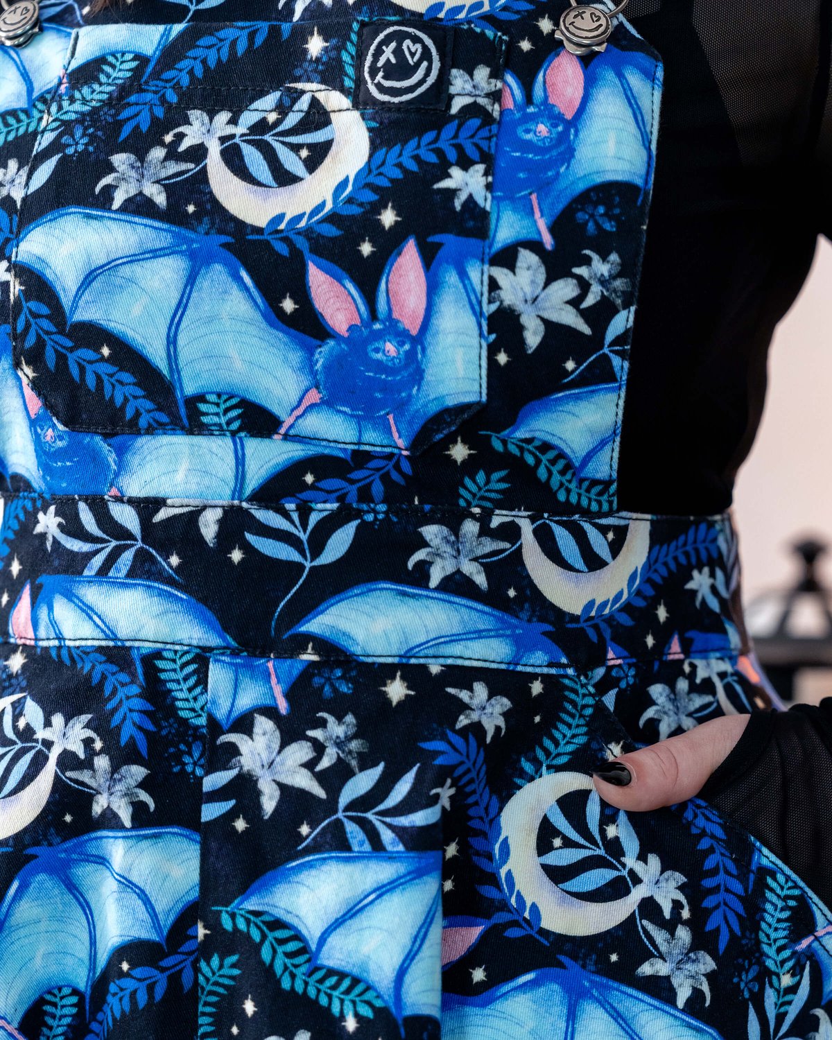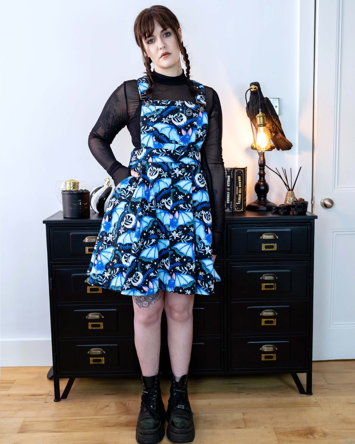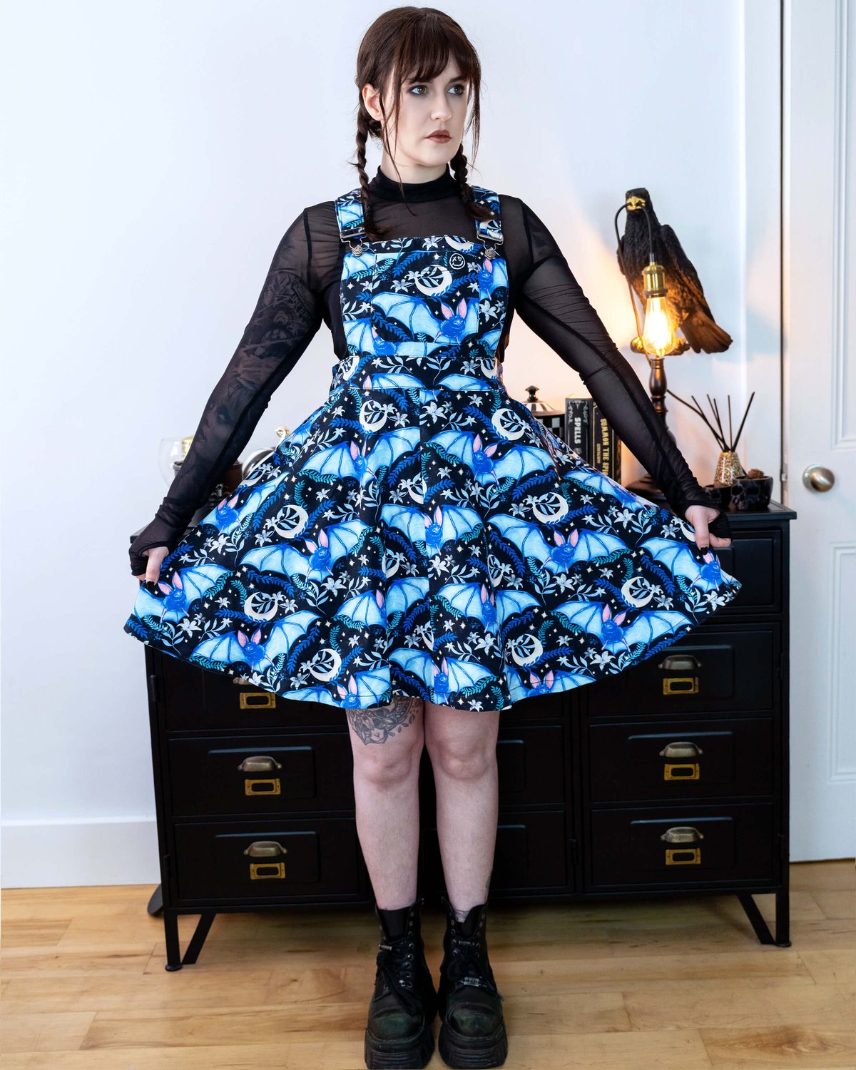 Unleash your inner nocturne with the Night Flight Stretch Flared Pinafore—where gothic allure meets playful sophistication. The moody black and blue palette is beautifully adorned with bats and stars, creating a celestial vibe that’s both mysterious and mesmerizing. The flared silhouette adds a touch of fun and movement, while the adjustable buckle straps and comfy stretch fabric make it a delight to wear from dusk till dawn. With its twirling skirt and cleverly placed pockets, this piece invites you to embrace your darkly charming side with effortless grace. Whether you’re channeling your inner moon goddess or simply craving a look that’s both whimsical and chic, this pinafore is a true star in any wardrobe constellation.