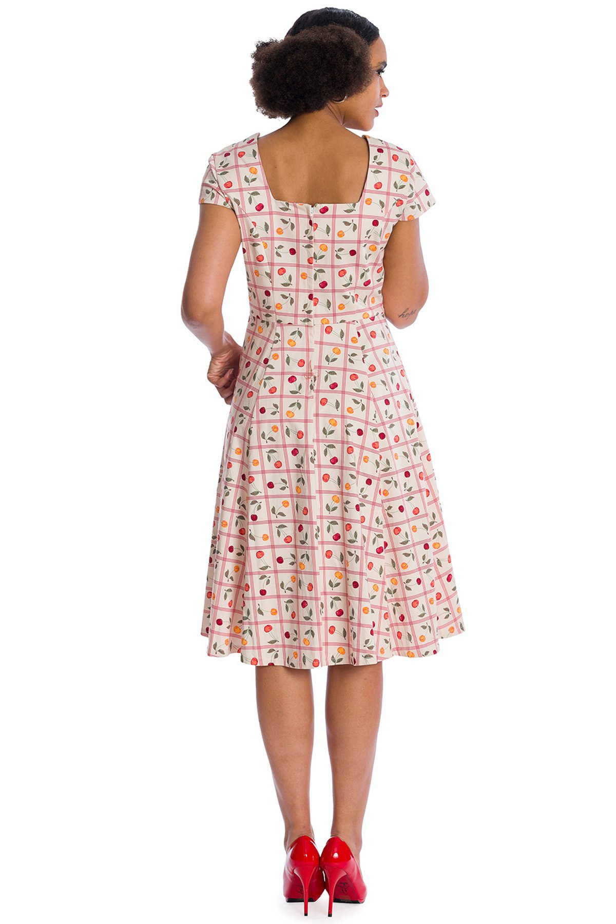 Unleash your inner vintage vixen with this off-white cherry fit & flare dress—where timeless charm meets playful flair. The delightful floral grid pattern, sprinkled with multicoloured blossoms, offers a purrfect blend of retro elegance and fresh, modern appeal. Crafted from a comfy cotton-elastane mix, it moves with you, whether you're twirling at a summer soiree or enjoying a leisurely garden brunch. The silhouette is irresistibly flattering, giving you that claws-down gorgeous look that’s hard to resist. A perfect choice for women who like to keep things chic, yet with a bit of mischievous sparkle in their style.
