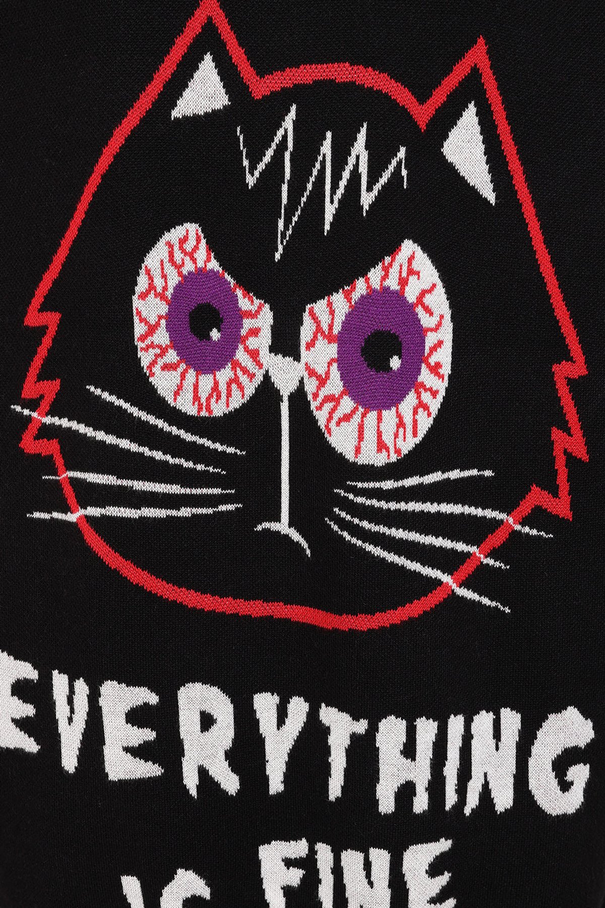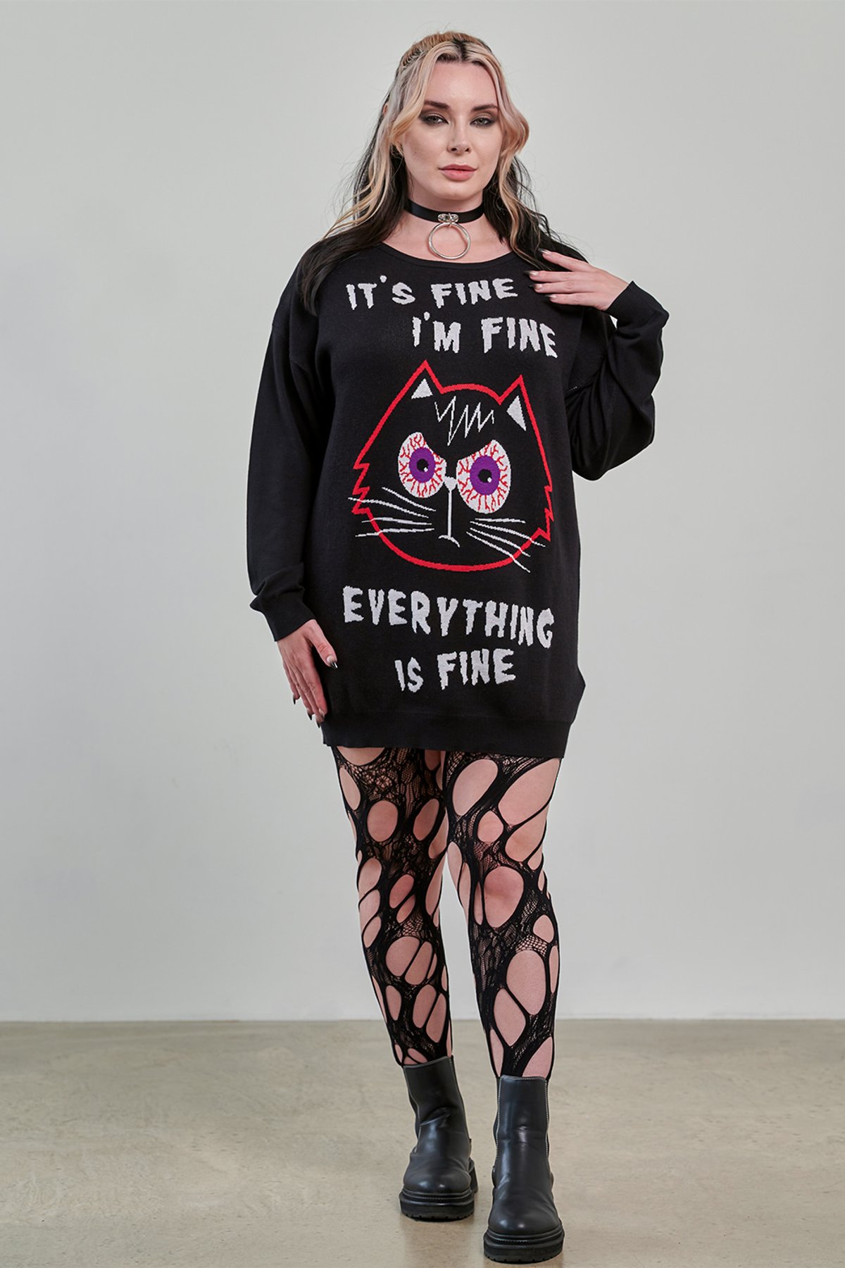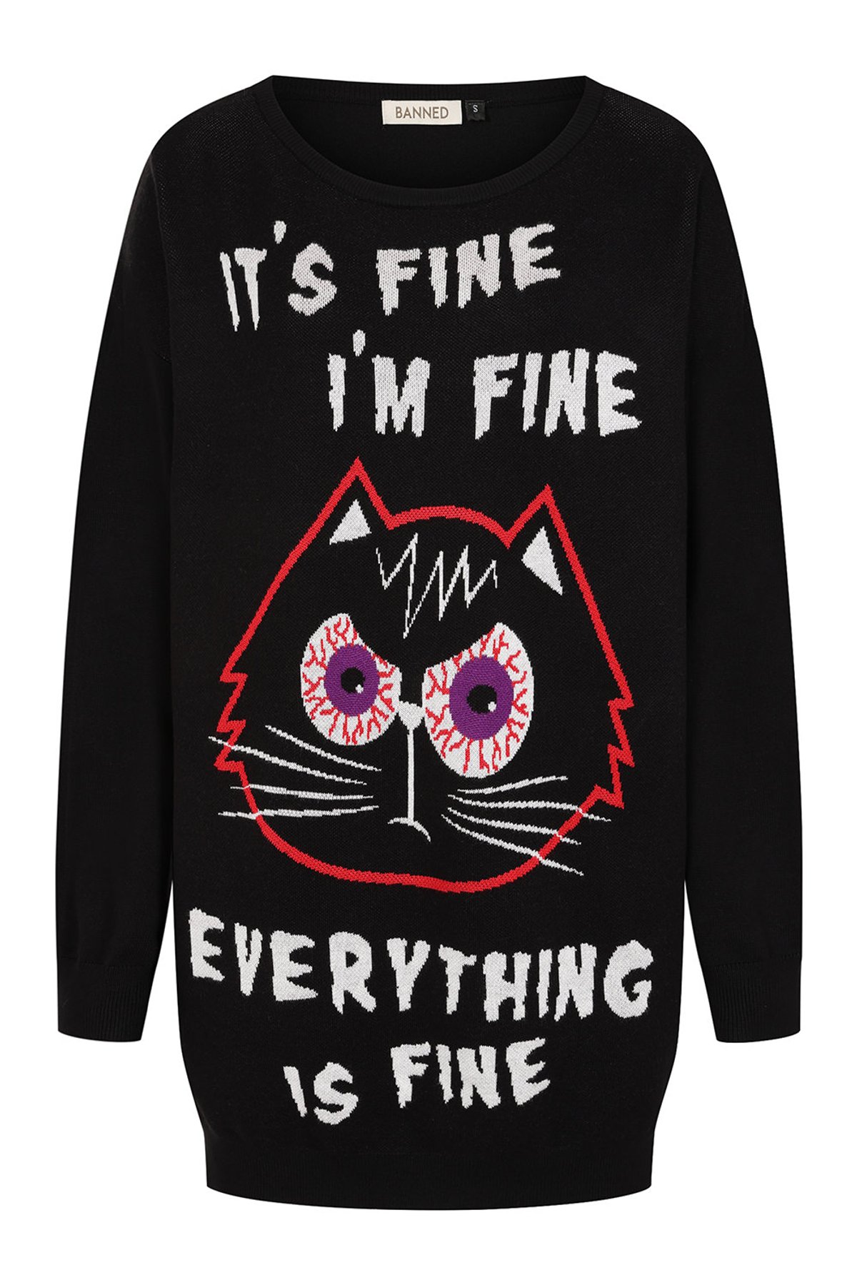 This knitted dress from Banned Alternative delivers dark humour with a dose of cuteness. Crafted in black, it features a bold front graphic of a wide-eyed cartoon cat with cracked pupils, framed by the distressed-looking text: It s fine, I m fine, everything is fine. The oversized fit gives it a relaxed, slouchy silhouette perfect for layering or wearing as a statement piece on its own. Long sleeves and a crew neckline keep it comfy and casual, while the exaggerated length gives it sweater-dress appeal. Equal parts quirky, edgy, and expressive, this dress is ideal for lovers of alternative style with a sarcastic twist.