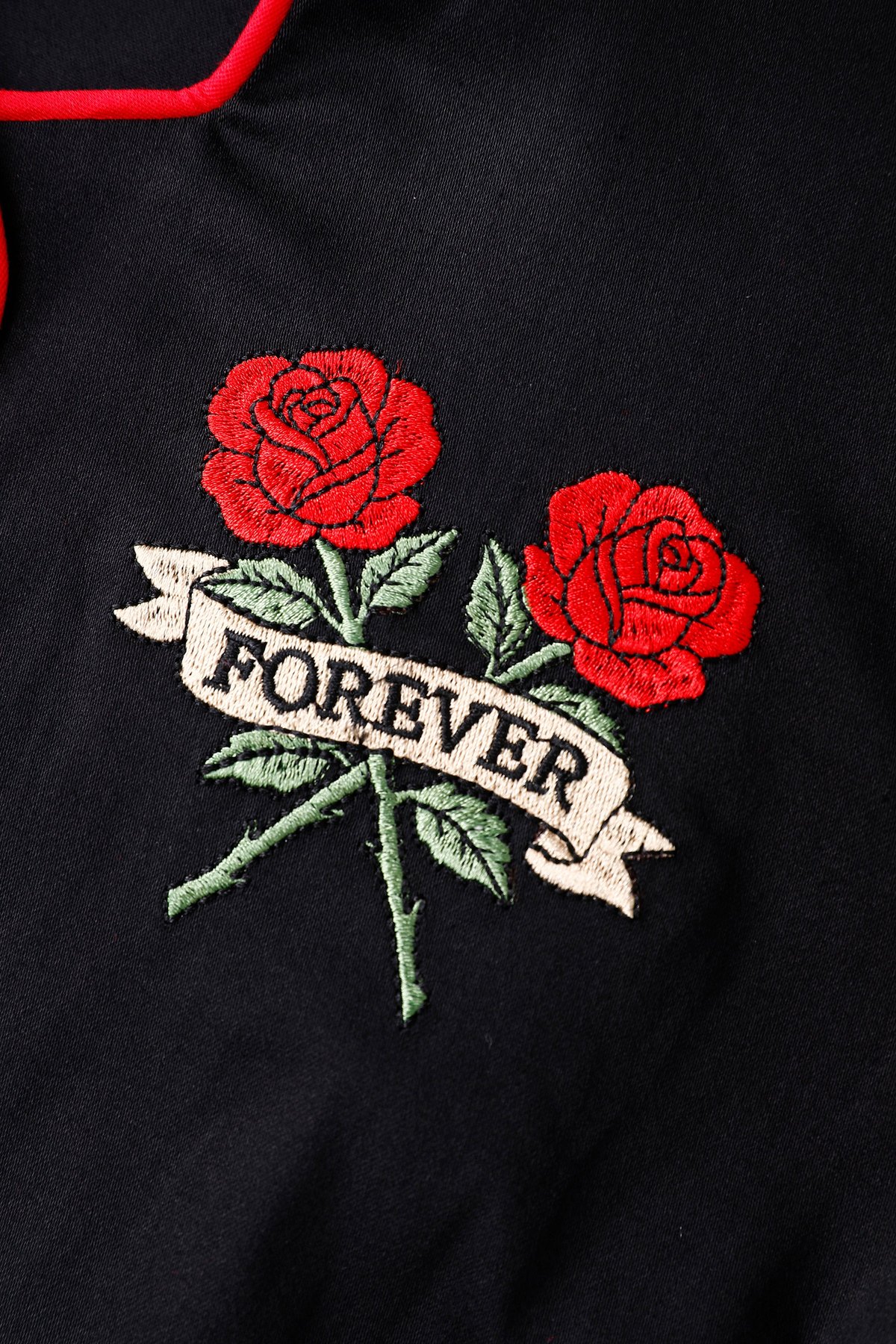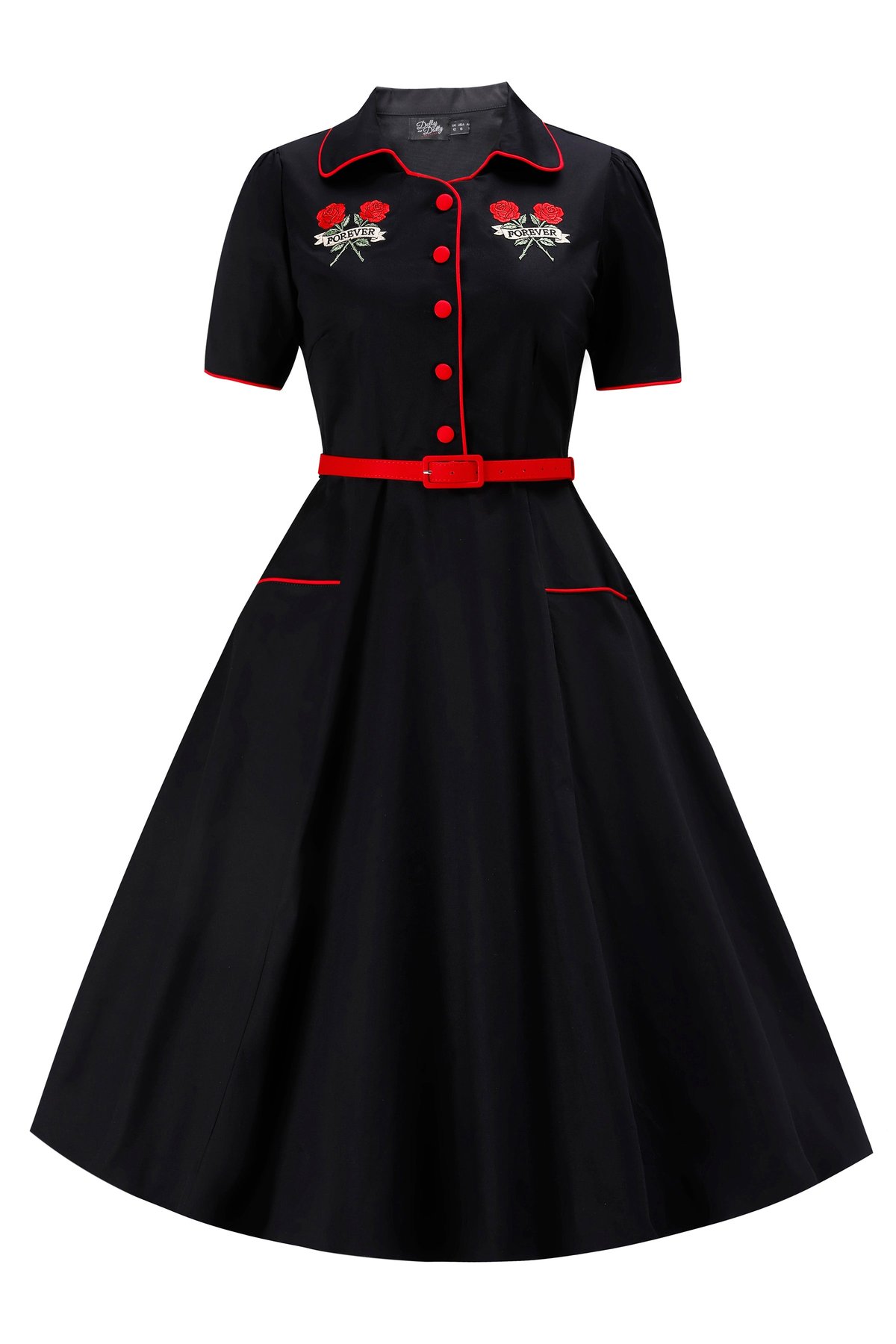 Unleash your inner vintage vixen with the Penelope II Rose Embroidered Black Dress—where classic charm meets modern sass. The black fabric is a sleek canvas for the delicate red rose embroidery, whispering romantic secrets with every stitch. Red piping accents add a pop of playful sophistication, while the matching belt cinches you in for a truly claw-some silhouette. This dress isn’t just a look—it's a statement of style that’s both timeless and utterly irresistibly chic. Whether you’re feeling flirty or polished, it’s got the purrfect balance of elegance and edge that will have heads turning.