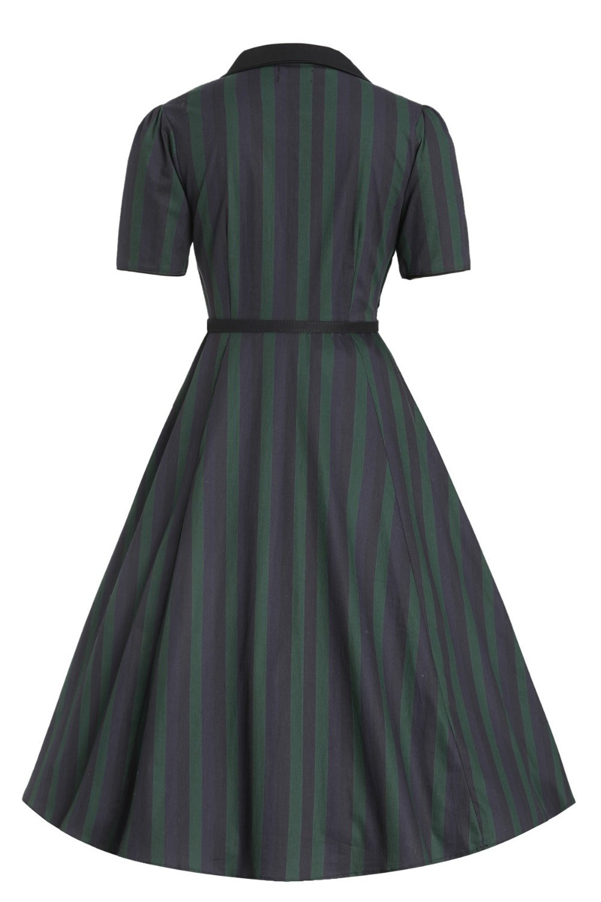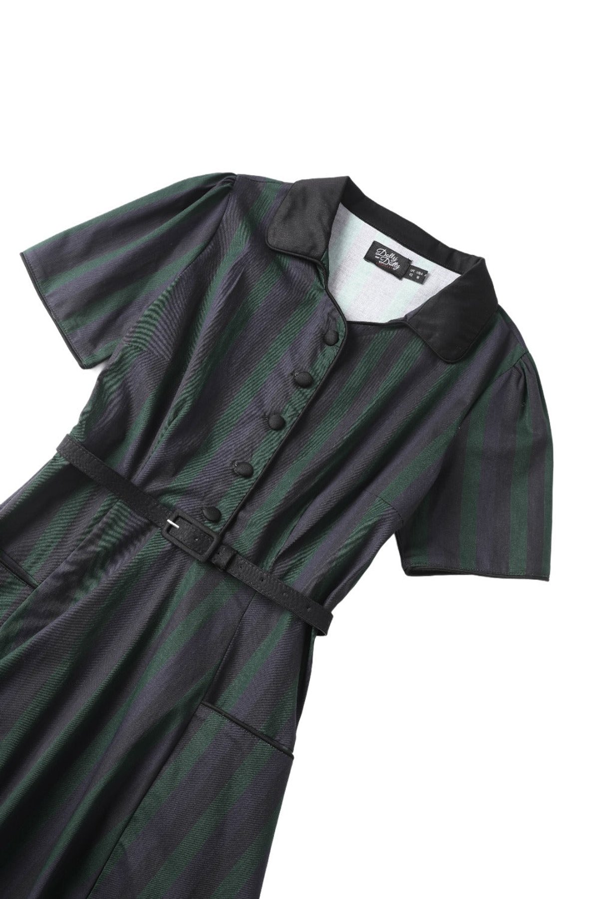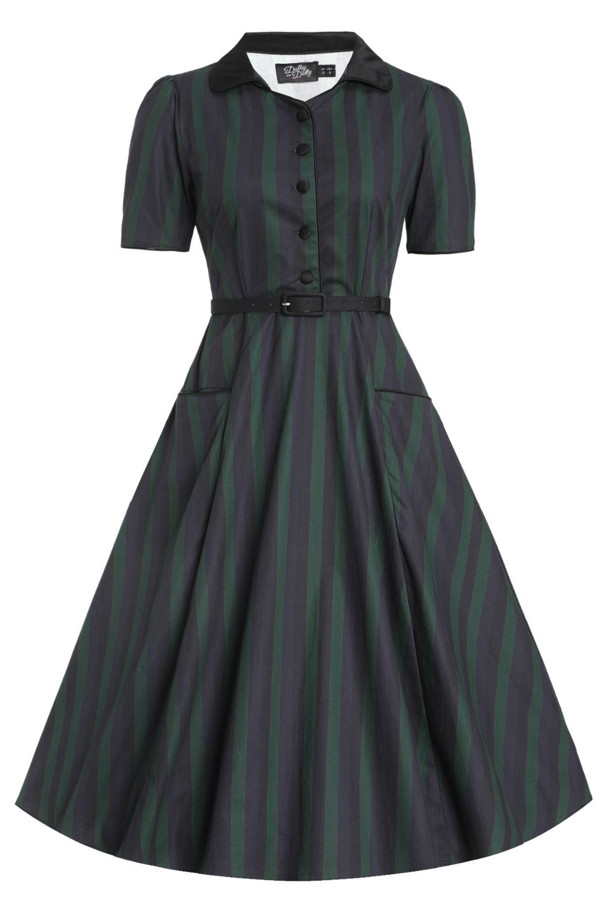 Unleash your inner vintage vixen with the Penelope II Black & Green Stripe Shirt Dress, a purrfect blend of retro charm and modern allure. The bold stripes make a statement, while the fit-and-flare silhouette and matching belt work their magic to create a silhouette that’s claws-down gorgeous. Short sleeves and front buttons add a touch of practical playfulness, ensuring you’re always dressed to impress — whether for a daytime escapade or a nighttime soirée. Crafted from a comfy cotton-elastane blend, this dress offers effortless style and ease, with handy side pockets to keep your essentials close at paw.