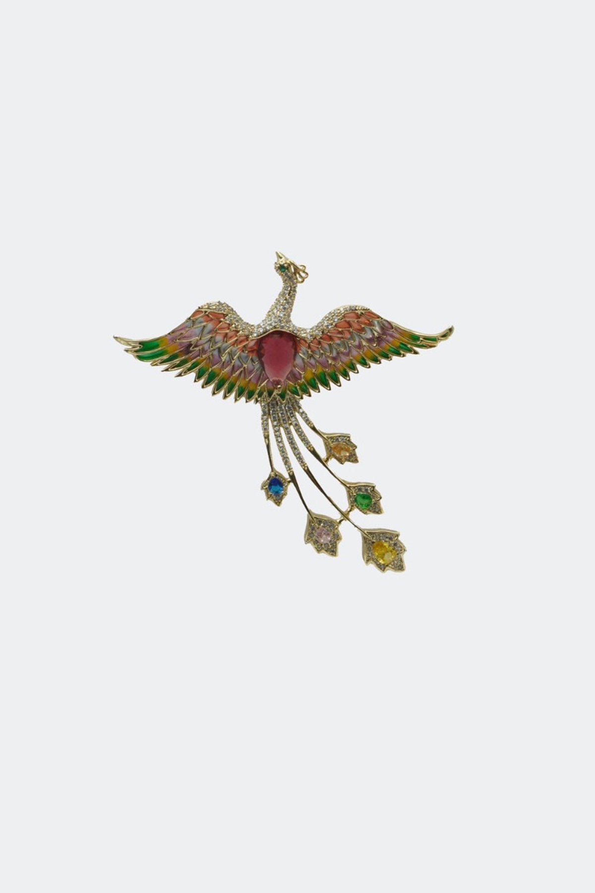 🌠Uncover your magic with the Phoenix Diamante Gem Brooch, a sparkling sensation in vintage-inspired jewellery! Elegantly crafted, this golden delight is bedecked with twinkling diamante and radiant gemstone elements. The painted wings boast rich hues of ruby and emerald, ensuring it stands out as your signature statement piece. 🦚