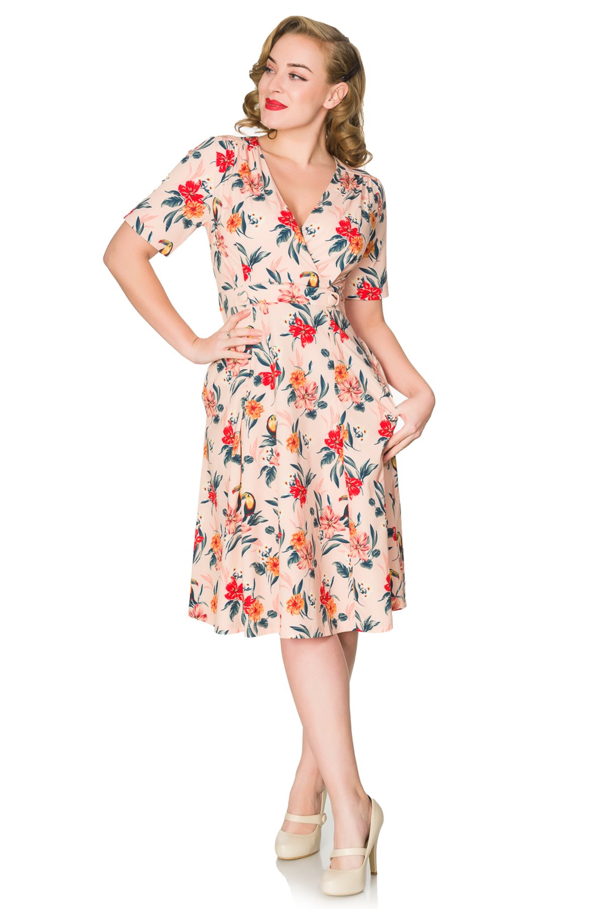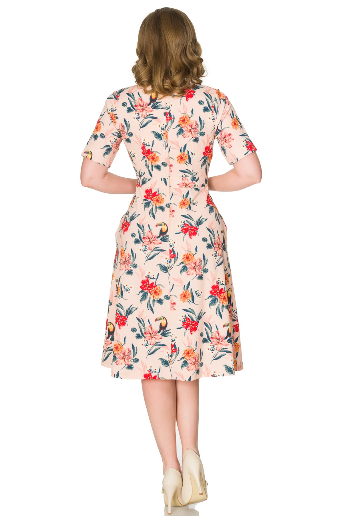 Introducing the Piper Dress—a charming, vintage-inspired piece that’s as lively as a cat’s curiosity. With its soft blush pink crepe fabric and eye-catching tropical toucans and florals, this dress purrs with playful elegance. The surplice neckline adds a subtle touch of sophistication, while the short sleeves keep things light and breezy. The darted bodice cinches just enough to flatter your curves, and the swing skirt invites movement—perfect for twirling into the sunset or strolling through sun-drenched gardens. Whether you’re channeling retro glamour or simply embracing a tropical daydream, the Piper Dress will have you looking claws-down gorgeous.