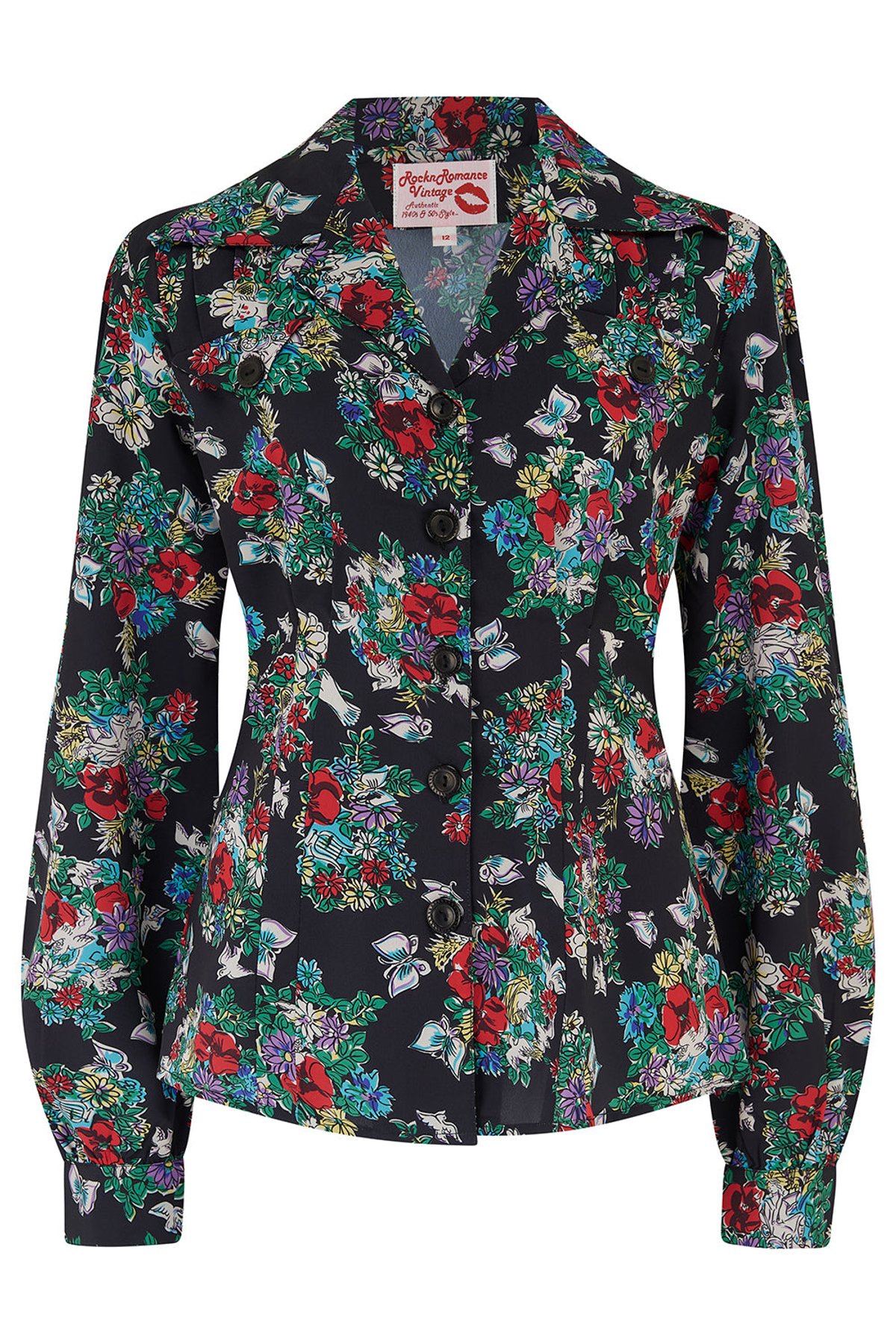 Unleash your inner vintage vixen with the Polly Long Sleeve Blouse, where delicate floral charms meet timeless 1940s elegance. The Secret Garden print blooms beautifully across a sleek black canvas, adding a purrfect touch of retro sophistication to any ensemble. From the triangular chest flaps to the charming extended revere collar, every detail whispers style and sass alike. The slight puffed sleeves bring a hint of playful drama—just enough to turn heads without overdoing it. This blouse is a true feline find, blending vintage allure with modern flair for a truly claw-some look.