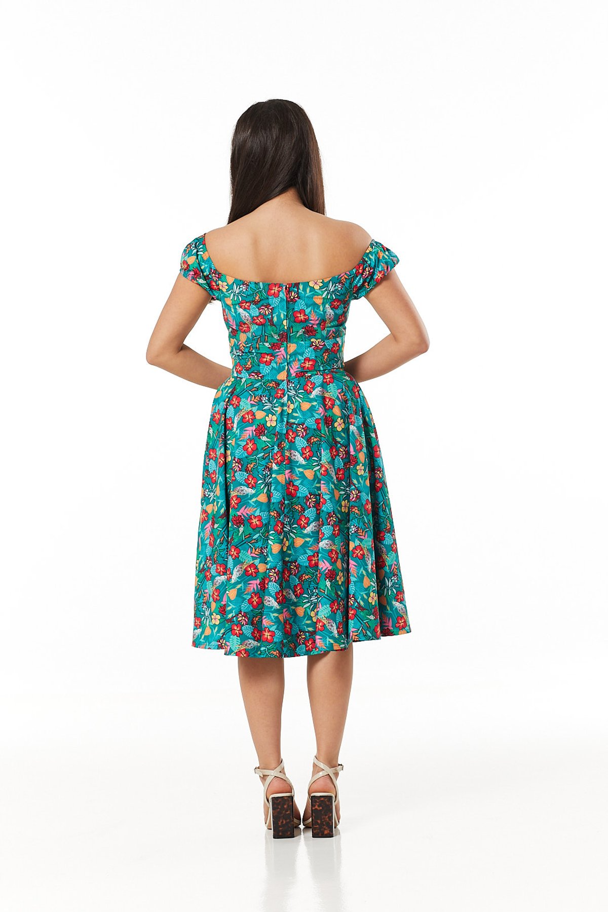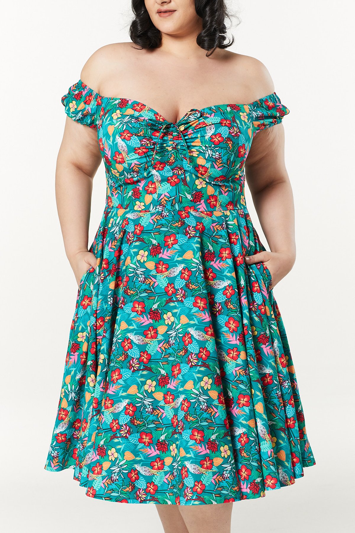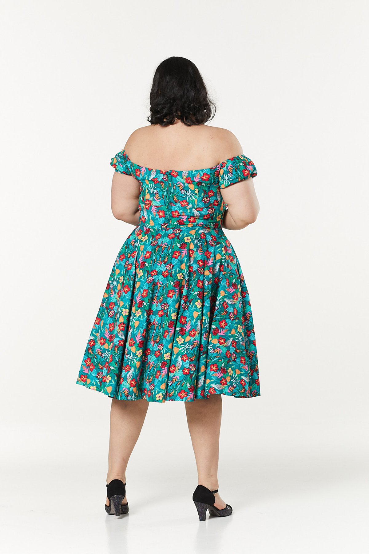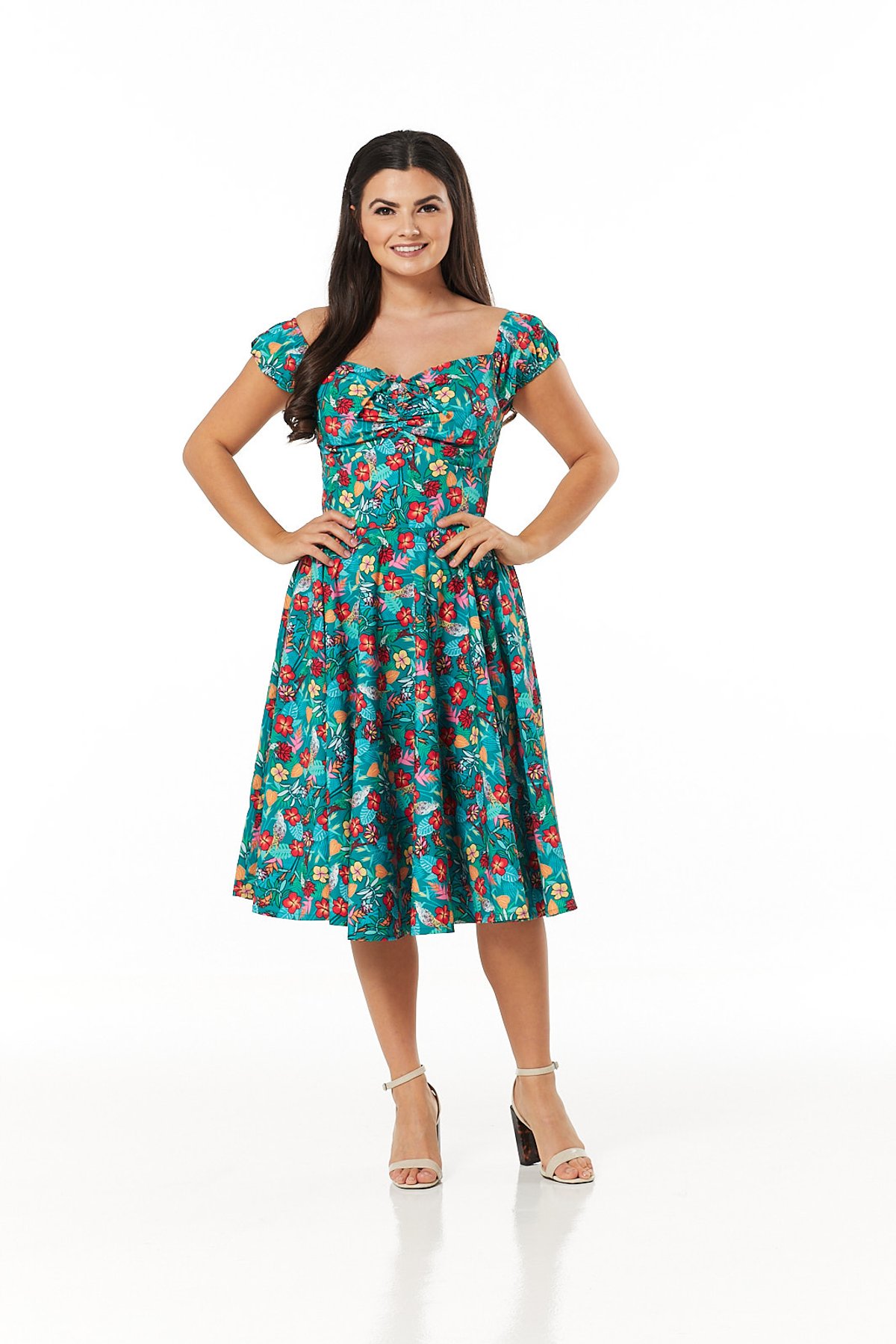 Unleash your inner vintage star with the Preston Dress—a true purrfect blend of playful charm and timeless elegance. With its off-shoulder puff sleeves and a vibrant teal and red floral print, this swing dress is a feline-tastic way to turn heads. The adorable bow detail adds just the right touch of mischief, making it impossible to resist twirling into the spotlight. Crafted to hug your waist and flare out at just the right length, it’s a silhouette that’s as flattering as it is fang-tastic. Whether you’re feeling glamorous or simply want to make a subtle statement, this dress is your new go-to for a look that’s both chic and a tad mischievous.