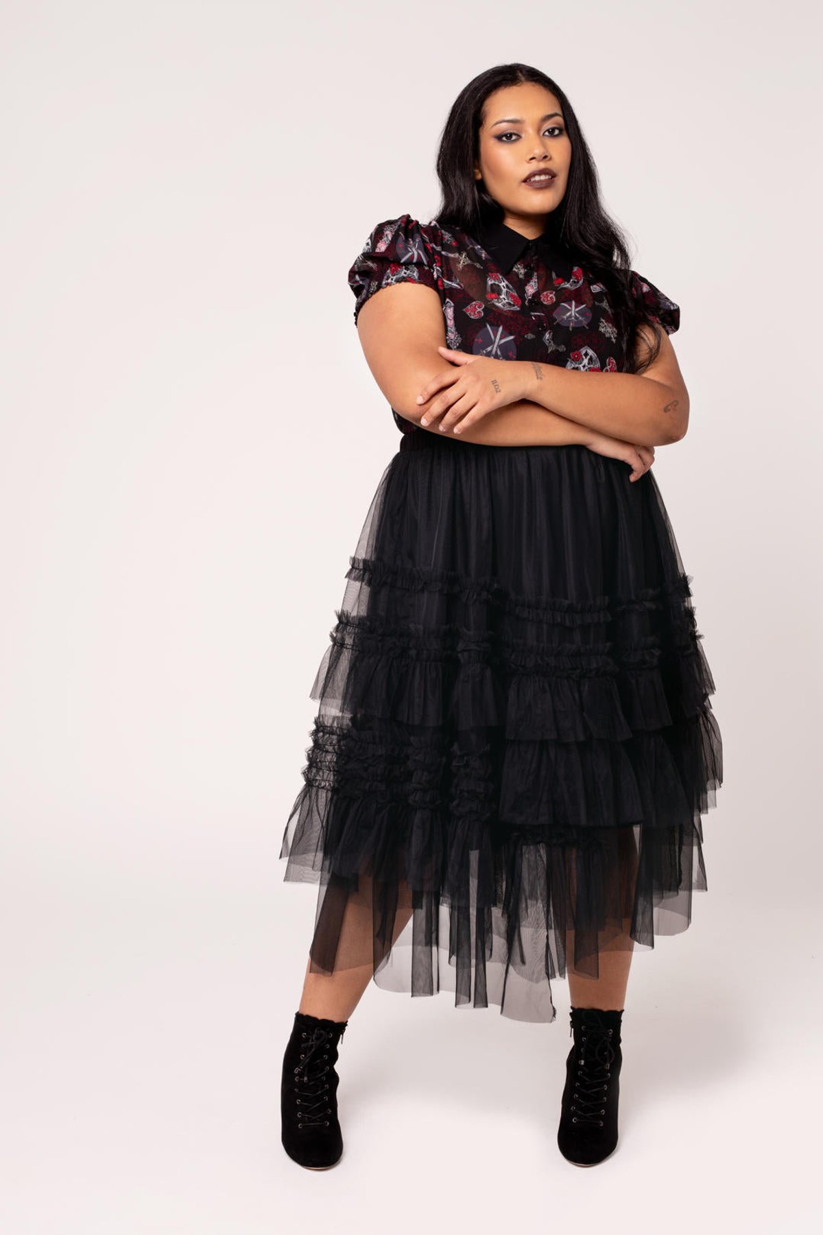 Unleash your inner enchantress with the Prudence Skirt—a dramatic swirl of gothic glamour that commands attention. Crafted from flowing black tulle, its asymmetrical ruffles and hem create a mesmerizing dance of movement with every step you take. The elasticated waistband offers all-day comfort, letting you focus on turning heads without fuss. Whether you're feeling mysterious or playful, this piece is your purrfect partner in crime for making a bold statement with effortless elegance.