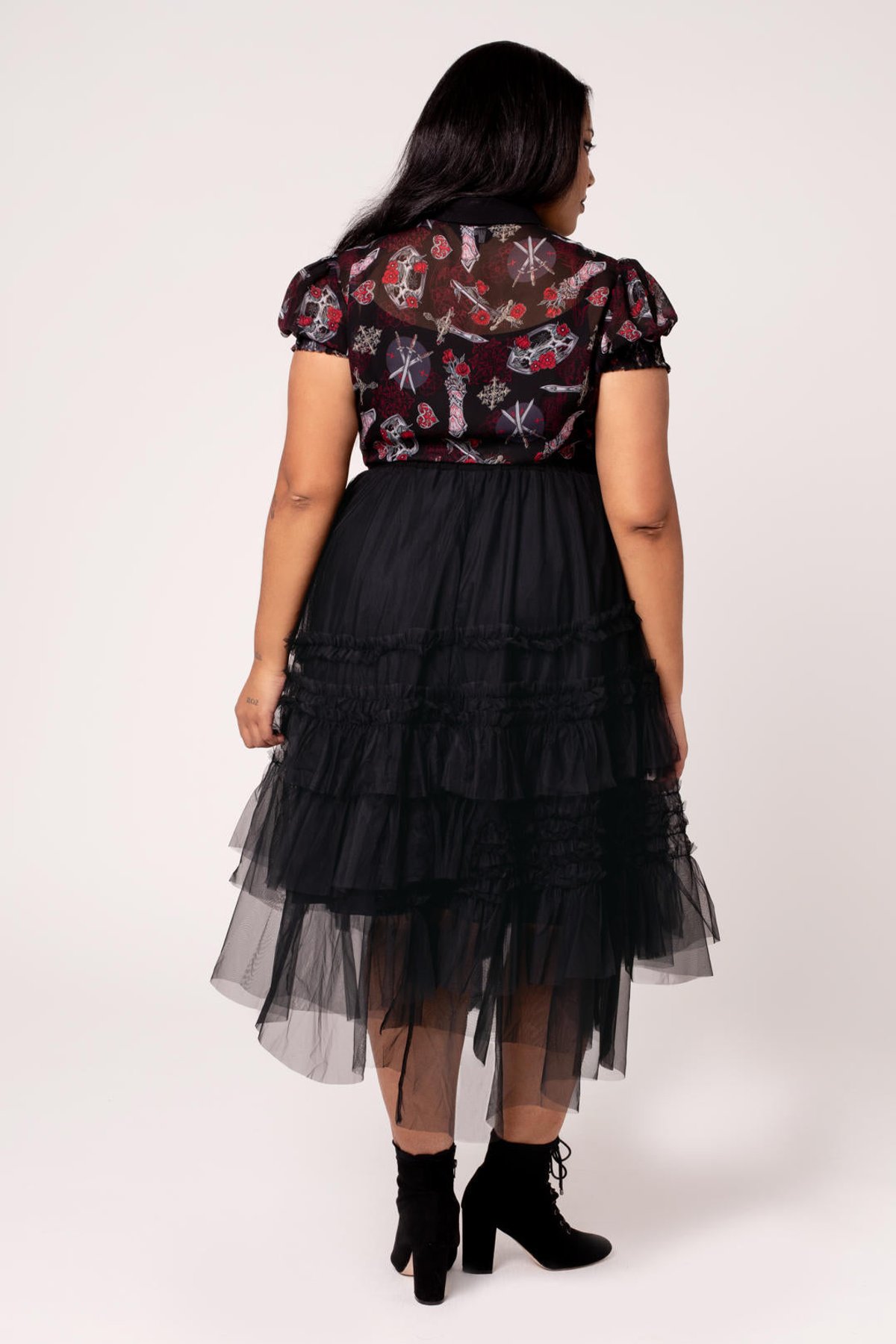 Steal the spotlight with the IVintage-Inspired Prudence Skirt – a seductive swirl of drama and gothic charm 🕸️. This black tulle masterpiece weaves its magic with asymmetrical ruffles and hems, creating ballet-like movement with every confident stride or moonlit twirl 🌙.