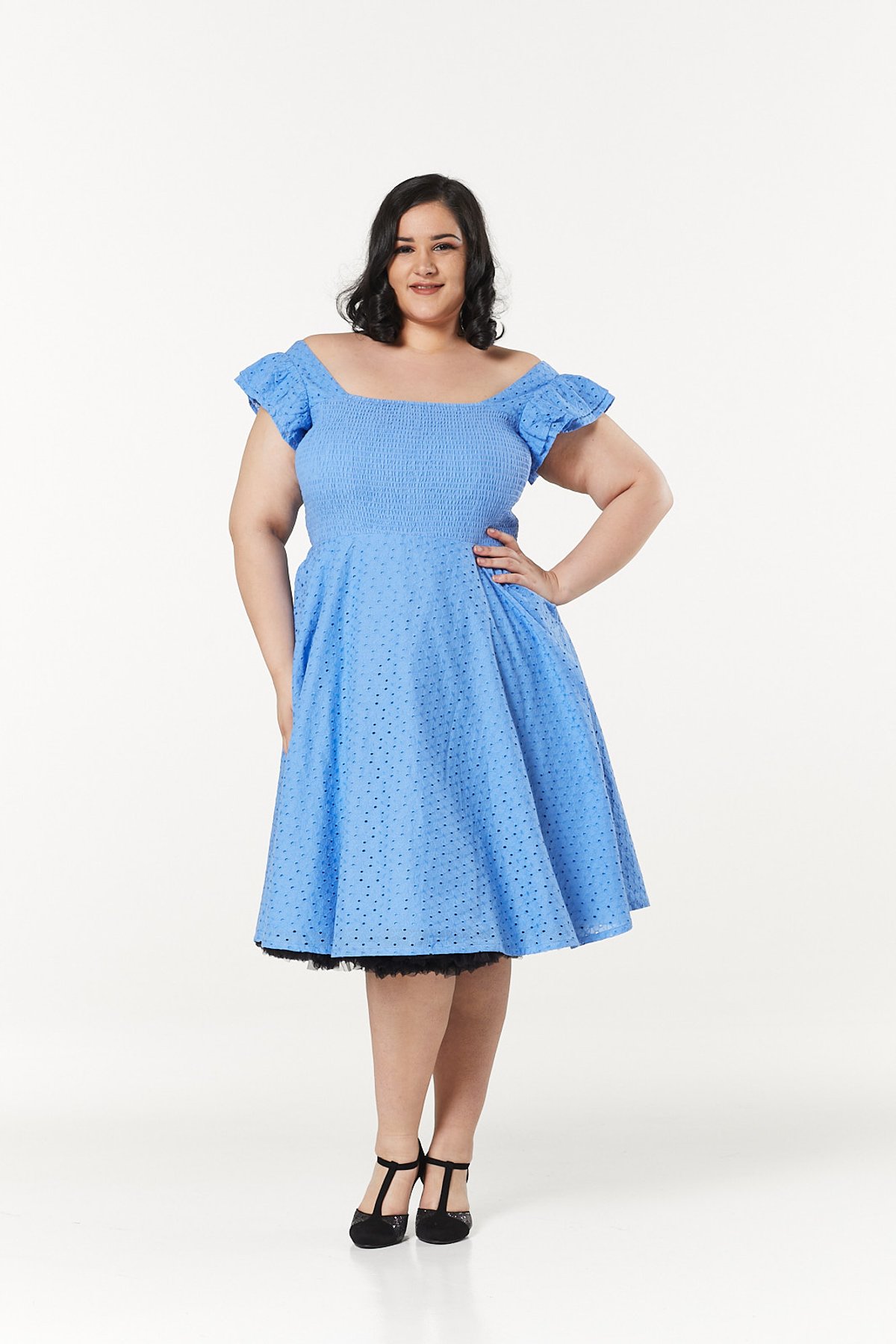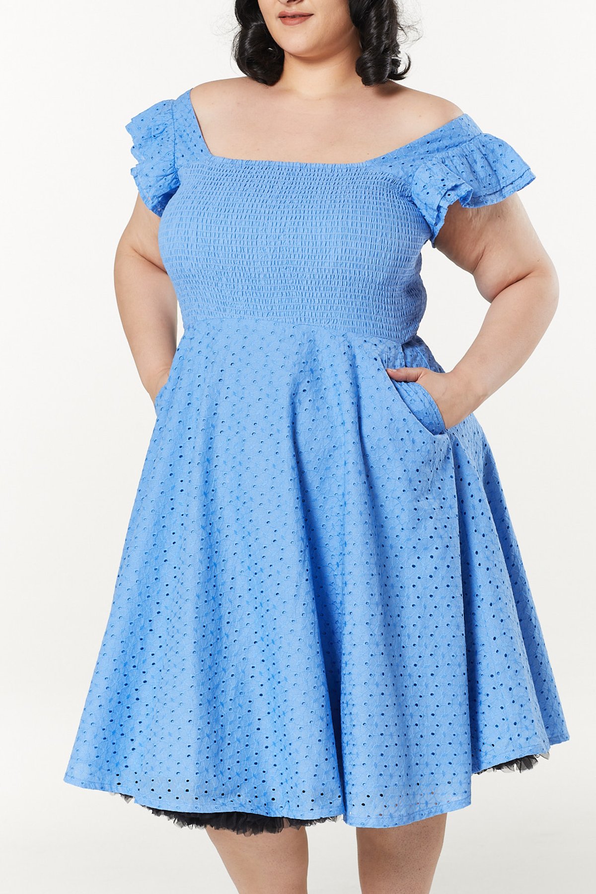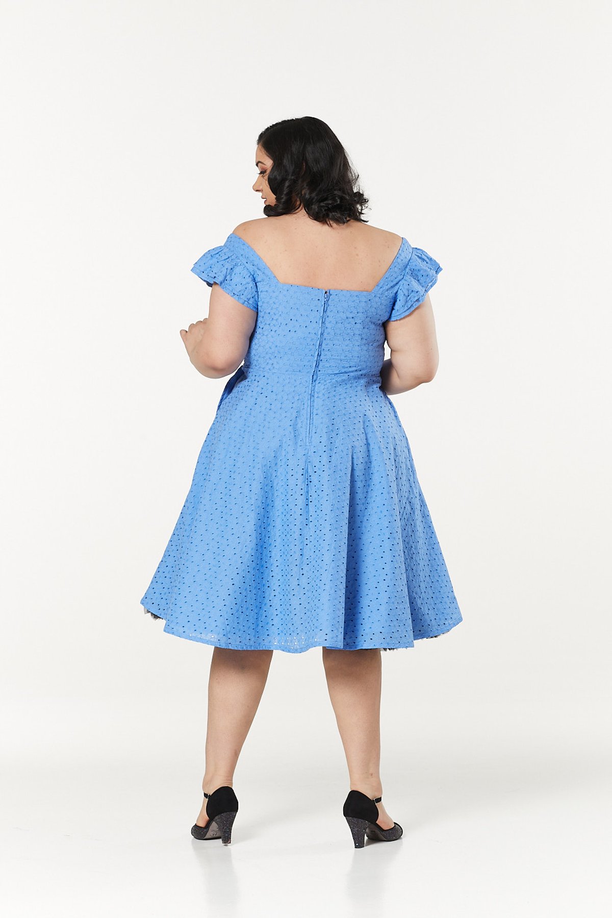 Unleash your inner vintage vixen with the Raphaella Blue Dress—a stunning ode to 1950s glamour. Crafted from delicate broderie Anglaise, this dress is a purrfect blend of charm and sophistication. Its eyelet design in a dreamy shade of blue invites you to twirl through your day with effortless allure. The puff sleeves add just the right touch of playful romance, while the fitted waist and flared skirt create a silhouette that’s simply claws-down gorgeous. Whether you're sashaying at a garden fête or enjoying a leisurely day out, this dress promises to make every moment feel like a scene from a vintage film.