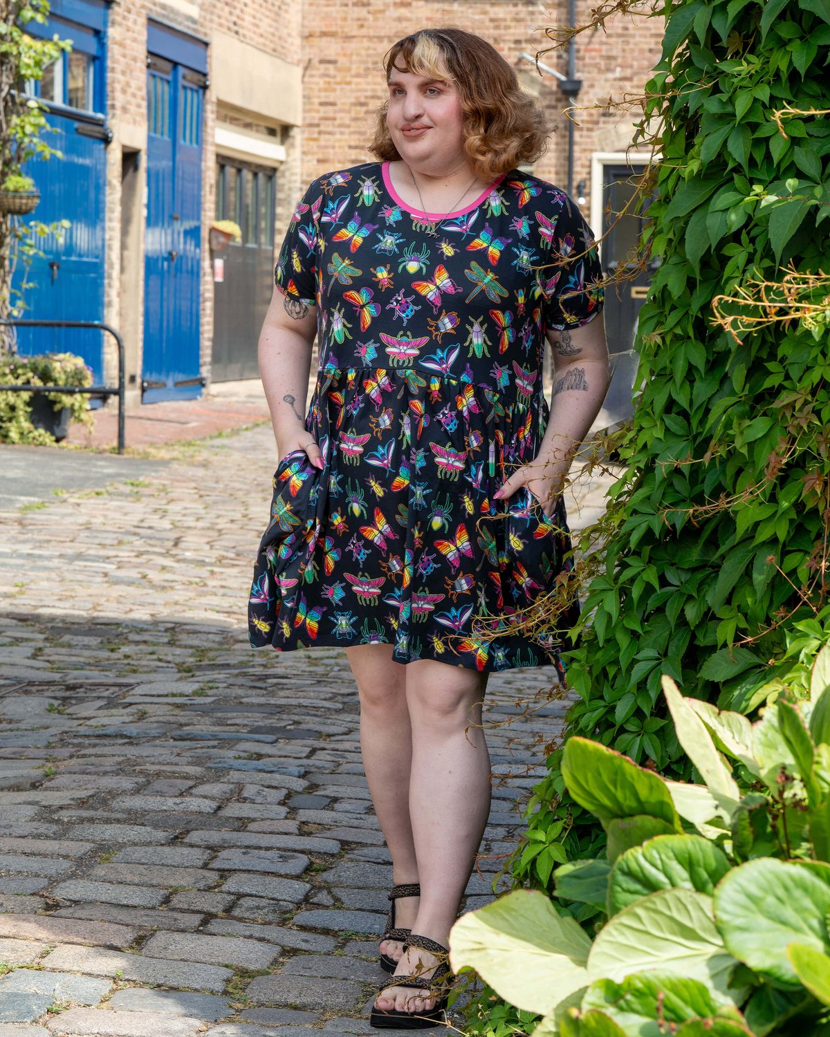 Unleash your playful side with the OUTLET Rebel Romance PRIDE Bugs Stretch Smock Dress — a fun-loving yet effortlessly chic piece that’s as comfy as it is eye-catching. With its bold bug print in vibrant pink and black, this dress invites you to spin, stomp, and sway with a style that’s as lively as your personality. The relaxed smock fit drapes with a carefree spirit, while the contrasting neckline adds just the right amount of polish. Made from a soft, stretchy blend, it’s your go-to for days when comfort and character are equally important. Plus, those handy side seam pockets are perfect for stashing little treasures as you strut your stuff.