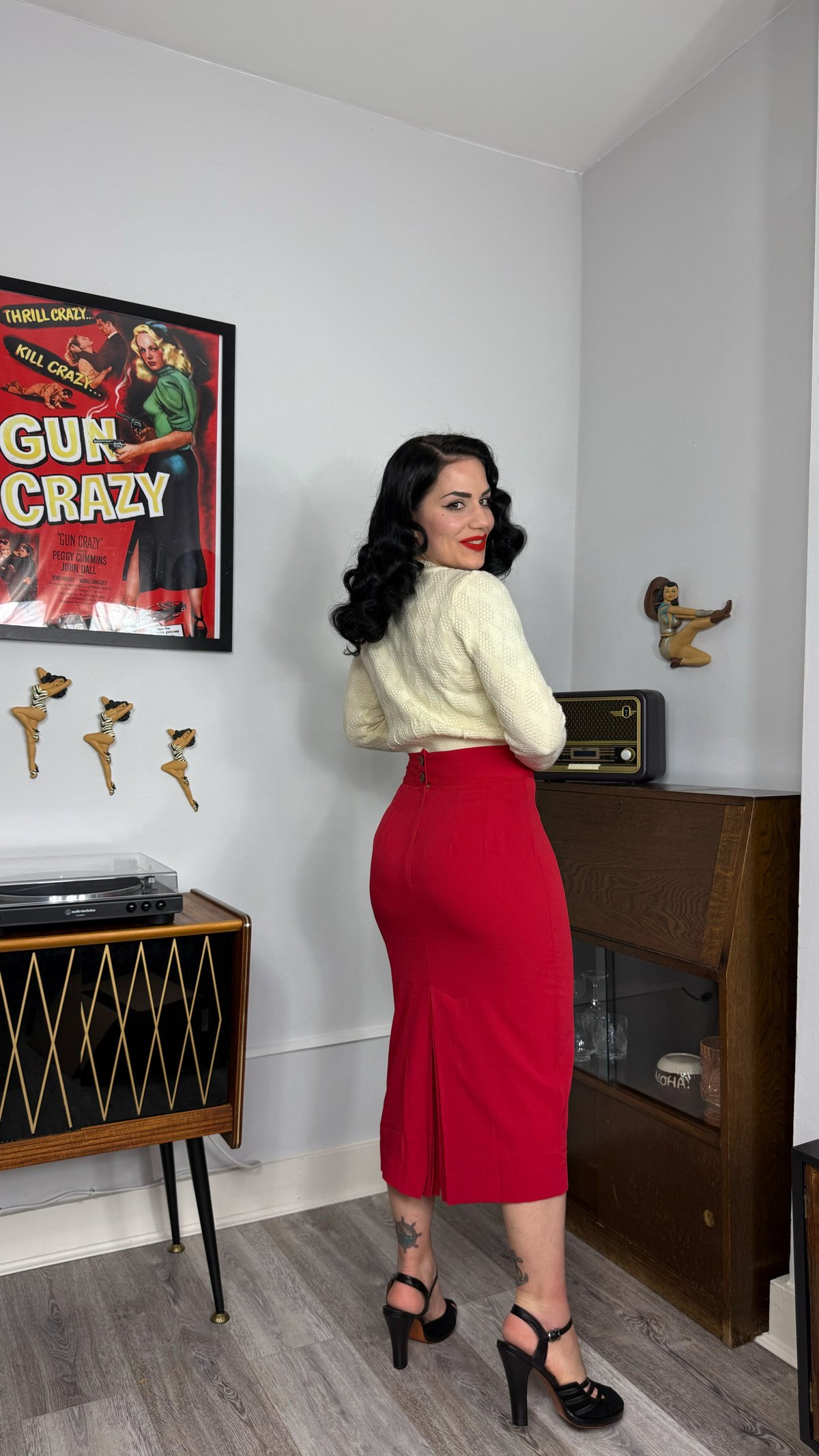 Unleash your inner star with The Jitterbug Pencil Skirt—where vintage charm meets modern sass. Crafted from luxuriously soft Polly Crepe, this fiery red number is designed to hug your curves with a purrfect fit, while the playful kick-pleat at the back adds just a dash of mischievous flair. Its timeless silhouette is elevated by a sleek, elegant cut that’s as versatile as it is eye-catching—ready to turn heads whether you're out dancing or commanding the boardroom. This skirt isn’t just a wardrobe staple; it’s a statement of feline finesse, oozing confidence and style in every step.