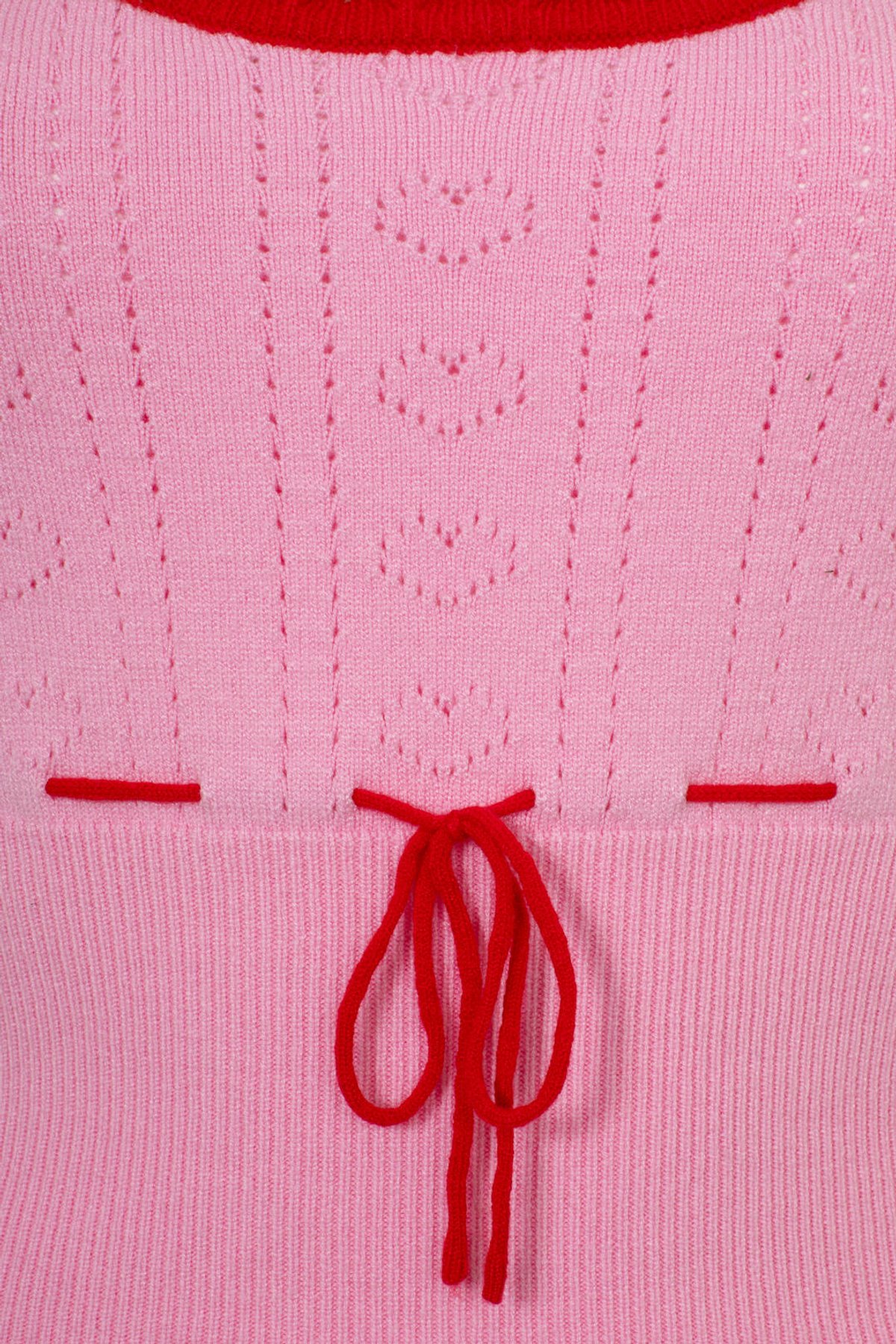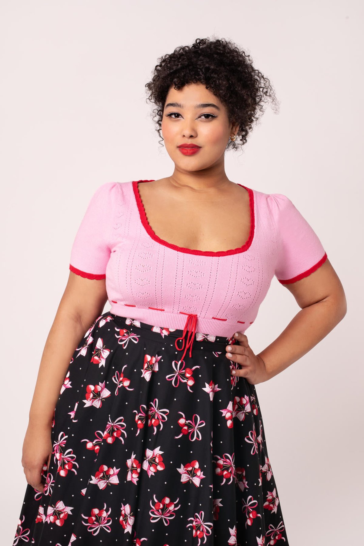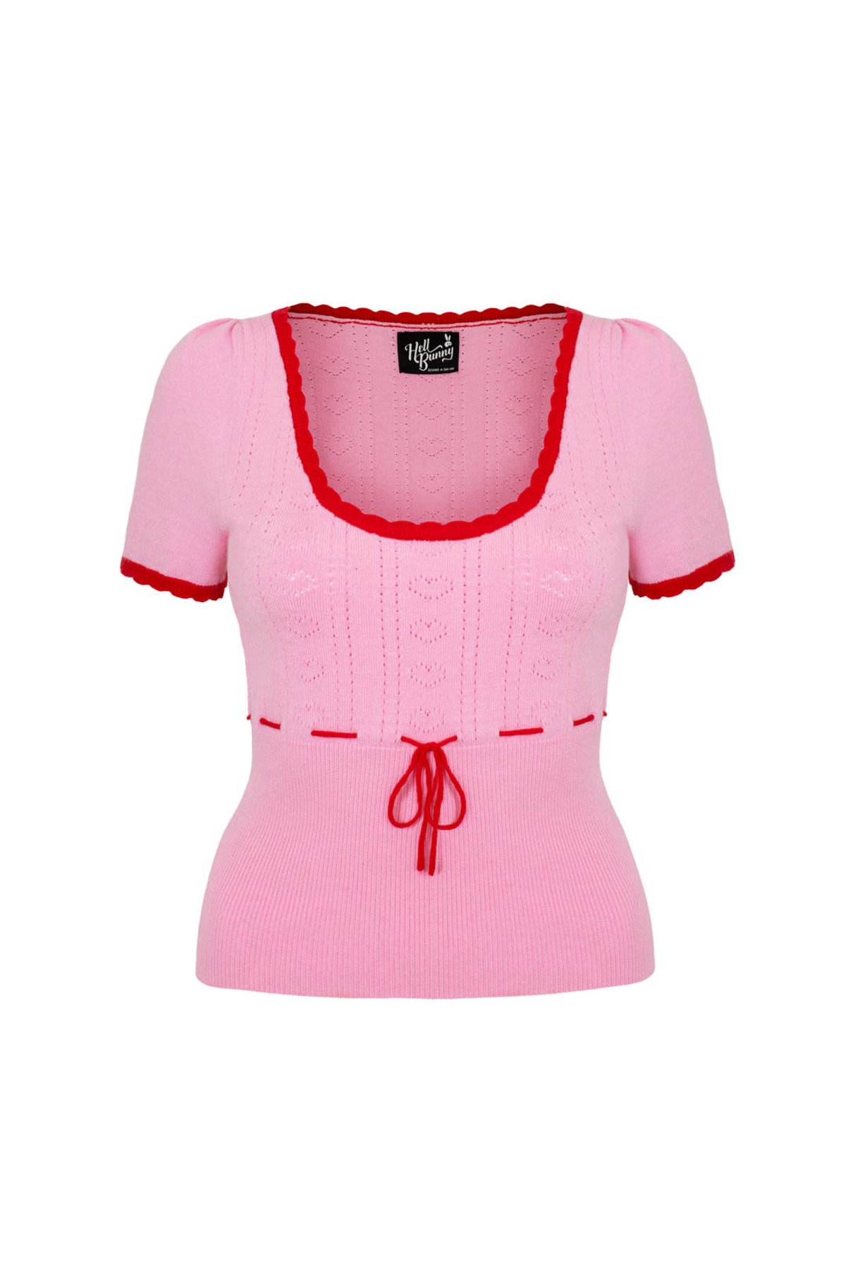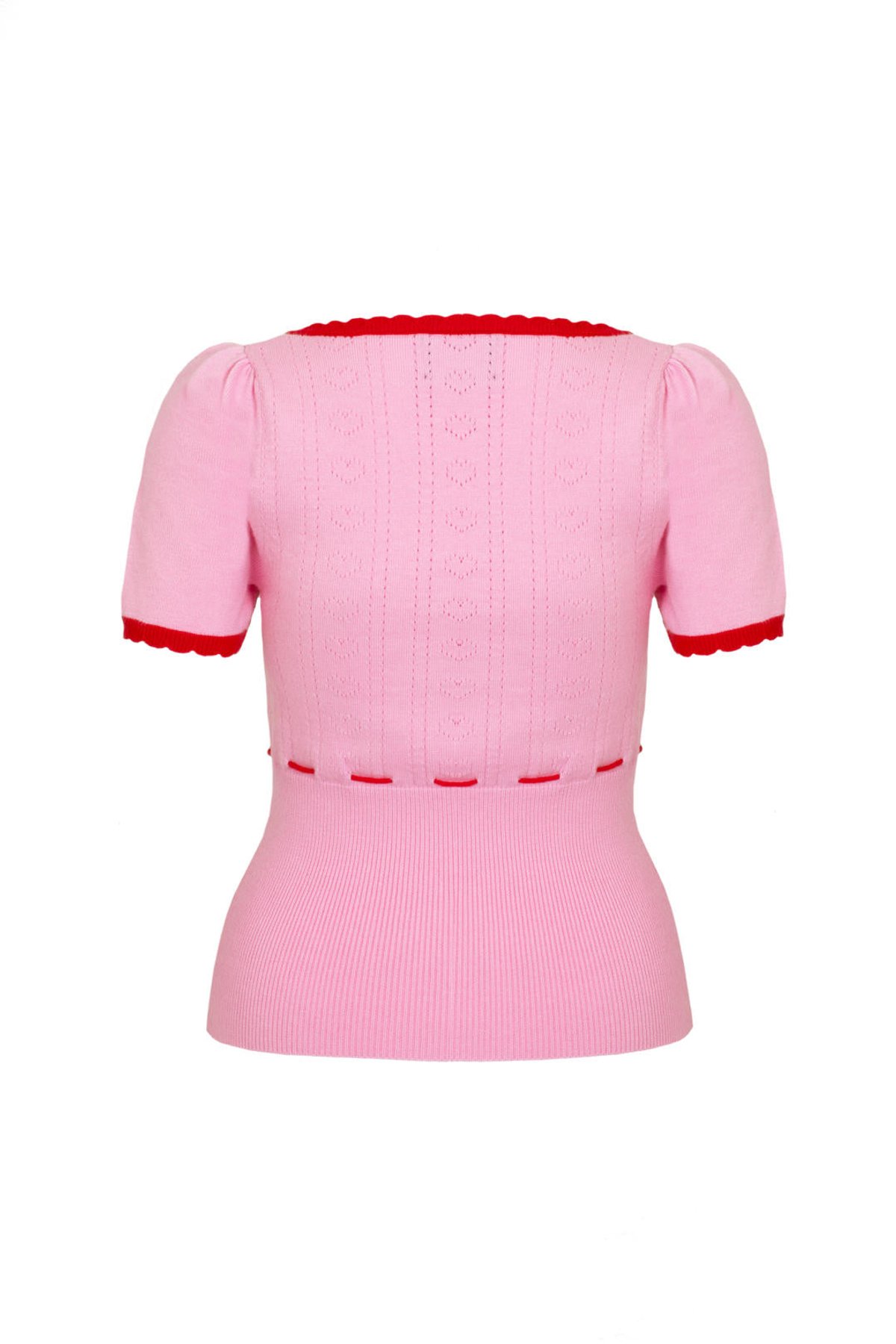 Unleash your inner vintage vixen with the Hannah Top—where playful hearts meet chic scallops in a flirty pink hue. Its retro knit charm, accented by red highlights and a sweet bow, makes every outfit a love story. Perfectly perched on short puff sleeves with a fitted rib design, this top is a purrfect blend of sass and comfort, designed to flatter every feline-inspired curve.