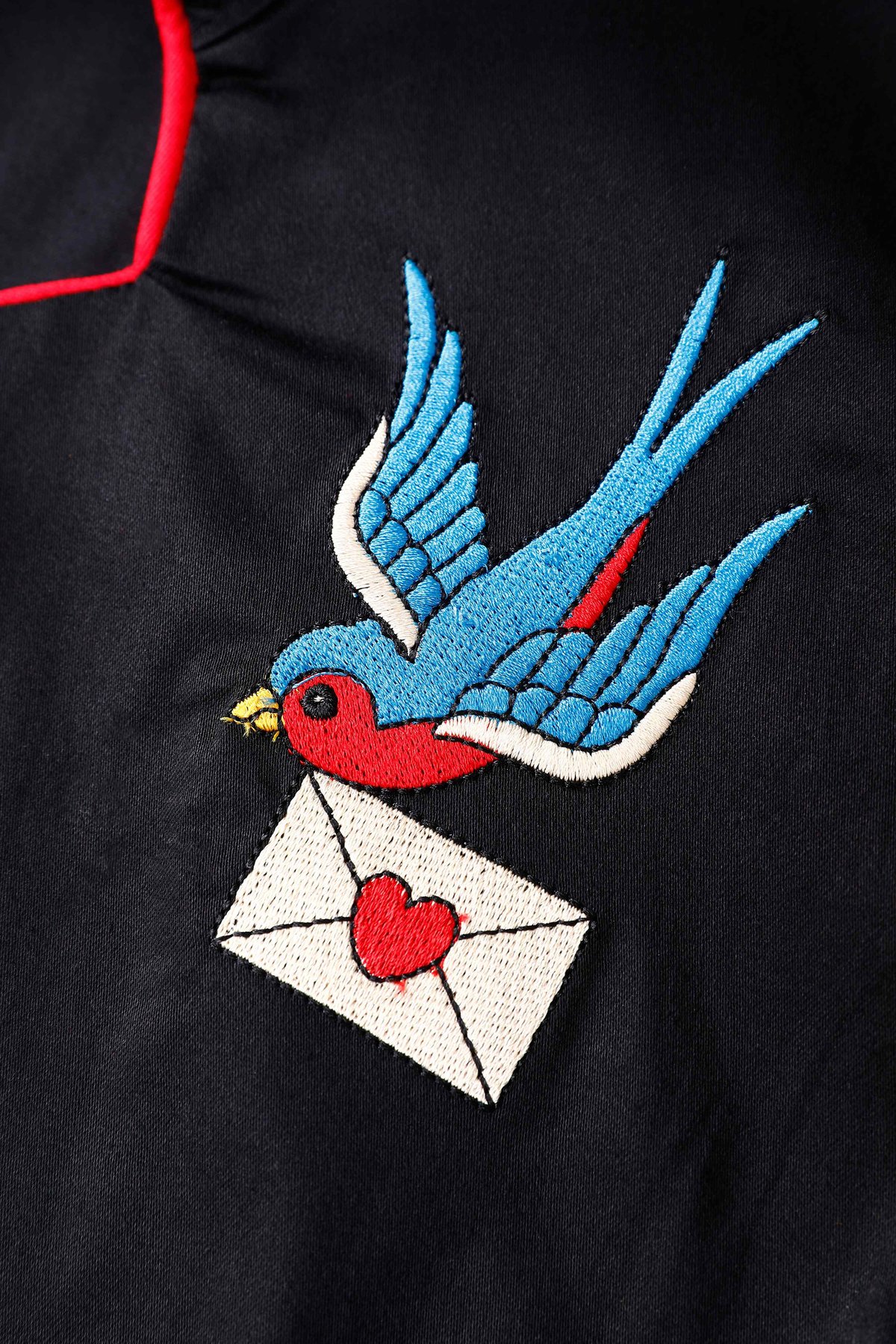 Unleash your inner siren with the Penelope II Swallow Love Letter Dress—where retro romance meets a splash of playful cheek. The embroidered swallows delivering love notes add a whimsical touch, while the bold red piping and matching belt elevate this vintage-inspired stunner. The front buttons bring just a hint of daring, and the comfortable blend of cotton and elastane makes it perfect for twirling through life’s sweetest moments. Whether you're channeling a 1950s rockabilly muse or simply craving a piece that’s both chic and fun, this dress calls for attention in all the right ways. It’s a true purrfect match for those who love a dash of vintage elegance with a mischievous twist.