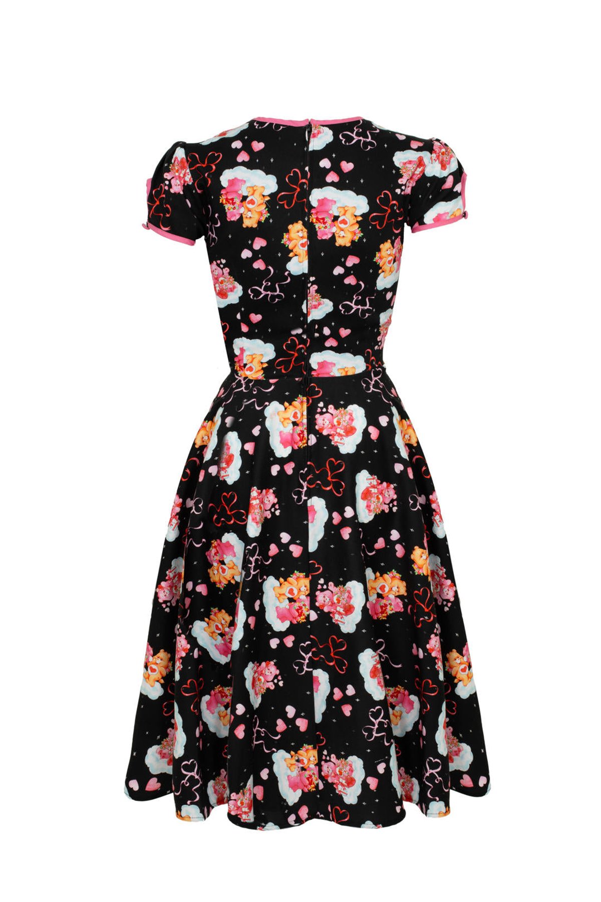 Unleash your inner vintage vixen with the Tenderheart Dress—a charming blend of 1950s retro flair and playful whimsy. Its sleek black base is sprinkled with adorable Love-a-Lot and Tenderheart Bears, frolicking amidst clouds, hearts, and bows, making it a purrfect choice for those who love a dash of nostalgia with a modern twist. The sweetheart neckline with bolero-style panels and a cheeky keyhole detail adds just the right amount of flirt, while contrasting pink piping gives it a lively pop of colour. Crafted from a stretch cotton blend, this dress is not only irresistibly cute but also offers all-day comfort, with pockets for those little essentials. The full circle skirt invites a twirl or two—because sometimes, you just gotta let your style spin.