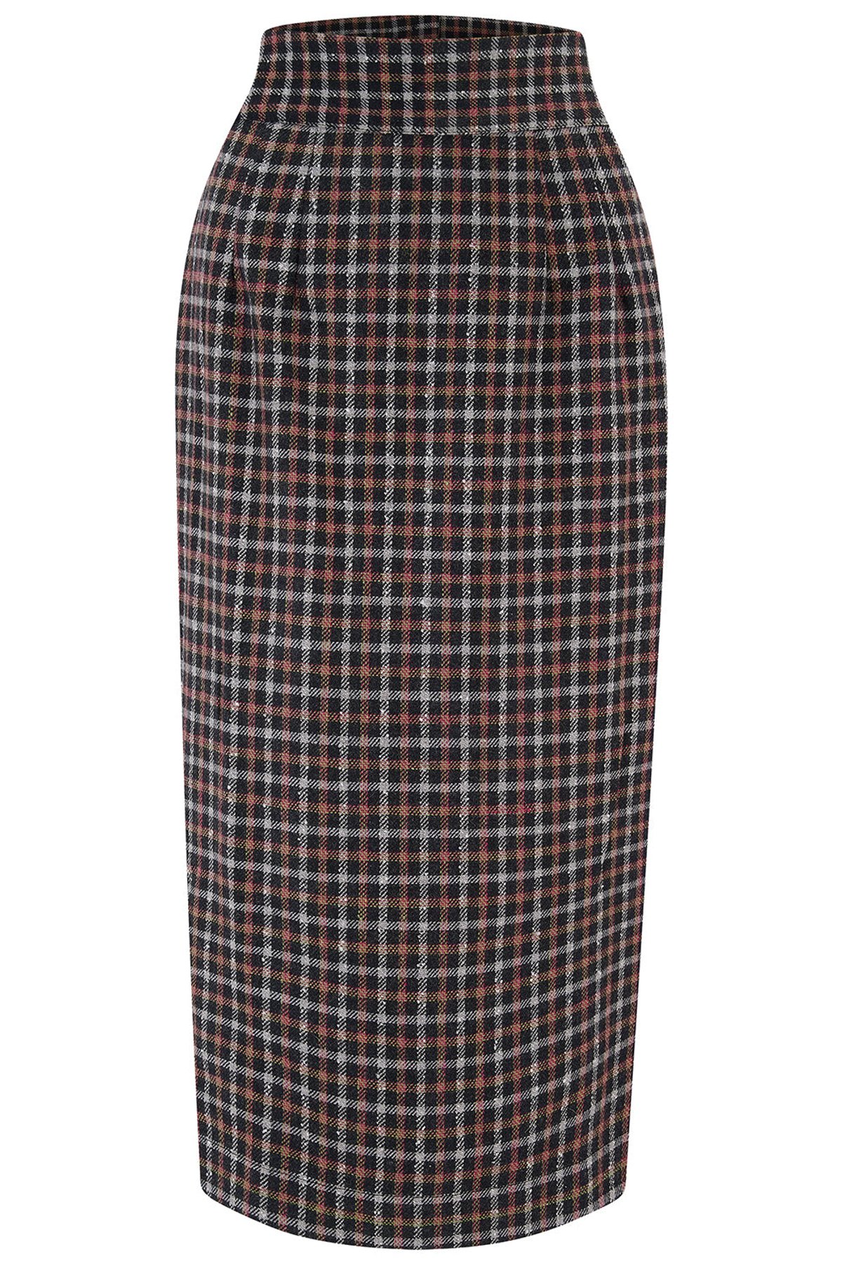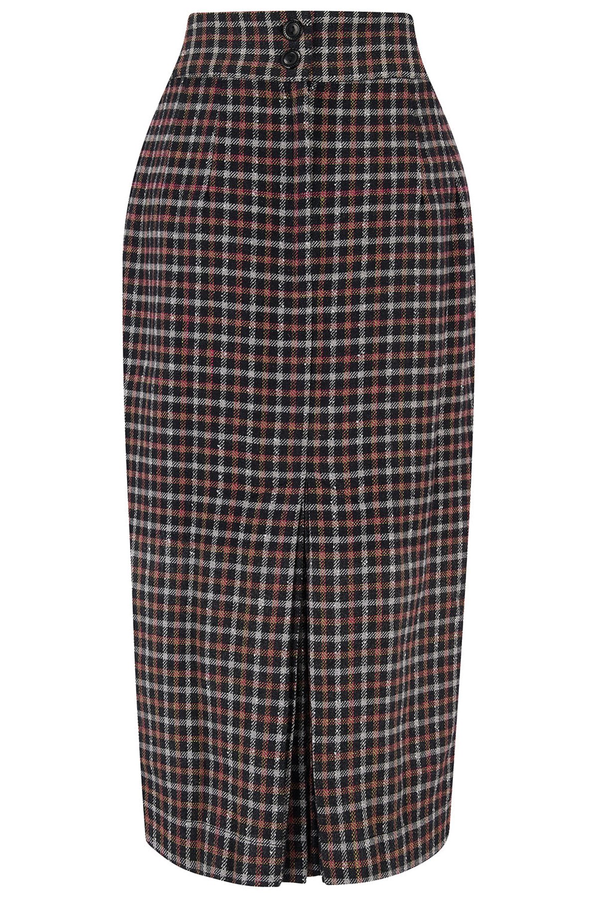 Unleash your inner vintage vixen with this purrfectly chic Jitterbug Pencil Skirt, crafted from sumptuous 100% wool in a striking black and red check pattern. Its tailored silhouette flatters every curve, while the playful kick-pleat at the back adds just the right amount of flirt. Whether you're feeling bold or simply looking to elevate your everyday style, this skirt effortlessly combines timeless elegance with a hint of mischievous charm. Its luxurious wool fabric promises cozy sophistication, making it a versatile staple for both workdays and weekend escapades. The soft cotton lining ensures all-day comfort, so you can sashays into any room with confidence and style.