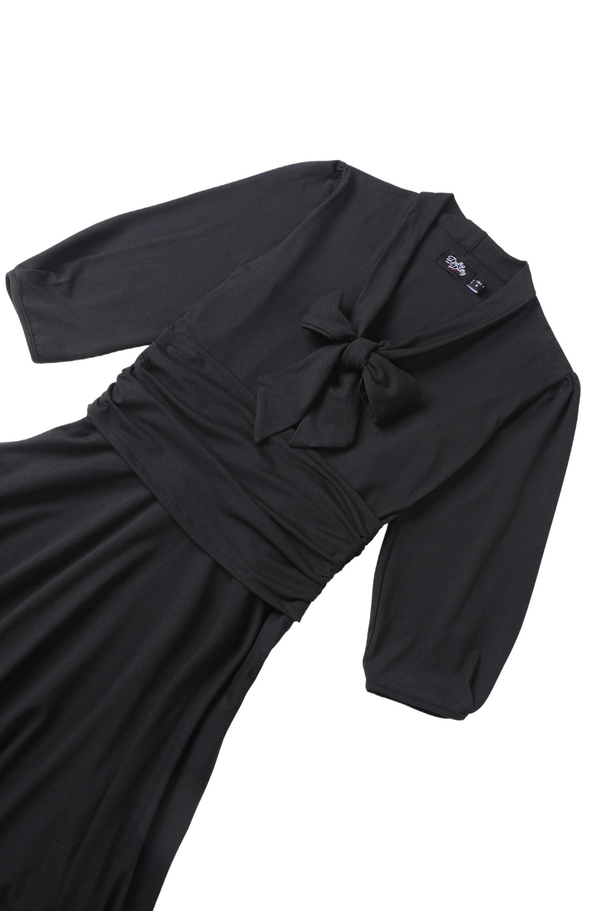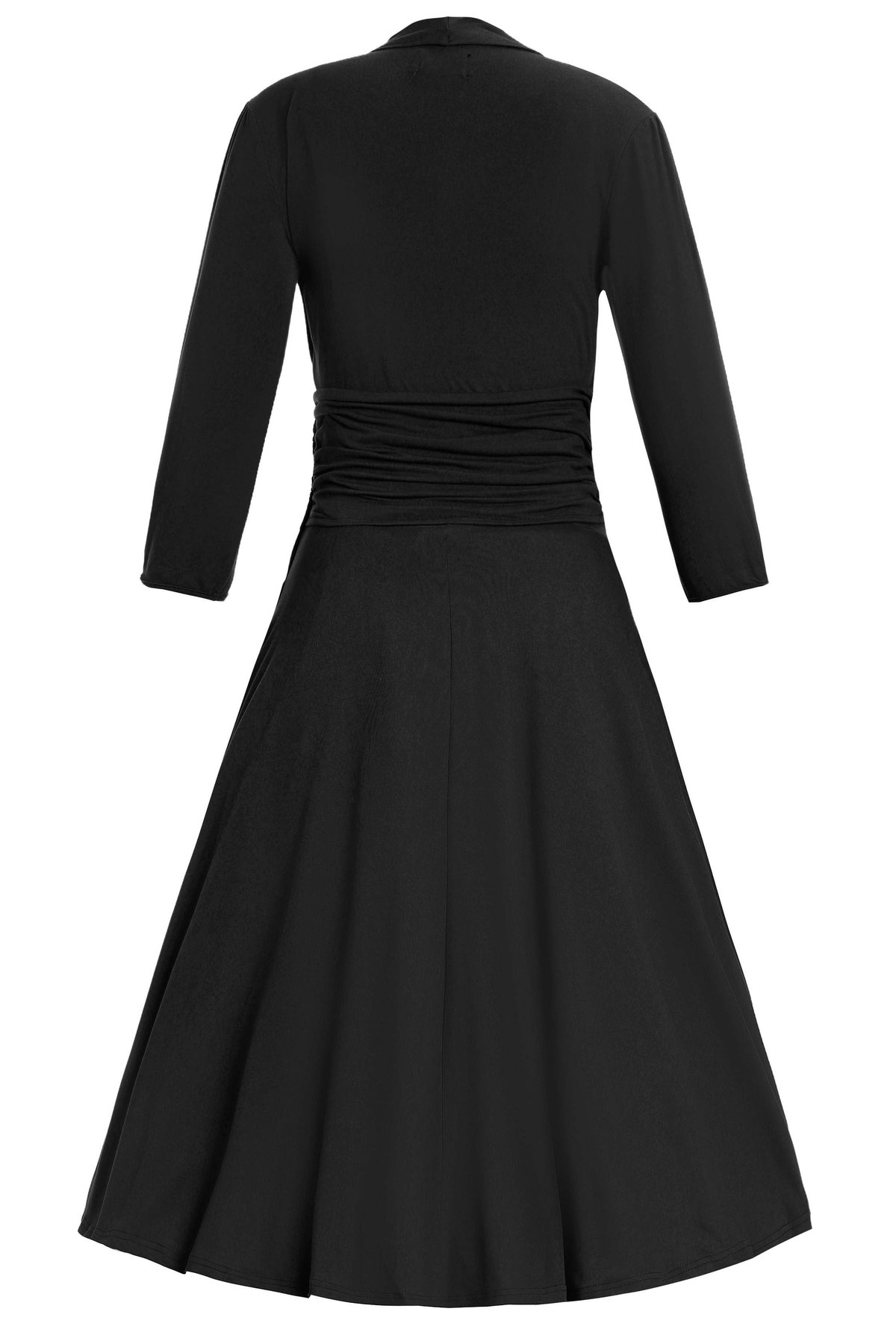 🎀 Discover timeless elegance with the Sandra Black Bow Tie Dress. A chic nod to vintage fashion, this swing dress will have you twirling in style and sophistication. Crafted from a soft knit fabric, the 👗 has a ruffled fitted bodice that flows into a flattering 💃 flared skirt. The high neckline features a playful bow tie, adding a hint of allure.