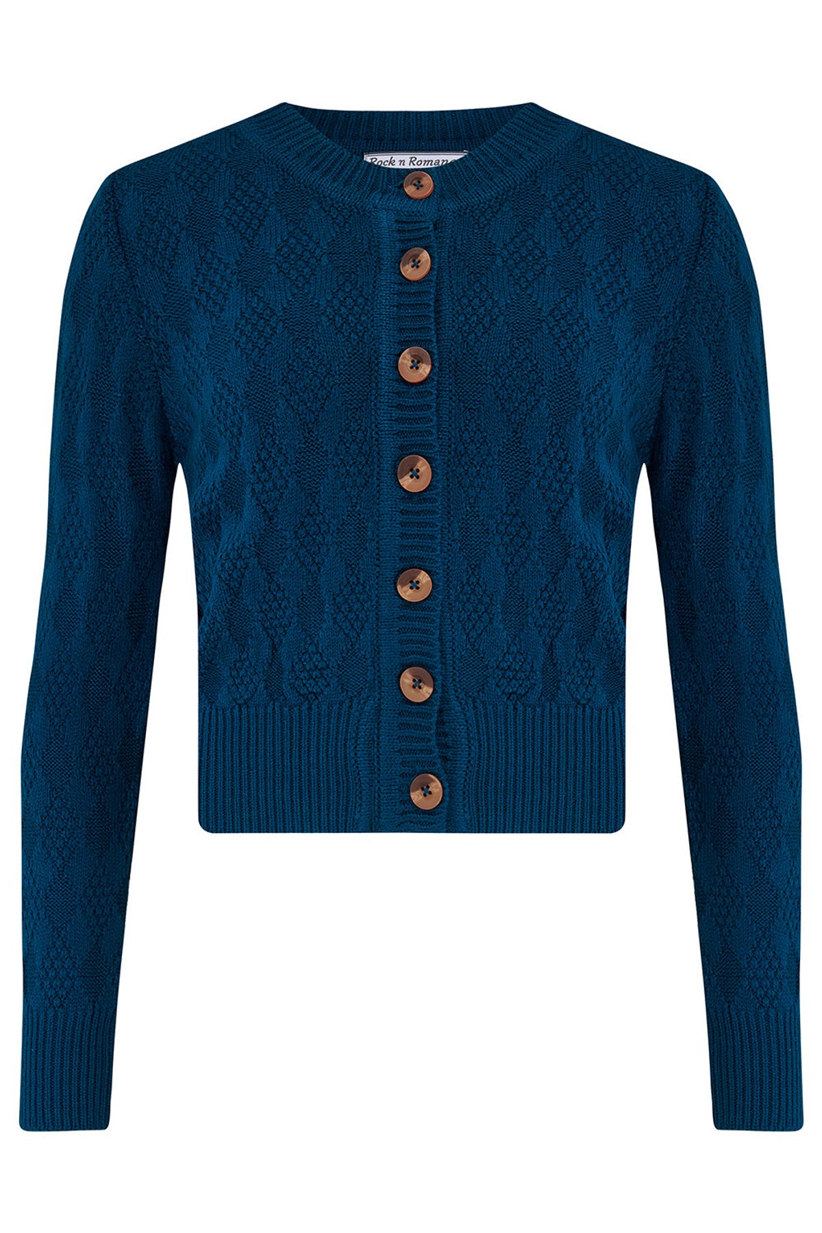 Unleash your inner vintage vixen with the Sandra Textured Diamond Knit Cardigan in peacock blue—where cozy meets captivating. Its rich texture and vibrant hue make it a true showstopper, perfect for layering over your favorite retro-inspired outfits. The vintage-style wooden buttons add just the right touch of nostalgia, making this piece as timeless as it is trendy. Whether you’re lounging with a good book or heading out for a casual day on the town, this cardigan’s irresistible charm will have you purring with pleasure.