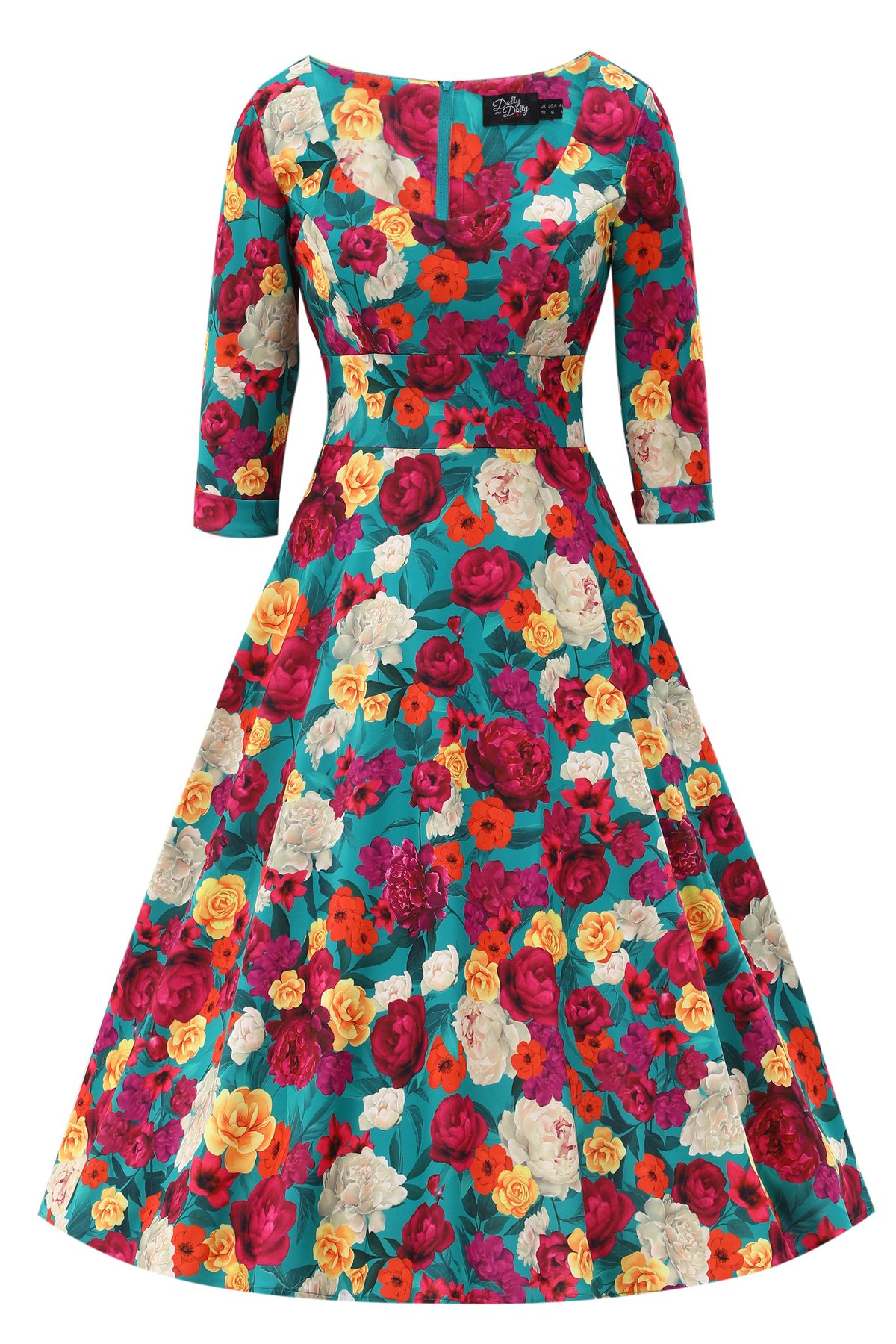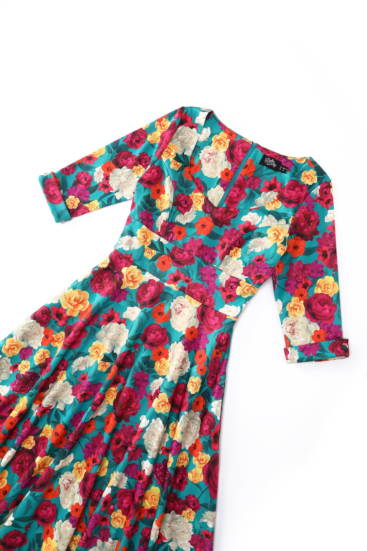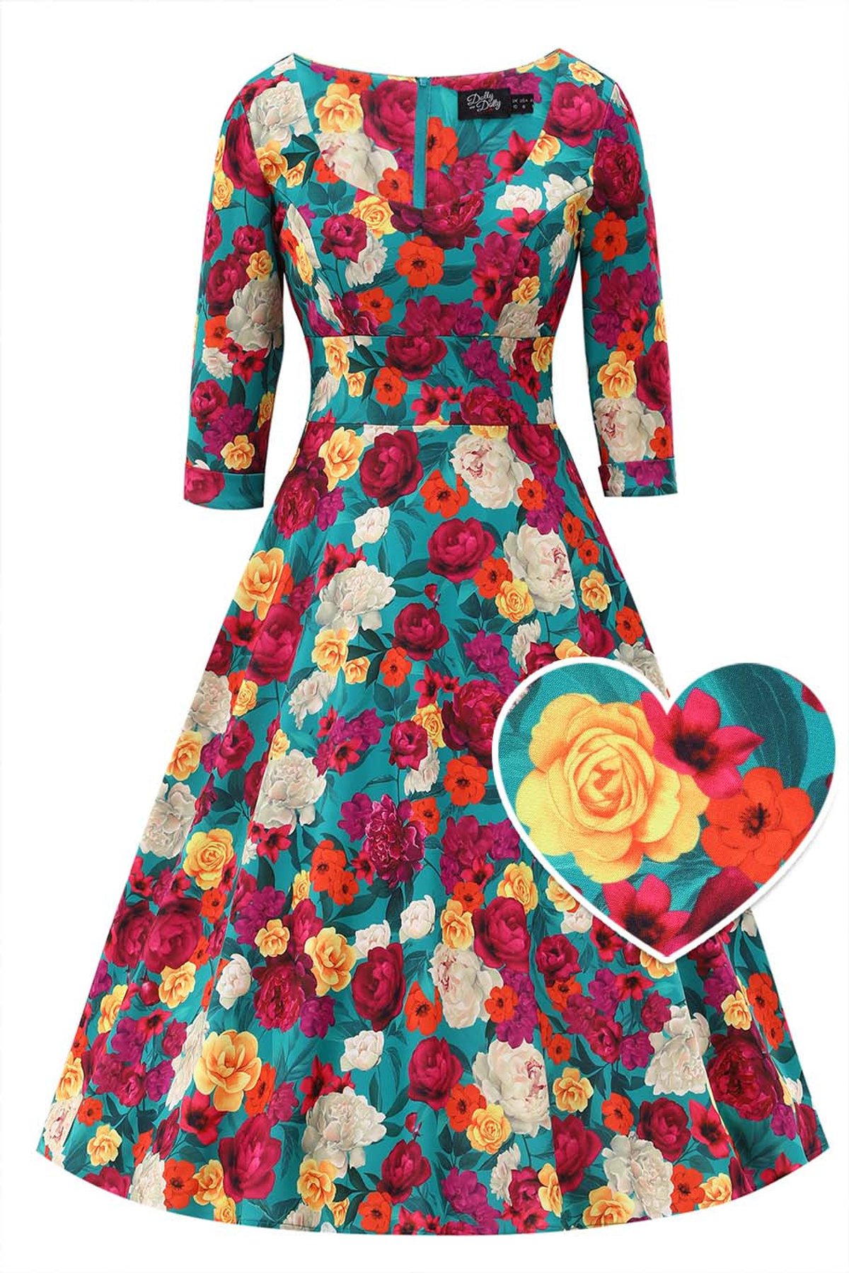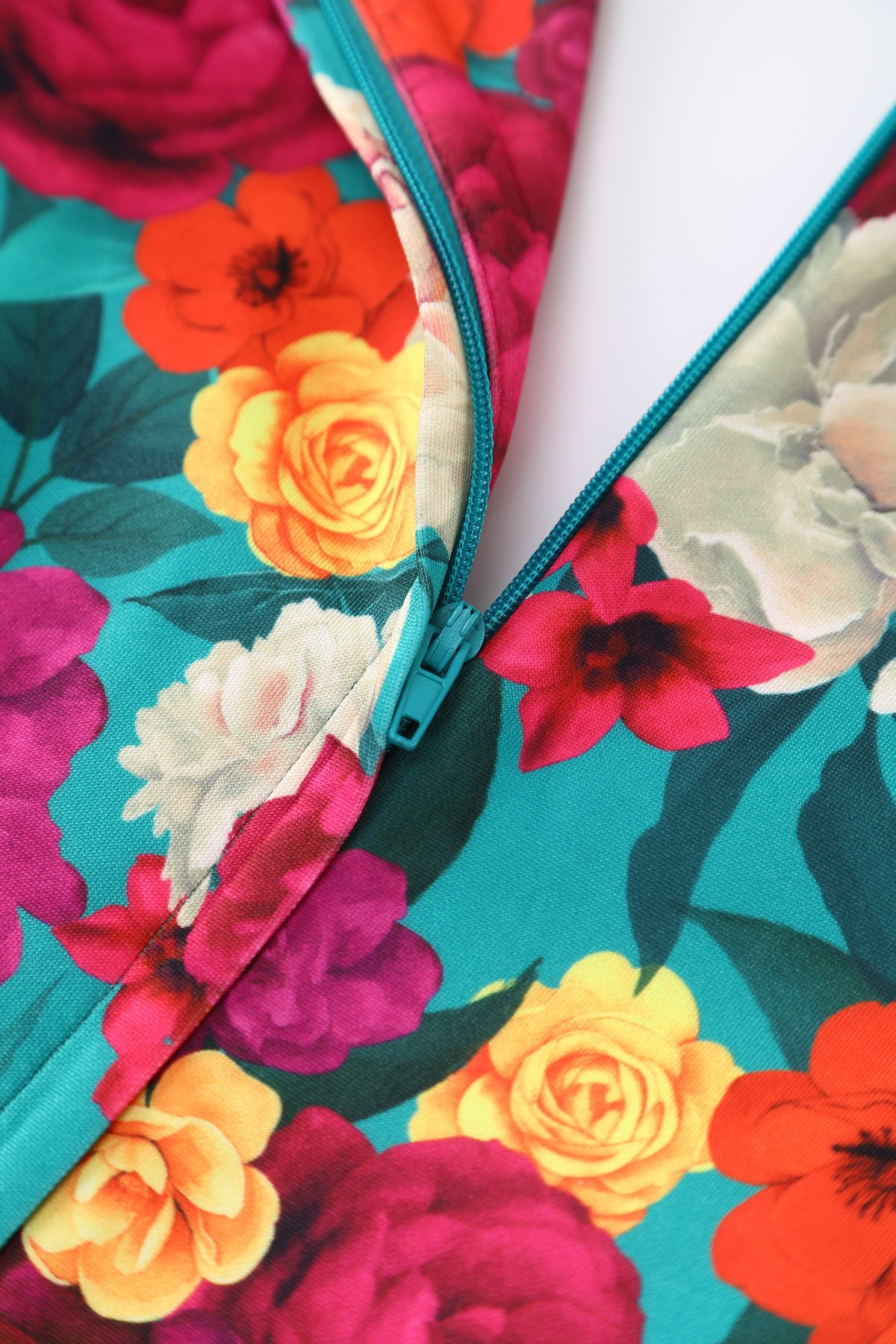 Unleash your inner vintage vixen with the Scarlette Green Garden Blossom Swing Dress—where playful florals meet timeless elegance. The vibrant teal backdrop is alive with lively blooms in fiery reds, sunny yellows, and warm oranges, all swaying like a garden in full bloom. Its classic swing silhouette, complemented by a fitted bodice and playful three-quarter sleeves, ensures you'll turn heads with every twirl. Crafted for comfort and style, the slight stretch lets you glide effortlessly from day to evening, while the cheerful print guarantees you’ll feel as fresh as a spring breeze.