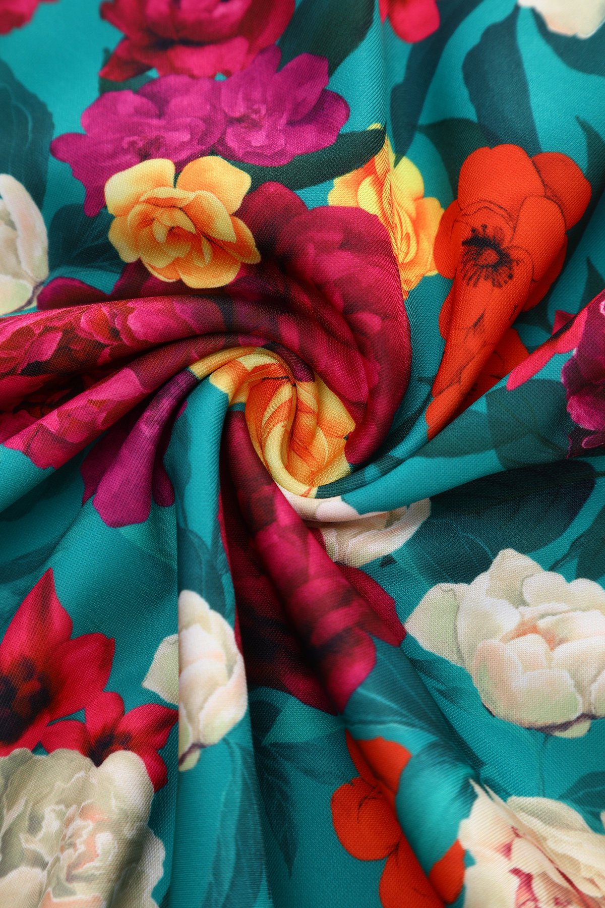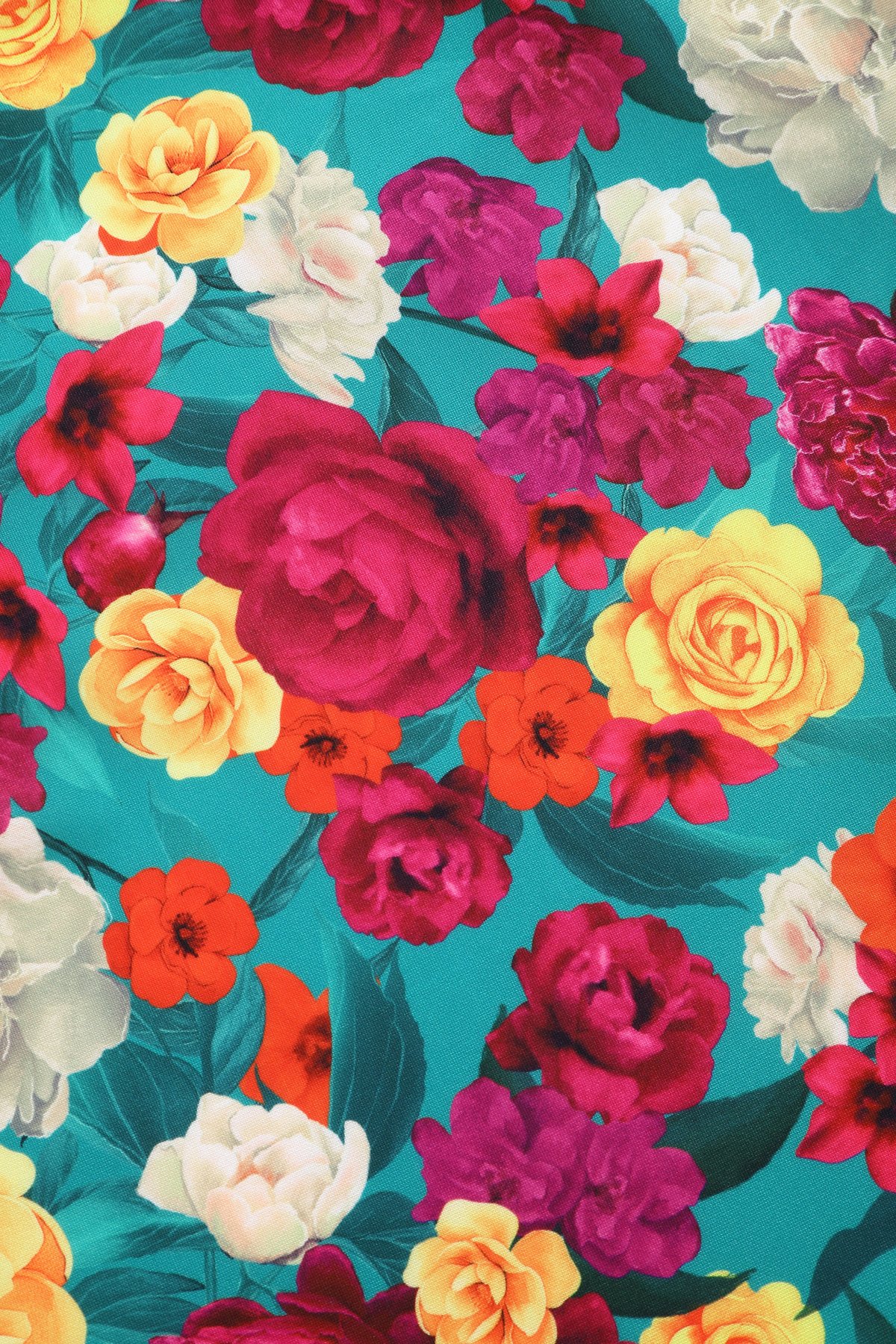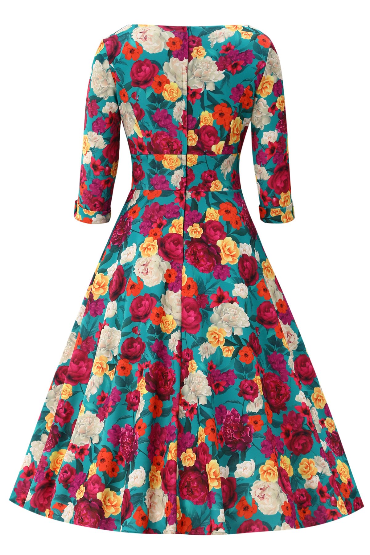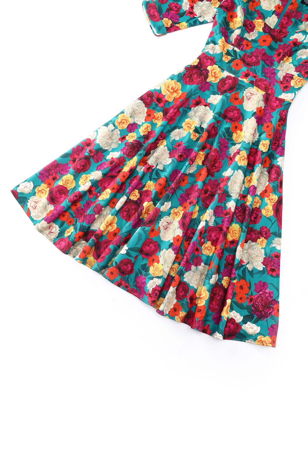 Unleash your inner vintage vixen with the Scarlette Green Garden Blossom Swing Dress—where playful florals meet timeless elegance. The vibrant teal backdrop is alive with lively blooms in fiery reds, sunny yellows, and warm oranges, all swaying like a garden in full bloom. Its classic swing silhouette, complemented by a fitted bodice and playful three-quarter sleeves, ensures you'll turn heads with every twirl. Crafted for comfort and style, the slight stretch lets you glide effortlessly from day to evening, while the cheerful print guarantees you’ll feel as fresh as a spring breeze.