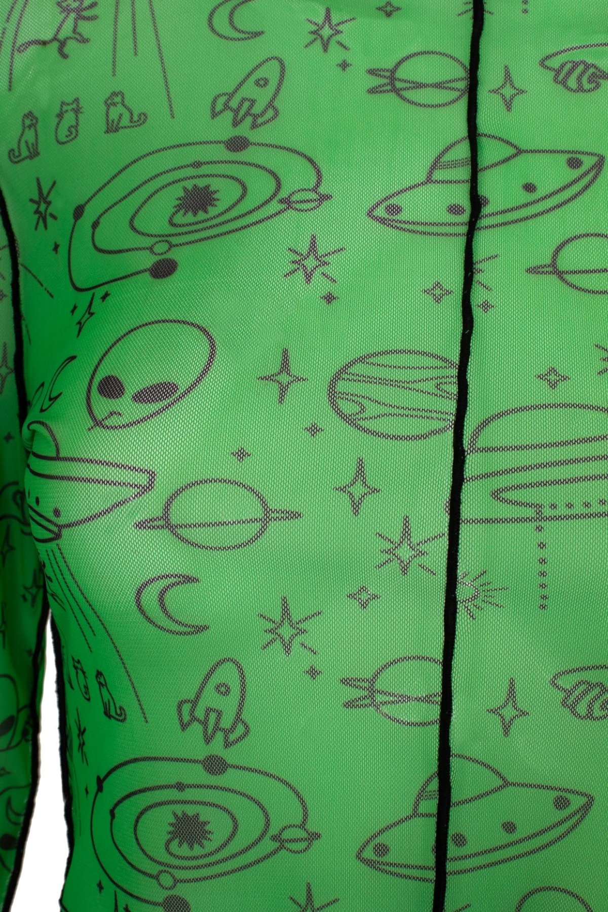 Introducing the Scully Top—a stellar blend of playful neon green and cosmic black doodles that’s out of this world! With its quirky alien and spaceship motifs, this top delivers a fun yet chic vibe that’s perfect for those who love to stand apart. The lettuce-edged cuffs and hem add a cheeky, flirty touch, while the stretch mesh fabric ensures a comfortable, figure-flattering fit. Whether you’re aiming for a casual day look or a night-time adventure, this piece is ready to launch your style to new galaxies.